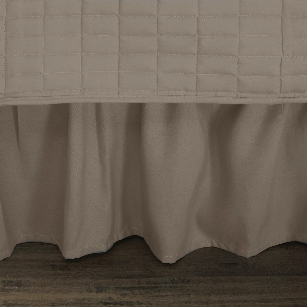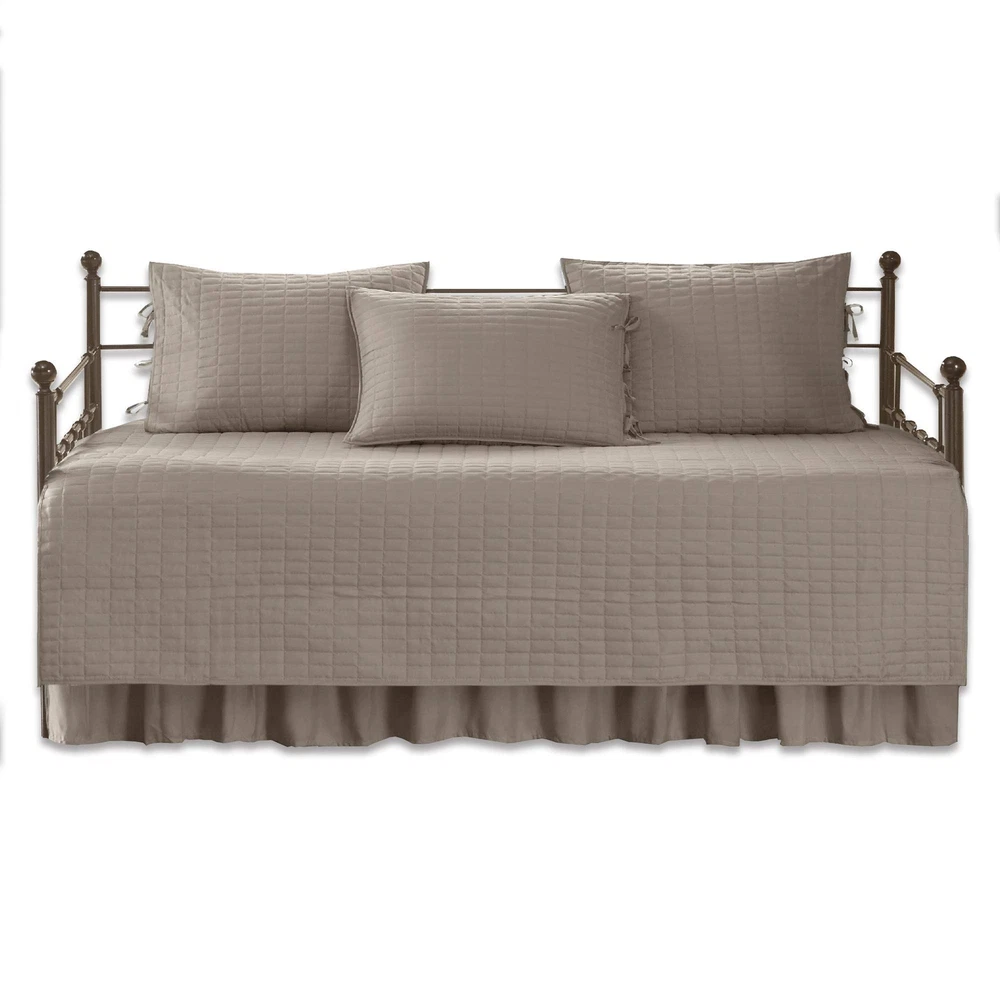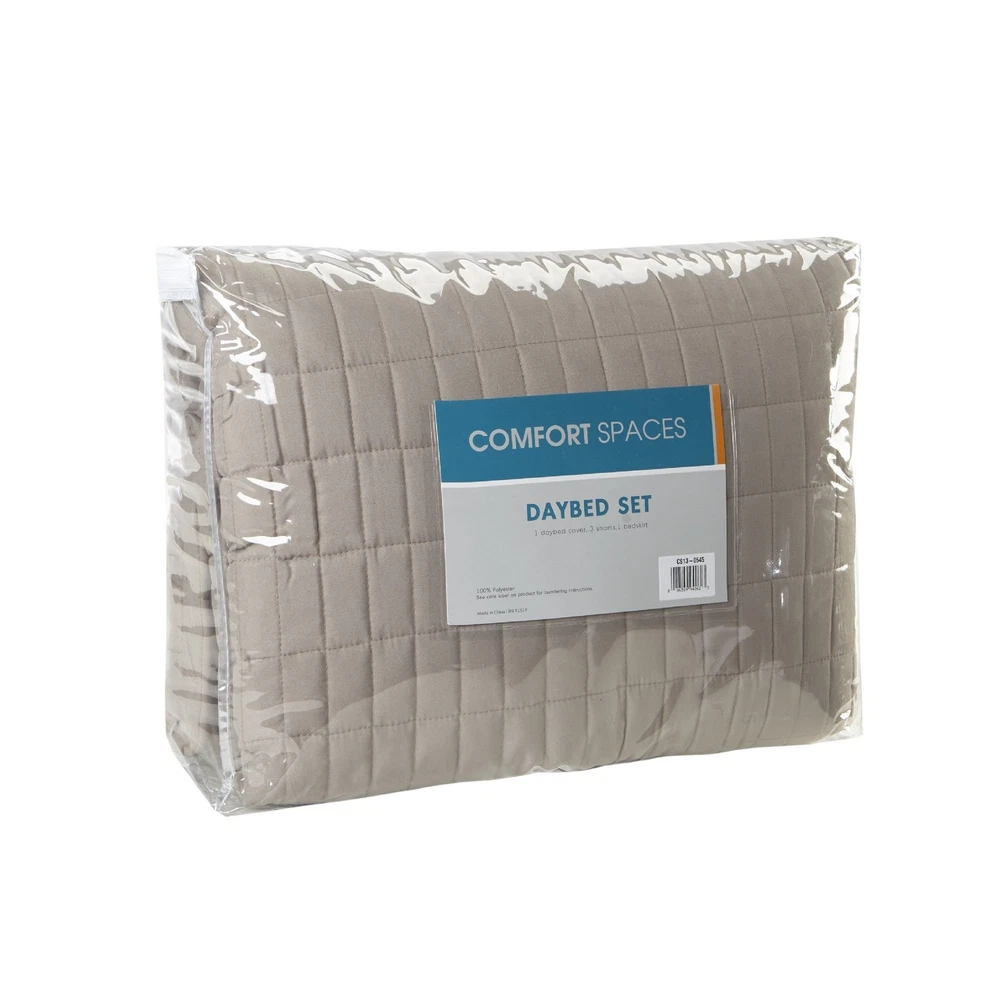 Comfort Spaces Daybed Cover - Luxe Double Sided-Quilting, All Season Cozy Bedding with Bedskirt, Matching Shams, Kienna Taupe 75"x39" 5 Piece Description Features: 100% Microfiber Create a simple yet chic look in your guest room with the Comfort Spaces Kienna 5 Piece Daybed Set. This daybed cover features a solid color on luxurious quilting design. Naturally breathable and lightweight fabric hypoallergenic filling for a perfect all season bedding. Set includes: 1 Daybed: 75"W x39"L, 3 Standard Shams: 20"W x 26"L + 0.5"D, 1 Bedskirt: 39"W x 75"L + 15"D Care instructions: Machine washable Product Details: Size: Daybed (75"x39") Included Components: 1 Daybed, 3 Standard Shams, 1 Bedskirt Color: Taupe Style: Daybed cover Brand: Comfort Spaces Product Care Instructions: Machine Wash Fabric Type: 100% Microfiber Material Type: Microfiber Global Trade Identification Number: 23 Number of Pieces: 5 Manufacturer: Comfort Spaces UPC: 086569942623 Included Components: 1 Daybed, 3 Standard Shams, 1 Bedskirt Brand Name: Comfort Spaces Pattern: Solid Seasons: All Style Name: Daybed cover Theme: Love Color: Taupe Size: Daybed (75"x39") Shipping Free fast shipping Return Policy All items qualify for returns within 30 days of receipt.