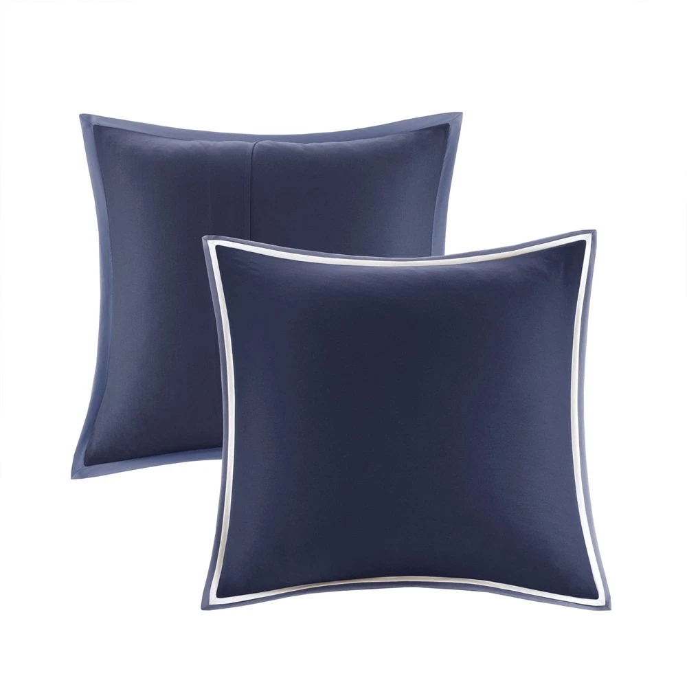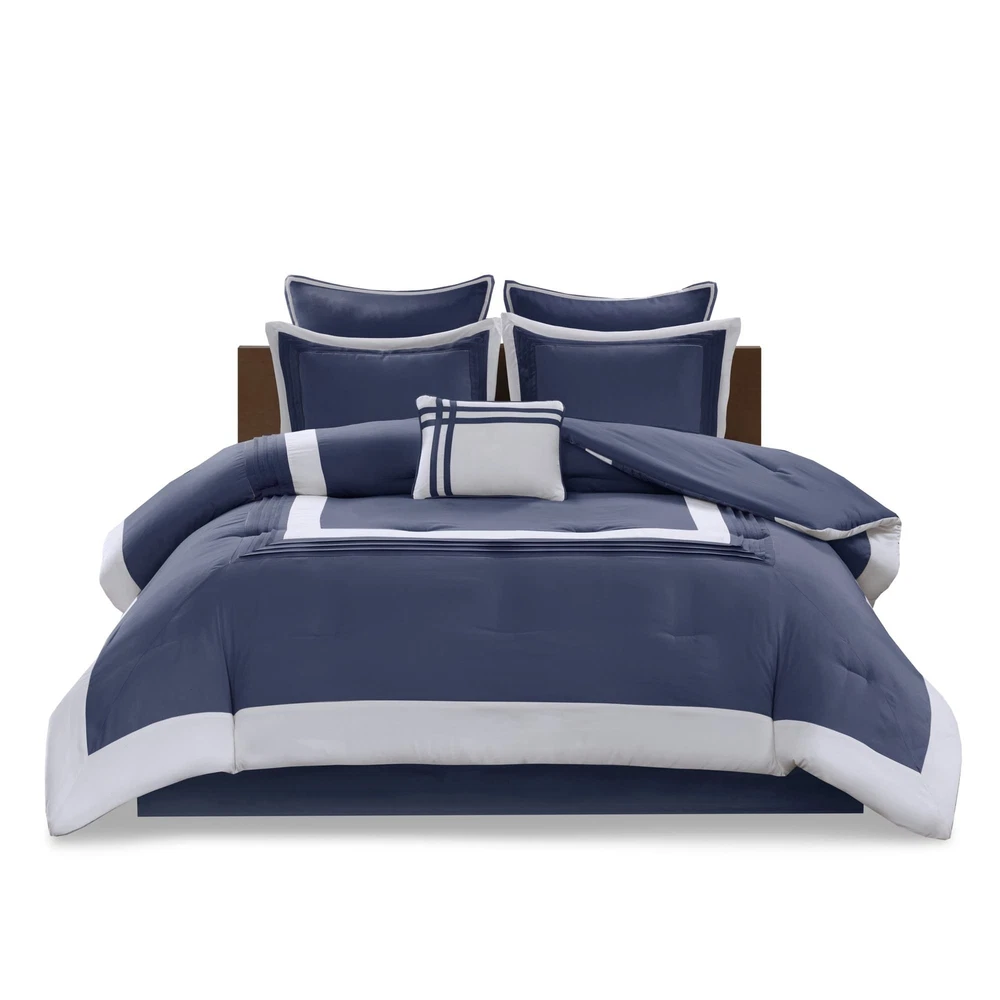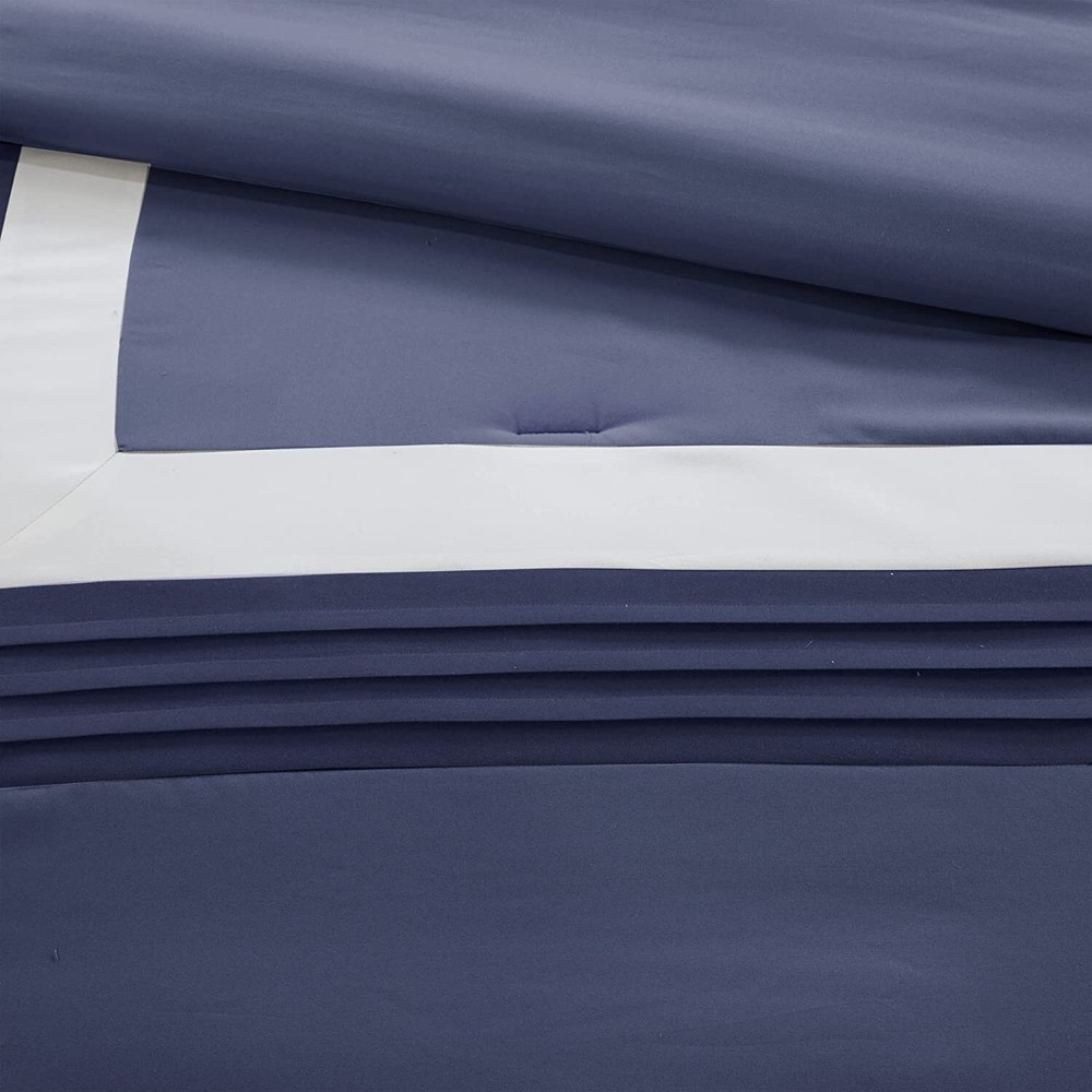 Comfort Spaces Malcom Cozy Comforter Set - Modern Trendy Design, All Season Down Alternative Bedding, Matching Shams, Hotel Deluxe Navy, Queen ✓ Free 60 Day Returns ✓ Free Express Shipping Description: Bring home a 5 stars hotel bedroom décor into your own bedroom with our luxurious borders design comforter set from Malcom collection. The comforter features a soft microfiber with sophisticated pleating fabrication technique for a luxurious touch. Microfiber fabric is a really soft fabric that is naturally wrinkle and shrinkage resistant to bring you all season comfort for the years to come. Available in 2 sizes Queen and King and conveniently machine washable. Features: 100% Microfiber Bring home a 5 stars hotel bedroom decor into your own bedroom with our luxurious borders design comforter set from Malcom collection Featuring a soft microfiber with sophisticated pleating fabrication technique for a luxurious touch. Microfiber fabric is a really soft fabric that is naturally wrinkle and shrinkage resistant. Set Includes: 1 Comforter: 90"W x 90"L, 2 Standard Shams: 20"W x 26"L plus 2"D, 2 Euro Shams: 26"W x 26"L plus 1"D, 1 Bed Skirt: 60"W x 80"L plus 15"D, 1 Decorative Pillow: 12"W x 16"L Care instructions: Machine wash, gentle cycle and separately. Spot clean decorative pillows. Do not bleach. Tumble dry low, remove promptly. Do not iron. If there is no free movement in the washer or dryer, use large capacity commercial washer/dryer. Product Details: Size: Queen Included Components: 1 Comforter, 2 Standard Shams, 1 Decorative Pillow, 1 Bed Skirt, 2 Euro Shams Color: Hotel Deluxe Navy Style: Malcom, Hotel Deluxe Gray Brand: Comfort Spaces Size: Queen Included Components: 1 Comforter, 2 Standard Shams, 1 Decorative Pillow, 1 Bed Skirt, 2 Euro Shams Color: Hotel Deluxe Navy Style: Malcom, Hotel Deluxe Gray Brand: Comfort Spaces Pattern: Pieced Material: Microfiber Fabric Type: 100% Microfiber Number of Pieces: 7 Seasons: All Product Care Instructions: Machine Wash, Spot Clean pillow Manufacturer: E&E Co. Ltd DBA JLA Home UPC: 086569782113 Product Dimensions: 90 x 90 x 1.5 inches Item Weight: 6.61 pounds Country of Origin: China Item model number: CS10-1518 Refill: fiber Assembly required: No Batteries required: No