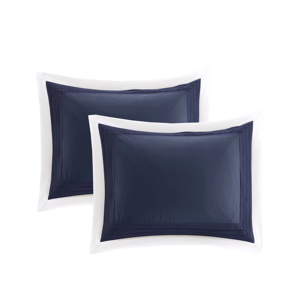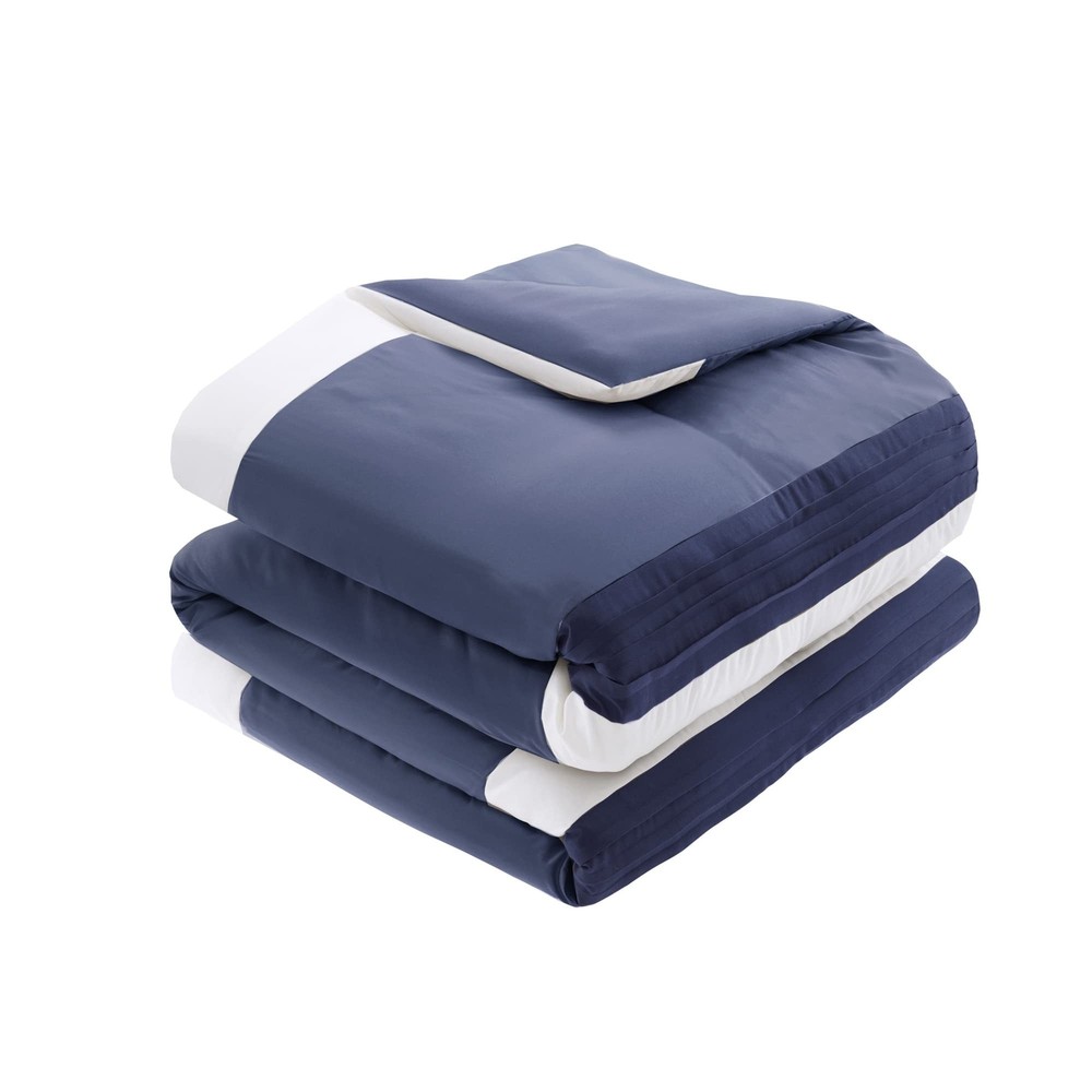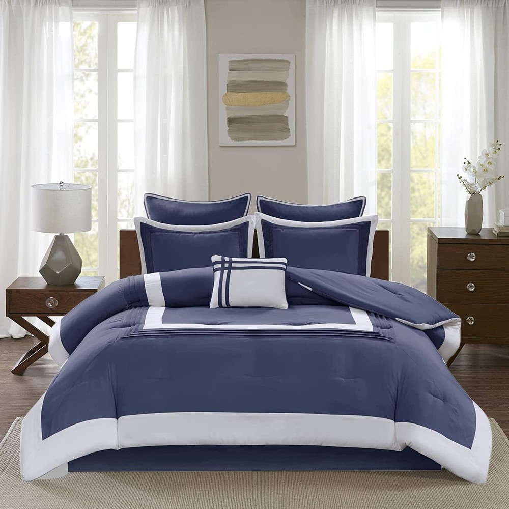 Comfort Spaces Malcom Cozy Comforter Set - Modern Trendy Design, All Season Down Alternative Bedding, Matching Shams, Hotel Deluxe Navy, Queen Description Bring home a 5 stars hotel bedroom décor into your own bedroom with our luxurious borders design comforter set from Malcom collection. The comforter features a soft microfiber with sophisticated pleating fabrication technique for a luxurious touch. Microfiber fabric is a really soft fabric that is naturally wrinkle and shrinkage resistant to bring you all season comfort for the years to come. Available in 2 sizes Queen and King and conveniently machine washable. Features: 100% Microfiber Bring home a 5 stars hotel bedroom decor into your own bedroom with our luxurious borders design comforter set from Malcom collection Featuring a soft microfiber with sophisticated pleating fabrication technique for a luxurious touch. Microfiber fabric is a really soft fabric that is naturally wrinkle and shrinkage resistant. Set Includes: 1 Comforter: 90"W x 90"L, 2 Standard Shams: 20"W x 26"L plus 2"D, 2 Euro Shams: 26"W x 26"L plus 1"D, 1 Bed Skirt: 60"W x 80"L plus 15"D, 1 Decorative Pillow: 12"W x 16"L Care instructions: Machine wash, gentle cycle and separately. Spot clean decorative pillows. Do not bleach. Tumble dry low, remove promptly. Do not iron. If there is no free movement in the washer or dryer, use large capacity commercial washer/dryer. Product Details: Size: Queen Included Components: 1 Comforter, 2 Standard Shams, 1 Decorative Pillow, 1 Bed Skirt, 2 Euro Shams Color: Hotel Deluxe Navy Style: Malcom, Hotel Deluxe Gray Brand: Comfort Spaces Product Care Instructions: Machine Wash, Spot Clean pillow Fabric Type: 100% Microfiber Material Type: Microfiber Global Trade Identification Number: 13 Number of Pieces: 7 Manufacturer: E&E Co. Ltd DBA JLA Home UPC: 086569782113 Included Components: 1 Comforter, 2 Standard Shams, 1 Decorative Pillow, 1 Bed Skirt, 2 Euro Shams Brand Name: Comfort Spaces Pattern: Pieced Seasons: All Style Name: Malcom, Hotel Deluxe Gray Theme: Hotel Deluxe/Modern Trendy Color: Hotel Deluxe Navy Size: Queen Shipping Free fast shipping Return Policy All items qualify for returns within 30 days of receipt.