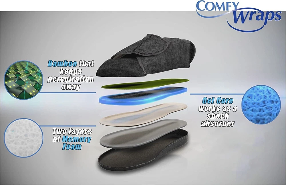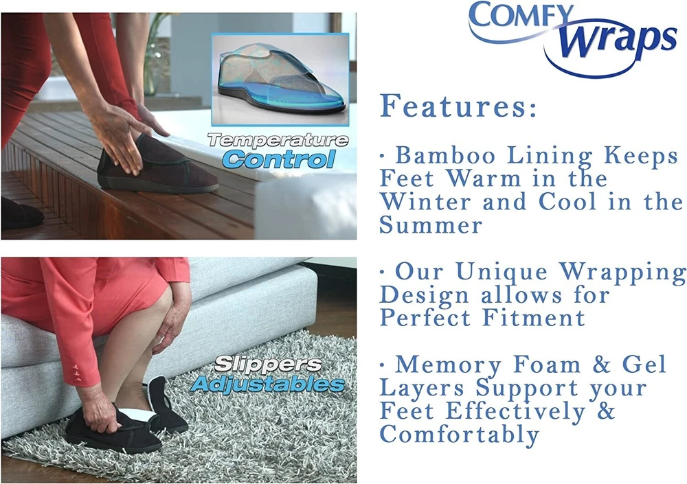 Wrap-around fitting for total comfort Double-layer, memory foam insole with a gel core Adjustable fit that won't slip Rubber sole, never loses shape indoors or outside Fleece-lined for heat control, with bamboo for dry, odorless feet Shock-absorbing inner redistributes your weight evenly Reduces stress on pressure points in feet and knees THE SUPER-COMFY, WRAP-AROUND SLIPPERS Comfy Wraps are the most comfortable slippers you might ever own! Made with every kind of comfort in mind, Comfy Wraps are like no slippers you've ever worn before. With a clever, adjustable wrap-around design that gives you a perfect, secure, non-slip fit; a foam and synthetic wool lining that controls your foot temperature, keeping you warm and cosy in Winter and cool in Summer; and an incredible double-layer memory foam and gel inner sole that acts like a shock absorber, redistributing your weight evenly and with maximum comfort and reducing stress and pressure on weak areas in the foot, ankle and knees. Comfy Wraps are the slippers your poor tired feet have been praying for! WRAP-AROUND FITTING FOR TOTAL, NON-SLIP COMFORT The unique way that Comfy Wraps surround your feet means they are always the perfect fit. With a winged design that lets you slide your foot in and then wrap each side over the top, you create the ideal amount of tension across the width and sides of the slipper rather than at the top and the heel so, unlike ordinary elasticated 'slip-ons' that give at the top through constant stretching and collapsed heels from constantly putting them on, they won't go baggy and loose. And, unlike backless 'step-in' slippers they won't fly off or let you step back out of them when you most need them, making Comfy Wraps the perfect indoor or outdoor slippers for total comfort and maximum hold. DOUBLE-LAYER, MEMORY FOAM INSOLE WITH A GEL-CORE When it comes to comfort and support Comfy Wraps are the ultimate slippers. The inner sole is made from a shock-absorbing gel core that takes all the impact from each step, whether on soft carpets or hard floor tiles and concrete, and softens it, redistributing the weight and pressure through the width and length of your feet. This reduces impact pressure and stress on joints in your feet as well as ankles and even your knees and back. PLUS, that gel core is surrounded by a double layer of extremely comfy memory foam that holds every part of your foot in total comfort. FLEECE-LINED FOR HEAT CONTROL, WITH BAMBOO FOR DRY, ODOURLESS FEET We wear slippers in Summer and Winter, so we need to make sure they can cope with those extremes of temperature. The synthetic wool lining means your feet are always temperature-regulated, never getting too hot or too cold, and the bamboo fabric lining wicks away moisture and sweat so your feet are always dry, fresh and odour-free! Thank you for your interest in our products. If you have any questions about the item, please contact us through eBay. 20% restocking fee for all wrongly ordered items. If the product is DOA or damaged in delivery, we will exchange or refund the full amount of the original order. We reserve the right to exchange damaged or defective products before refund. If the product was not professionally installed or not returned in condition received, refund is subject to a restocking fee. We give a 30-day warranty from the date of delivery unless specified. Shipping is non-refundable.