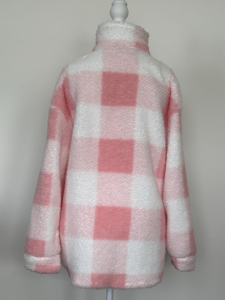 The product is a comfortable and cozy plaid pajama top in pink, designed for women in size S. It can be worn over pajamas or as a jacket, providing warmth and style. The regular fit and soft material make it a versatile piece for lounging around the house or running quick errands.