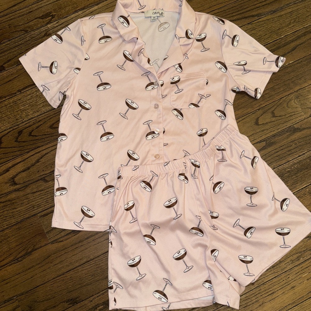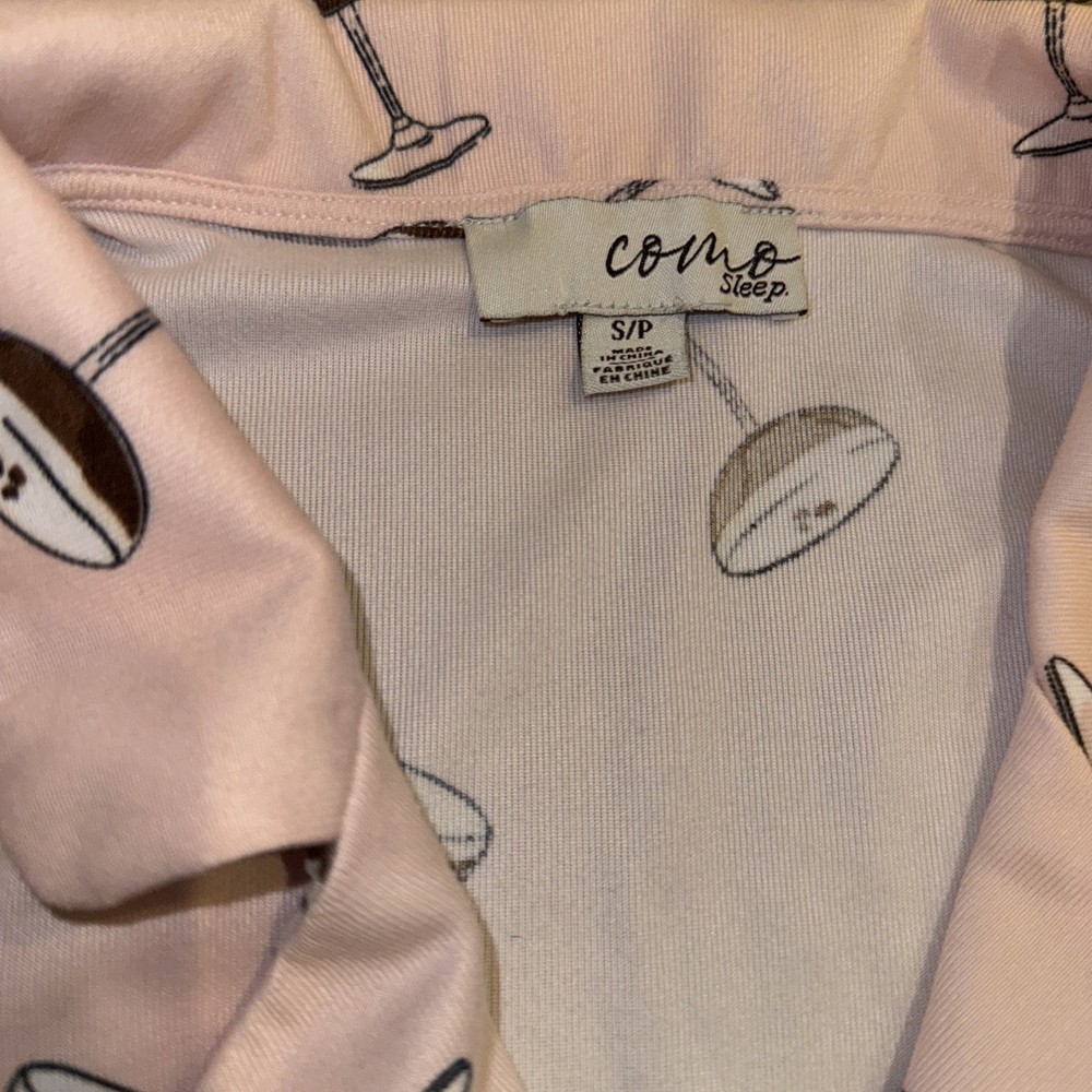 The Como Sleep Espresso Martini Pajamas Shorts are a stylish and comfortable option for women looking for a colorful and classic sleepwear set. These short sleeve sleep shorts feature a collared neckline and button closure, making it easy to slip on and off. Made from a blend of polyester and spandex, these knit fabric pajamas offer a lightweight feel for year-round comfort. Perfect for any season, these pink pajamas are machine washable and designed with a Regular fit and size Small for a comfortable and relaxed sleepwear experience. Smoke free home. Shirt is 23” across chest. Length 23”. Shorts 3” inseam.