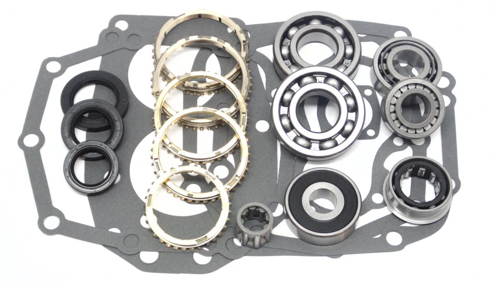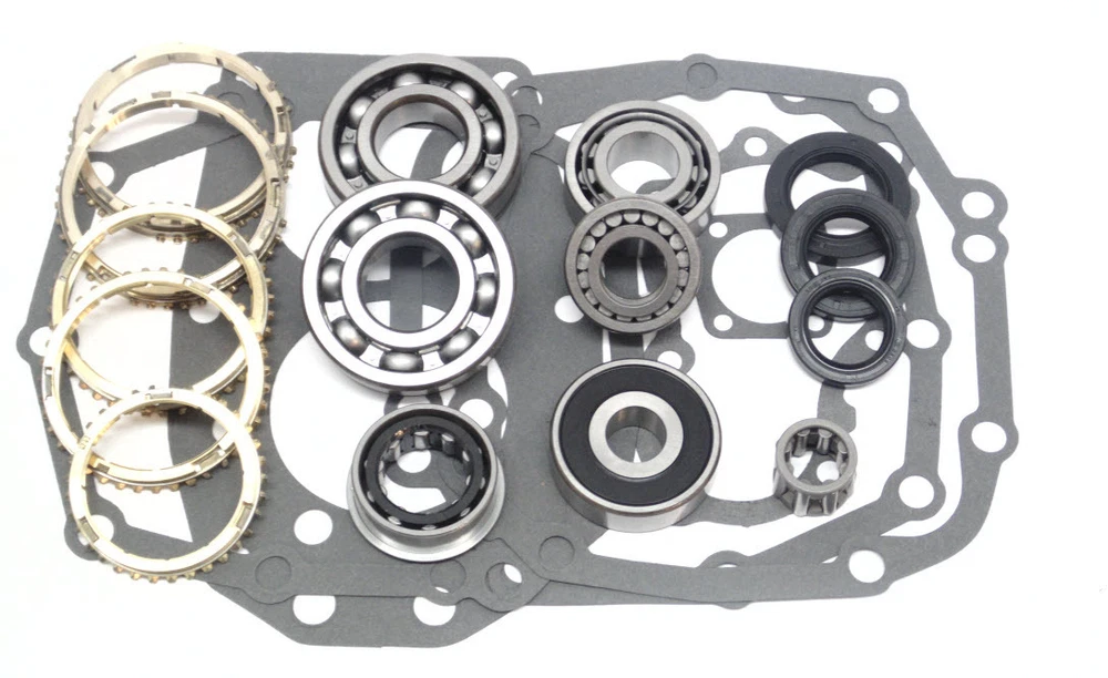 Professional Quality Rebuilding kit MANUAL TRANSMISSION REBUILD KIT with SYNCHROS Toyota 5-Speed W55 / W56 / W58 1978-1991 BK-162WS This is the transmission that has the reverse gears in the 4x4 adapter or tail housing, not in the case section. It has a 7 bolt front bearing retainer, a 21mm wide input bearing (HR6307NX or 6307-N) and a cast iron center plate . This kit includes: PREMIUM JAPANESE ROLLER & SEALED BEARINGS BY NACHI & KOYO: INPUT BEARING INPUT SHAFT BEARING MAIN SHAFT BEARING (REAR) COUNTER SHAFT BEARING (CENTER) COUNTER SHAFT BEARING (REAR) POCKET BEARING 5-PIECE GASKET SET SEALS: FRONT, REAR (2WD) & ADAPTER SEAL (4WD) SYNCHRO RING SET No Chinese bearings TOYOTA CRESSIDA: 4 CYL 2.8L 1983-1988 - 5spd, RWD, W58 (aluminum case, rear load design) TOYOTA CELICA: 4 CYL 2.4L 1978-1985 - 5spd, RWD, W55 (aluminum case, bell housing and tail housing) TOYOTA SUPRA: 6 CYL 2.8L 1982-1985 - 5spd, RWD, W58 (aluminum case, rear load design) 6 CYL 3.0L 1986-1991 - 5spd, RWD, W58 (aluminum case, rear load, 1st-2nd and 3rd-4th synchro assemblies use wire type springs) TOYOTA PICKUP: 4 CYL 2.4L 1983-1991 - 5spd, RWD, W55/W56 (aluminum case, removable bellhousing, -7 bolt front retainer, -20mm wide input bearing (HR6307 or 6307-N) 1st-2nd and 3rd-4th synchro assemblies use wire type springs) TOYOTA 4RUNNER : 4 CYL 2.4L 1984-1991 - 5spd, RWD, W55/W56 (aluminum case, removable bell housing, -7 bolt front retainer, -20mm wide input bearing (HR6307 or 6307-N) 1st-2nd and 3rd-4th synchro assemblies use wire type springs) This is the same Superior Quality Kit that we Private Brand for the Industry ! _________________________________ Save a bundle here over the cost from a dealership Buy with confidence * Check out our feedback All of our items listed are in stock and ready to ship We Quick-Ship Every Day !
