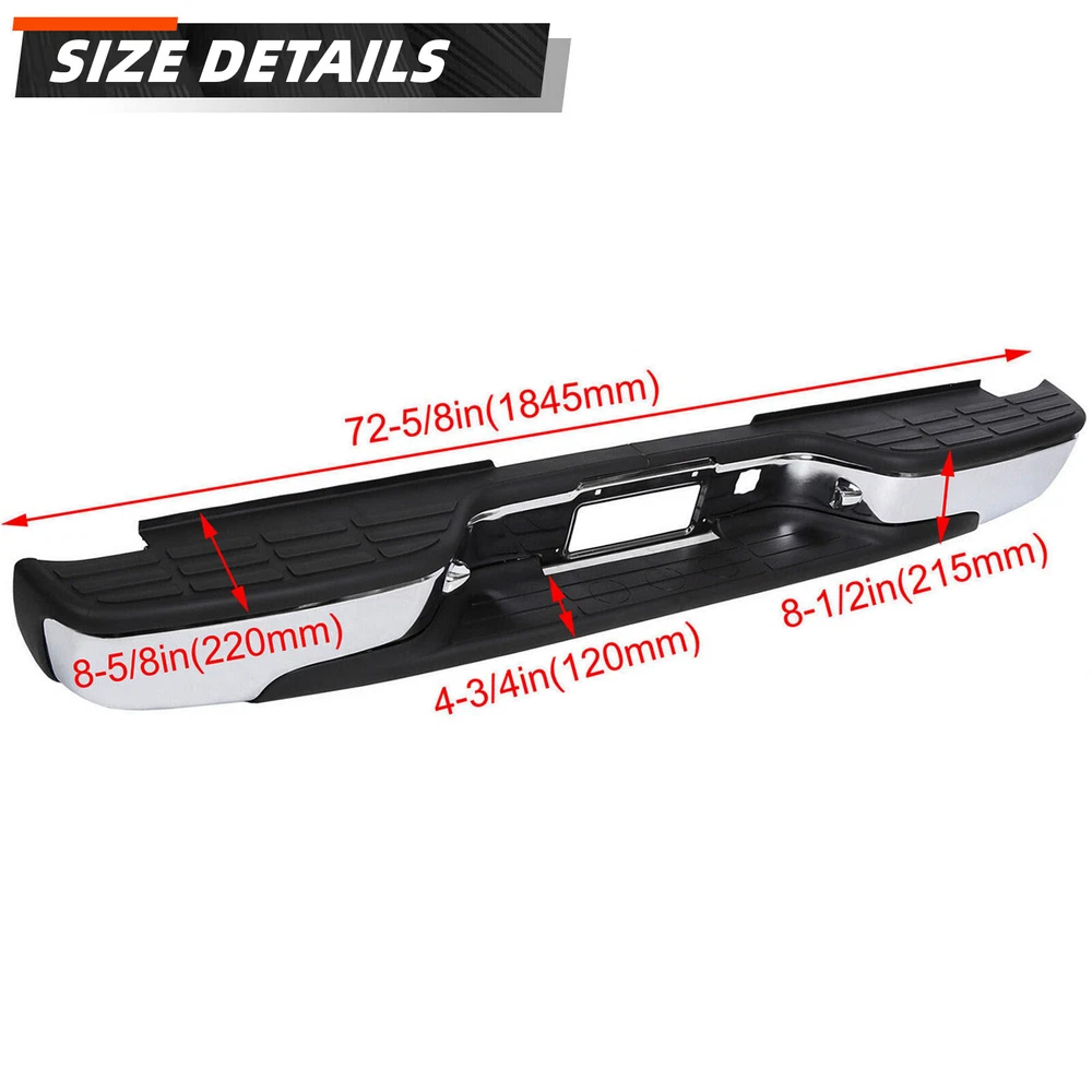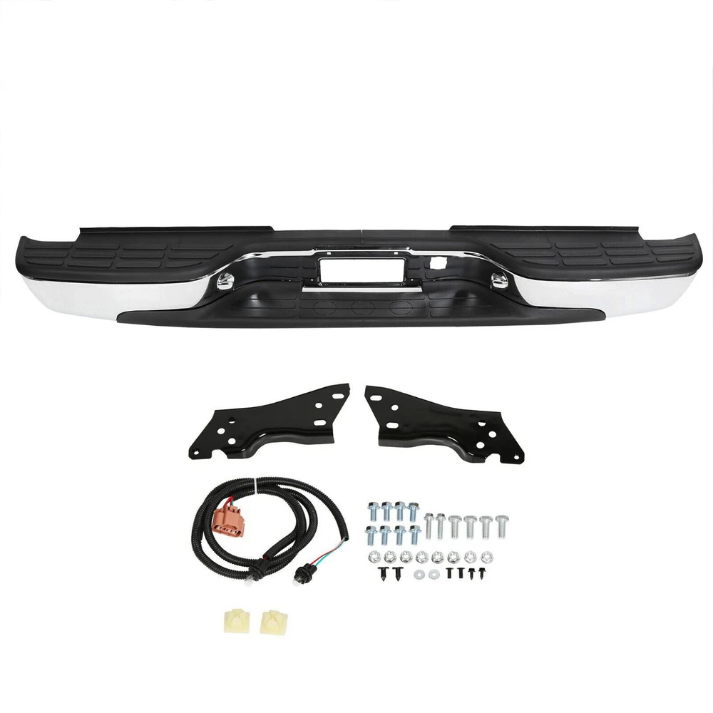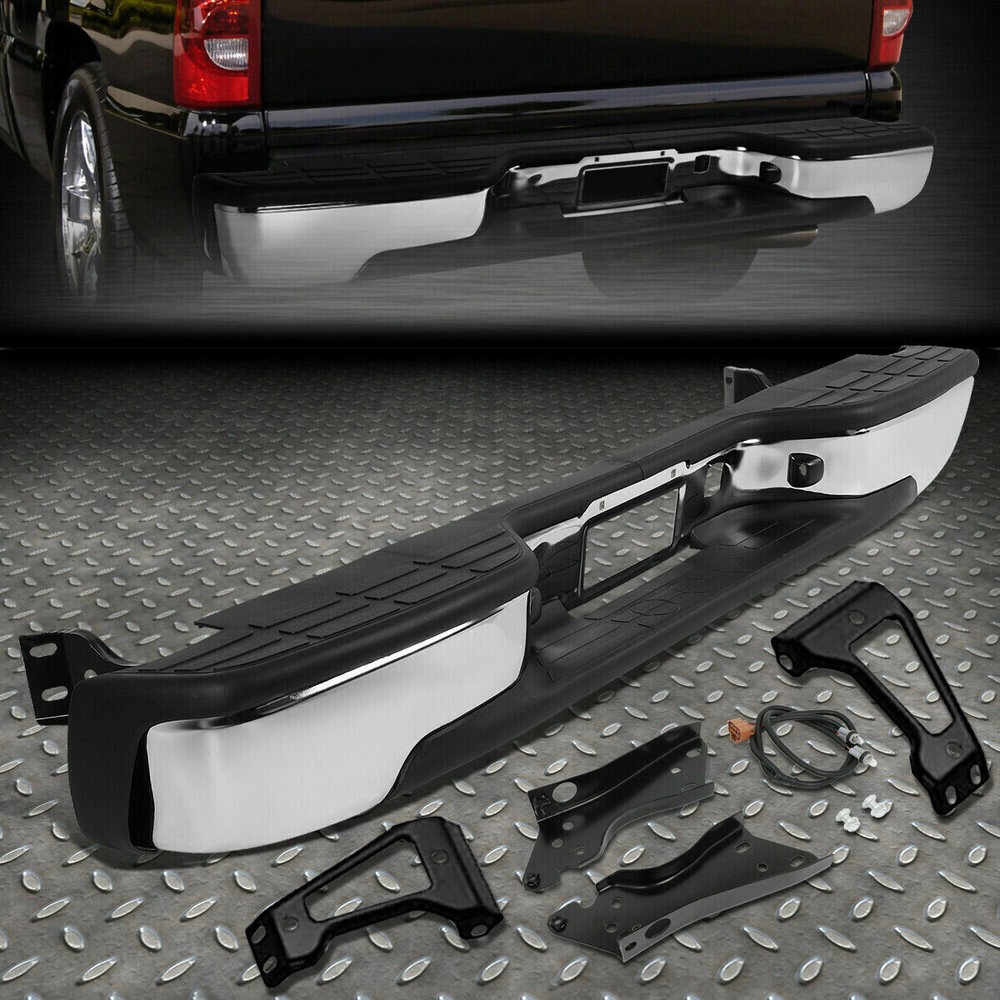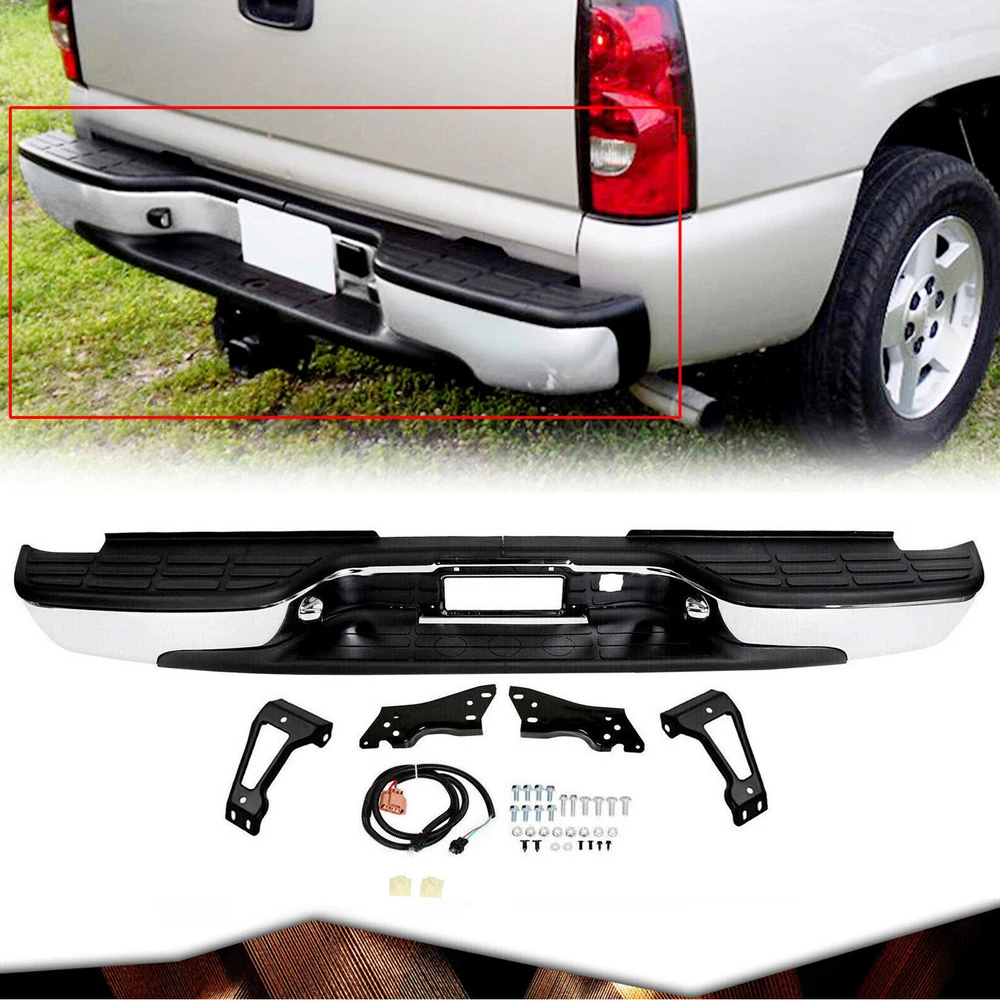 New Complete Chrome Rear Bumper for 1999-2007 Chevy Silverado GMC Sierra 1500 Feature: Plug-n-Play Operation, Direct Bolt-on OE Fitment or Replacement for the Stock Unit Comes with a Complete Set of Step Pads Comes without Parking Sensor Holes Polished Chrome Finish Requires no Modification or Drilling With License Plate Lights Wax / Polishing recommended for regular maintenance to inhibit Corrosion Specification 100% Brand New Placement on Vehicle: Rear Surface Finish: Chrome Color: Chrome Bumper + Black Step Pad Material: Steel Warranty: 5 Years Warranty Aftermarket replacement for # 15705674 15738017 15738018 15705673, 15082619 12496085 GM1103122 11722355 12473000 GM1191119 GM1191120 GM1191121 Fits For 1999-2006 Chevrolet Silverado 1500 For 2007 Chevrolet Silverado 1500 Classic For 1999-2004 Chevrolet Silverado 2500 For 1999-2006 GMC Sierra 1500 For 2007 GMC Sierra 1500 Classic For 1999-2004 GMC Sierra 2500 Fits Models without Parking Sensor Holes Fits Fleetside / Styleside Models Package Included 1×Rear Bumper License Plate Lamps Wiring Harness Some bolts and screws Mounting Hardware as shown Shipping All items will be shipped out in 1 business day,no expedited service available. (USA only,Does NOT include Hawaii,Alaska or Puerto Rico, PO Boxes/APO's) Contact us Any Questions, Just feel free to contact us on eBay. We will reply you in 1 business day.