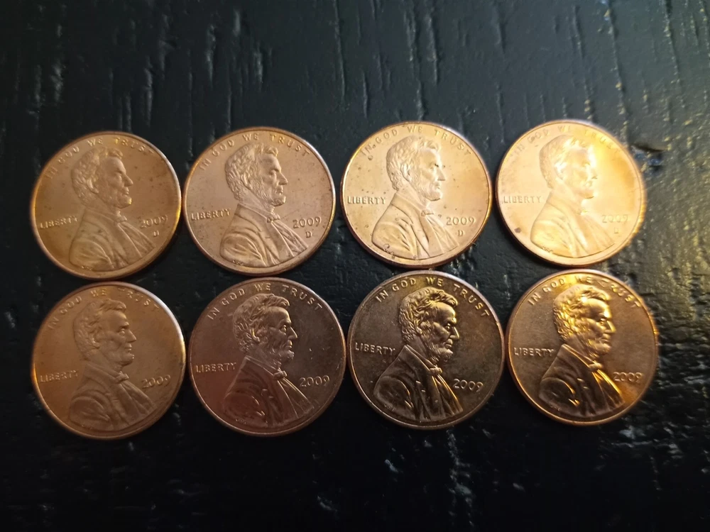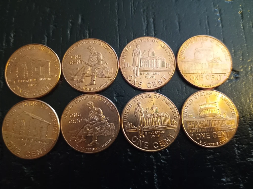 2009 set of P an D lincoln pennies. 8 coins total come right out of rolls Four different Pennies came out in 2009 all of Abe Lincoln celebrating the 100th Anniversary. -Ist coin is The Birthplace, which is a Log Cabin where he was born in 1809 -2nd coin is Formative Years , him taking a break from Rail-Splitting -3rd coin is Professional Life, shows the Illinois Capitol and Lincoln who became a Respected Lawyer -4th coin is his Presidency, features the US Capitol Dome as it Appeared During his Presidency