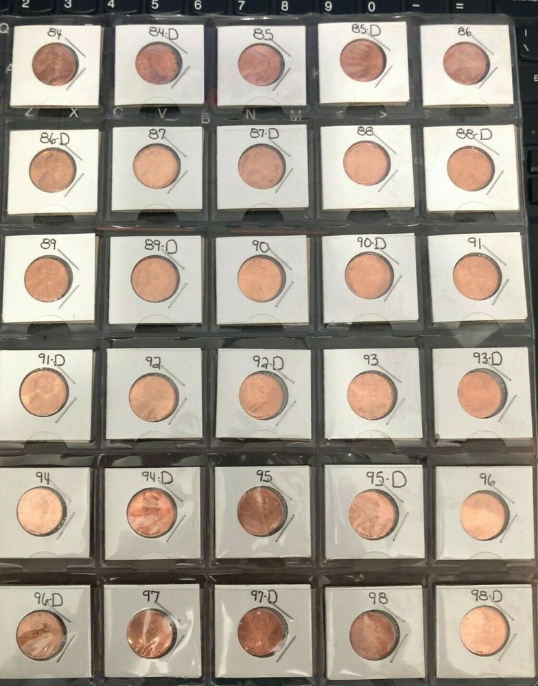 This is a beautiful complete set of 30 lincoln memorial cents from 1959 - 1972 including the following: 84,84D,85,85D,86,86D,87,87D,88,88D,89,89D,90,90D,91,91D,92,92D,93,93D,94,94D,95,95D,96,96D,97,97D,98,98D Wholesale and retail values are skyrocketing on all BU lincoln cents right now. You will save a lot in time, money, and shipping by buying all of these coins together versus trying to find each one separately. All coins are mounted in a 1.5" protective holder which is in turn mounted in an 8X11 protective sheet. The coins are well protected and look sharp !! All coins are FULL red. The coins average Very Choice BU with many being GEM BU. The coins look even better in real life than in the picture. All my auctions are guaranteed with a full refund so bid with confidence and feel free to return them if not satisfied. This is the fifth page of a six page set spanning 73 years of Choice to Gem BU lincoln wheat, lincoln memorial and lincoln shield cents. The first set covers 1938-47, the second set covers 1948-58, the third set covers 1959-72, the fourth set covers 1973-83, the fifth set covers 1984-98, and the sixth set covers 1999-2010. Check out my other auctions to see these sets. Shipping is $5.95 for the first set, and just $1 for each set beyond the first. So check out my other auction sets and save BIG on shipping. Thanks for looking!