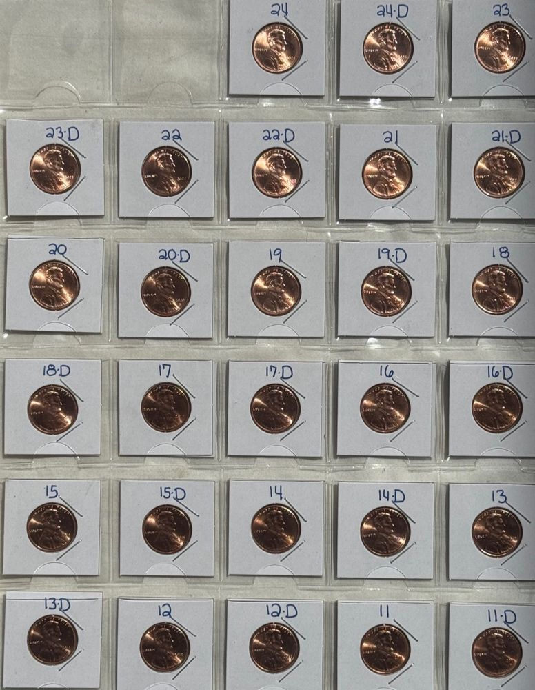 This is a beautiful complete set of 30 lincoln shield cents from 2011 - 2024. All dates included are listed below: 2011,2011-D,2012,2012-D,2013,2013-D,2014,2014-D,2015,2015-D,2016,201-D,2017,2017-D,2018,2018-D,2019,2019-D,2020,2020-D,2021,2021-D,2022,2022-D, 2023,2023D,2024,2024-D. They are planning on ending production of the lincoln cent in 2025 which will likely push up the value of uncirculated cents, making this a great investment. You will save a lot in time, money, and shipping by buying all of these coins together versus trying to find each one separately. All coins are mounted in a 1.5" protective holder which is in turn mounted in an 8X11 protective sheet. The coins are well protected and look sharp !! All coins are FULL red. The coins average Very Choice BU with many being GEM BU. The coins look even better in real life than in the picture. All my auctions are guaranteed with a full refund so bid with confidence and feel free to return them if not satisfied. This is the seventh page of a seven page set spanning 85 years of Choice to Gem BU lincoln wheat, lincoln memorial and lincoln shield cents. The first set covers 1938-47, the second set covers 1948-58, the third set covers 1959-72, the fourth set covers 1973-83, the fifth set covers 1984-98, the sixth set covers 1999-2010, and the seventh set covers 2011-2024. Check out my other auctions to see these sets. Shipping is $5.95 for the first set, and just $1.50 for each set beyond the first. So check out my other auction sets and save BIG on shipping. Thanks for looking!