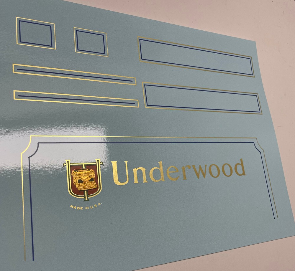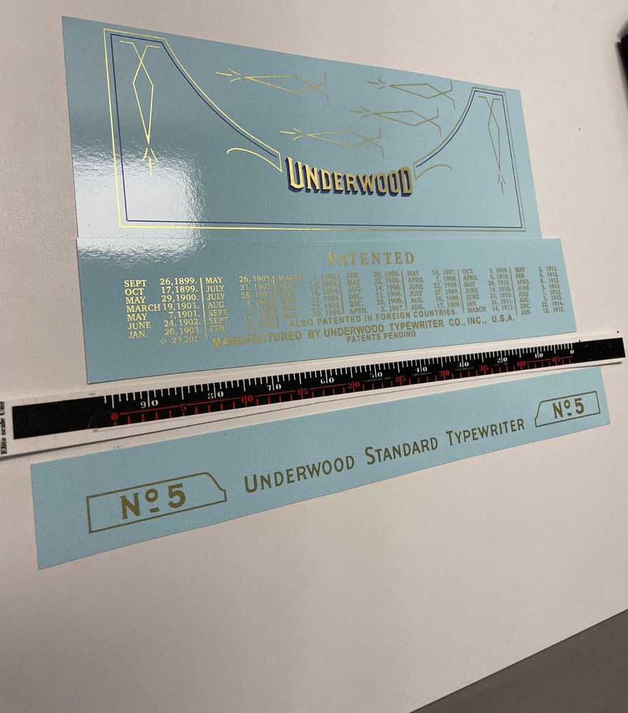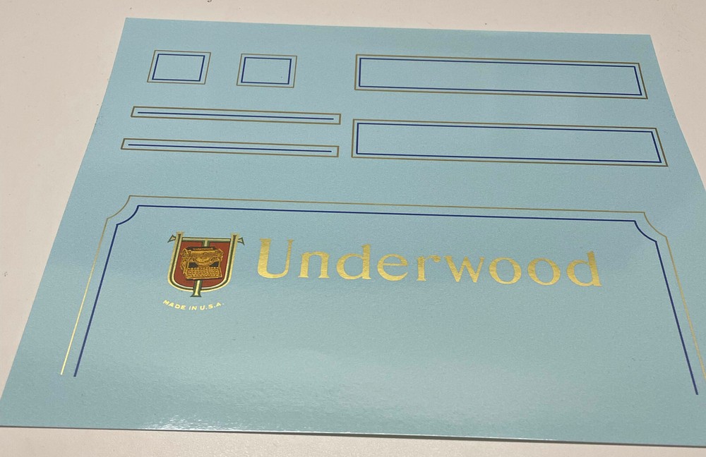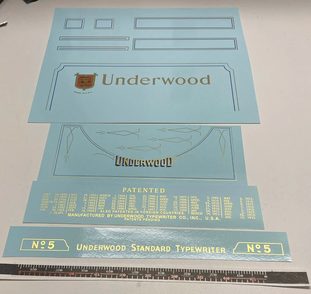 A complete set of decals and pinstripes for your antique Underwood 5 typewriter. The set includes decals for the front rail, front panel, paper table, sides and rear of the machine. These are not re-drawn, but photographic reproductions of the original decals. No fantasy extra's like gradient shades or extra lines. These professional decals are a production of the Typewriter Decal Shop. We have 20+ years of experience providing decals to hundreds of professional and amateur restorers around the world. Our first decals were produced for typewriter enthusiasts, for which we now have models for more than 130 brands, including Remington, Hammond, Caligraph, Crandall, Blickensderfer, Corona, Hermes, Triumph, Adler etc etc. Write for the complete list. The decals are delivered with ample test material, to try out with and develop the right feel for this ultra thin material. Extensive instructions tell you how to cut them, how to soak them, how to apply them and (optionally) how to coat and sand them to perfection. Make sure you use all the test material before you apply the real thing. Impatience is your best recipe for failure. If you have any questions, ask before you apply them. The decals are shipped from the Netherlands in sturdy cardboard envelopes and wrapped in foil and paper.