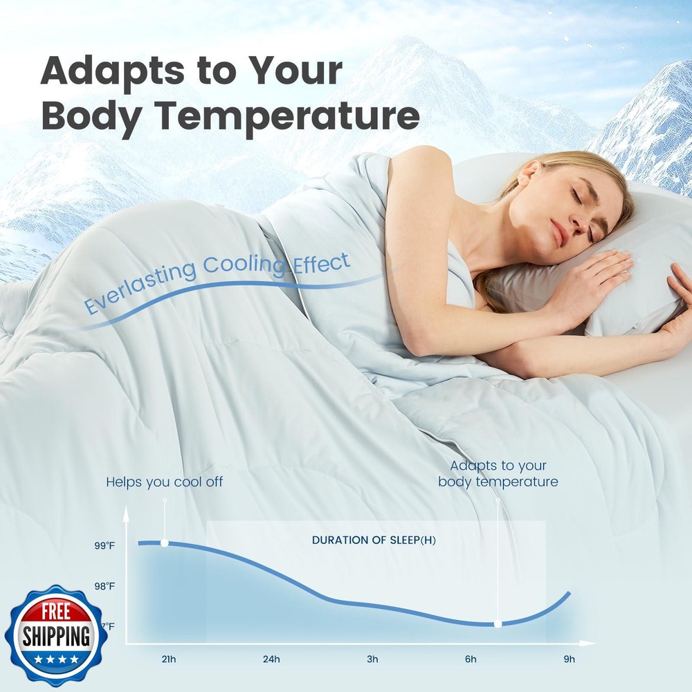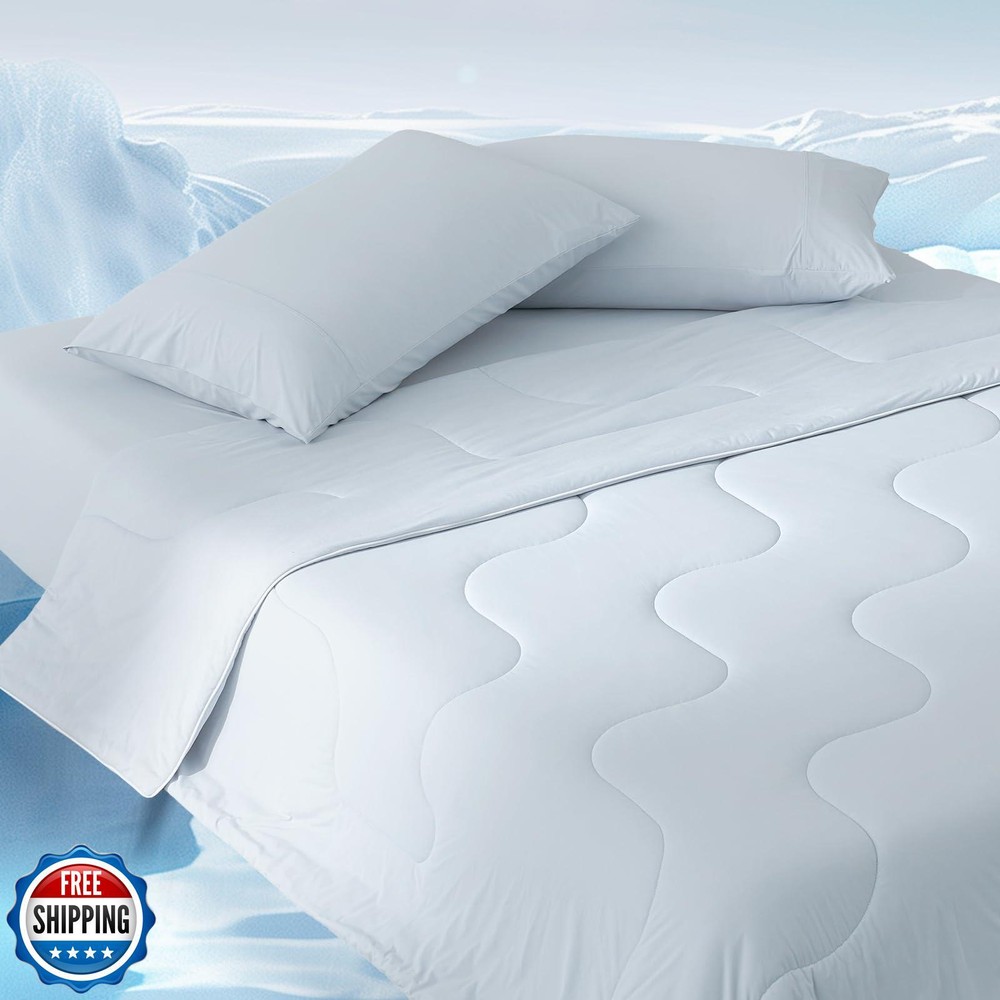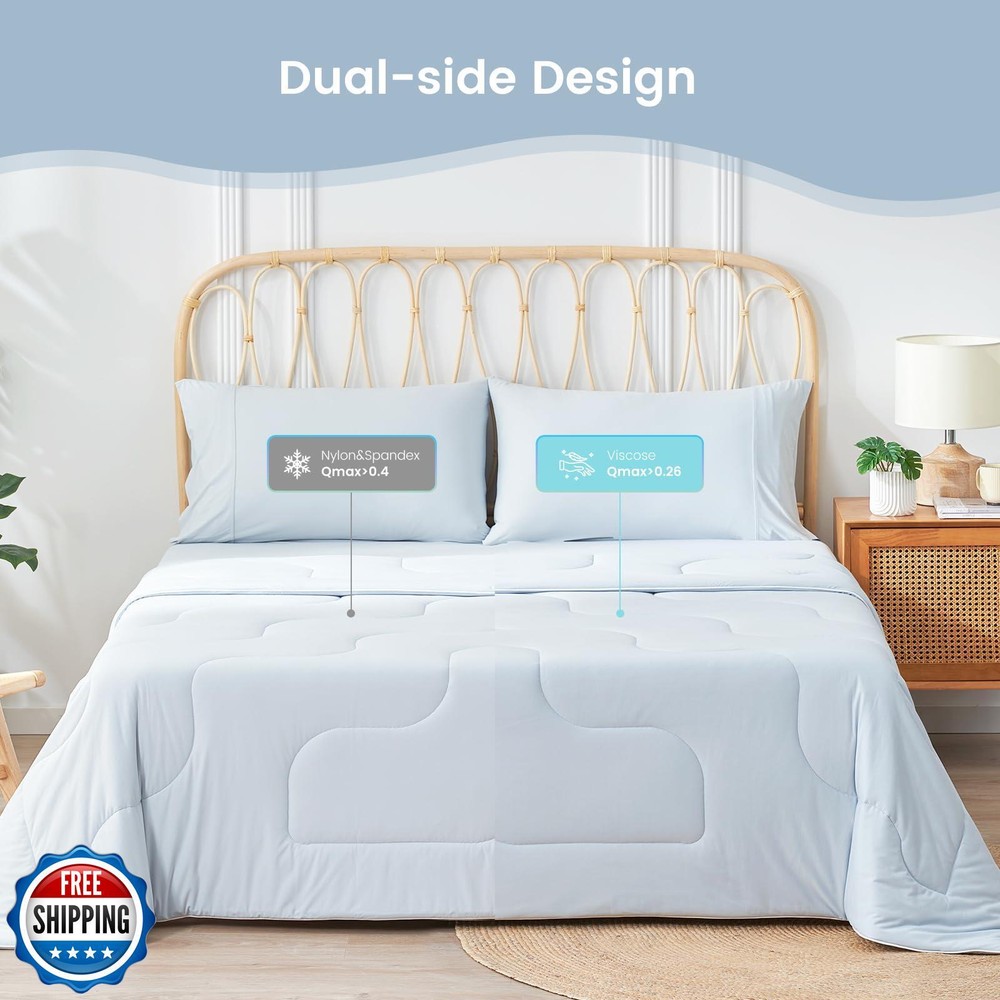 Cozy Bliss Cooling Comforter Twin Size, Double-Sided Cooling Blanket for Hot Sleepers and Night Sweats, Q-Max 0.4 Breathable Summer Comforter Quilt, Lightweight Soft Silky Smooth, Cool Blue Features 【DOUBLE-SIDED DESIGN COOL Comforter】Double-sided cool comforter for sleeping, Cozy Bliss cooling comforter has a 0.4 Q-max side made of Nylon and Spandex for a natural cool feeling. It also has a 0.26 Q-max cooling Viscose side, which is ultra cooling at a touch. 【EXTRA BREATHABLE& LIGHTWEIGHT】Cozy Bliss lightweight cooling comforter use the super soft OEKO-TEX certified fabric, filled with Sorona fiber to form a Helical structure with high elasticity and good air permeability, allowing you to enjoy a super-fluffy feeling while sleeping. Perfect for individuals, couples, or upscale retreats, it's the ideal choice for those who desire breathable sophistication in any setting. 【NO SWEATS】Experience a cloud-like touch of softness and luxury with our premium yarn and filling, 70% viscose derived from wood is naturally breathable, moisture-wicking, and thermo-regulating, delivering exceptional breathability for the sweat-less comfort all year round. 【GIFT CHOICE】Say goodbye to sweat and enjoy a deep, peaceful sleep. The trendy two-tone look adds a unique touch to your cooling experience while enhancing your bedroom's visual appeal. This pet-friendly comforter is a perfect gift, which more than just cooling—it's a statement of modern comfort and elegance by Cozy Bliss. 【EASY CARE】Fall in love at first touch with the soft and sensitive skin-friendly fabric; Lightweight yet densely woven, the knitted fibers are 5x thinner and stronger than silk; This washable and dryer-safe Comforter stays luxuriously soft after every wash. It's the ultimate choice for anyone seeking comfort, freshness, and relaxation. For better results, it's suggested to wash the comforter before the first use. Shipping Free & Fast Shipping: We offer free shipping to most of the USA with a normal delivery time of 3-7 days. However, due to the current situation, additional delivery time (up to 3 weeks) may be required for some items. Alternative Carriers: We may use alternative carriers (e.g., USPS, FedEx, UPS) to ensure your package arrives safely and on time. Due to the use of multiple carriers, we are unable to provide a tracking number automatically. Handling Time: Orders are processed and shipped within 1-2 business days of receiving cleared payment. Shipping Restrictions: Shipping to Alaska, Hawaii, Puerto Rico, Guam, and other US territories may incur shipping charges or delivery restrictions. Please contact us before ordering, or your order can be refunded/cancelled. State Restrictions: Certain items may not be shipped to California due to state regulations. Contact for Tracking Updates: If you require tracking updates or have any concerns about the delivery of your order, please feel free to contact us, and we will be happy to assist you. Return Policy 30-Day Hassle-Free Returns: If you are not completely satisfied with your purchase, you can return the item for free within 30 days of receiving it for a full refund or exchange. Easy Return Process: Contact us, and we will provide you with a prepaid return shipping label and detailed instructions. No Restocking Fee: There are no restocking fees for returns. However, the buyer is responsible for return shipping costs if the return is not due to a seller"s error. Refund Processing: Refunds will be processed within 1 business day of receiving the returned item in its original condition. Feedback Your feedback is extremely important to us. We strive to provide the best products and customer service possible. If you are satisfied with your purchase, please take a moment to leave us a positive review. If you have any concerns or issues with your order, please contact us before leaving negative feedback. We are committed to resolving any problems and ensuring your satisfaction. Contact Us If you have any questions or concerns, please feel free to reach out to our customer support team. You can contact us through the eBay messaging system. We are available Monday to Friday, 9:00 am to 5:00 pm EST, and we will do our best to respond to your inquiry within 24 hours. Thank you for supporting our small family business!