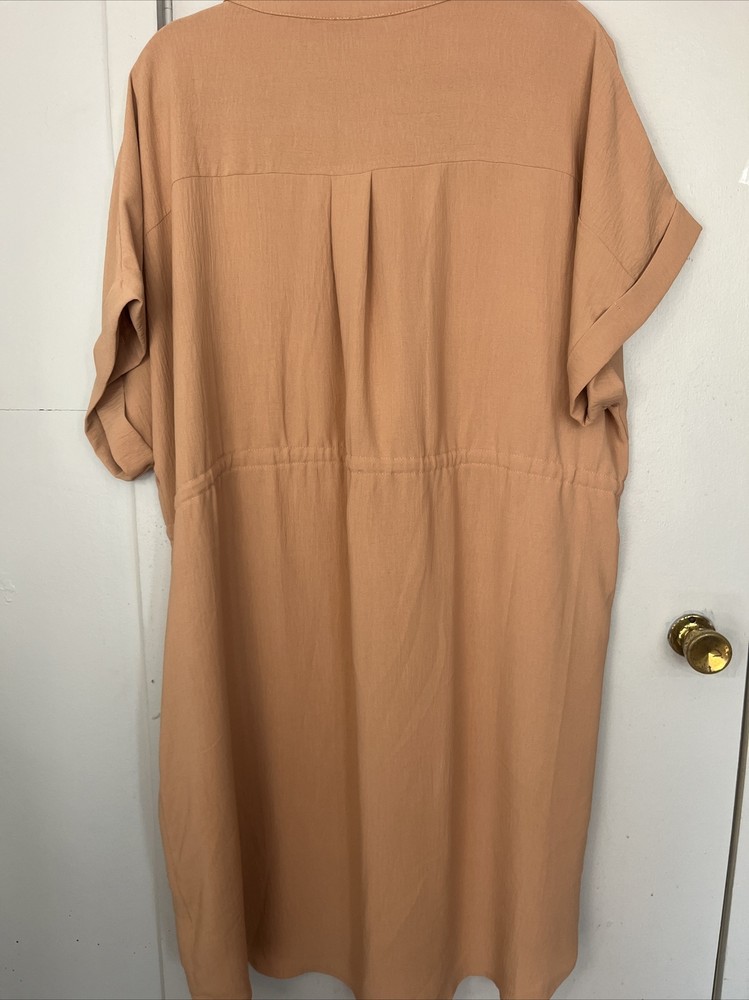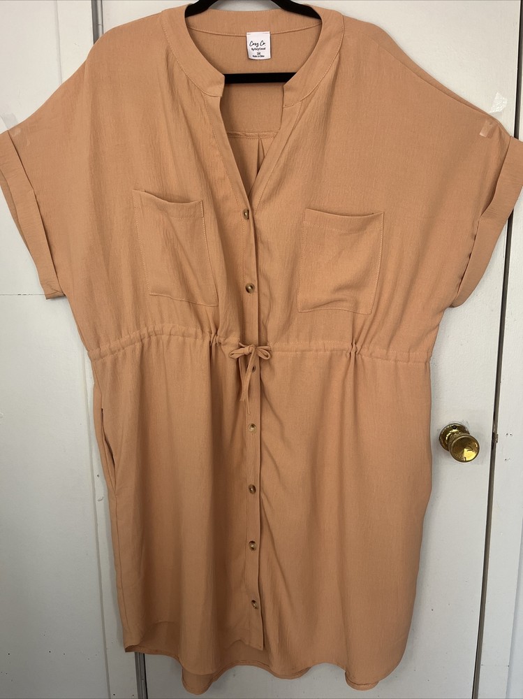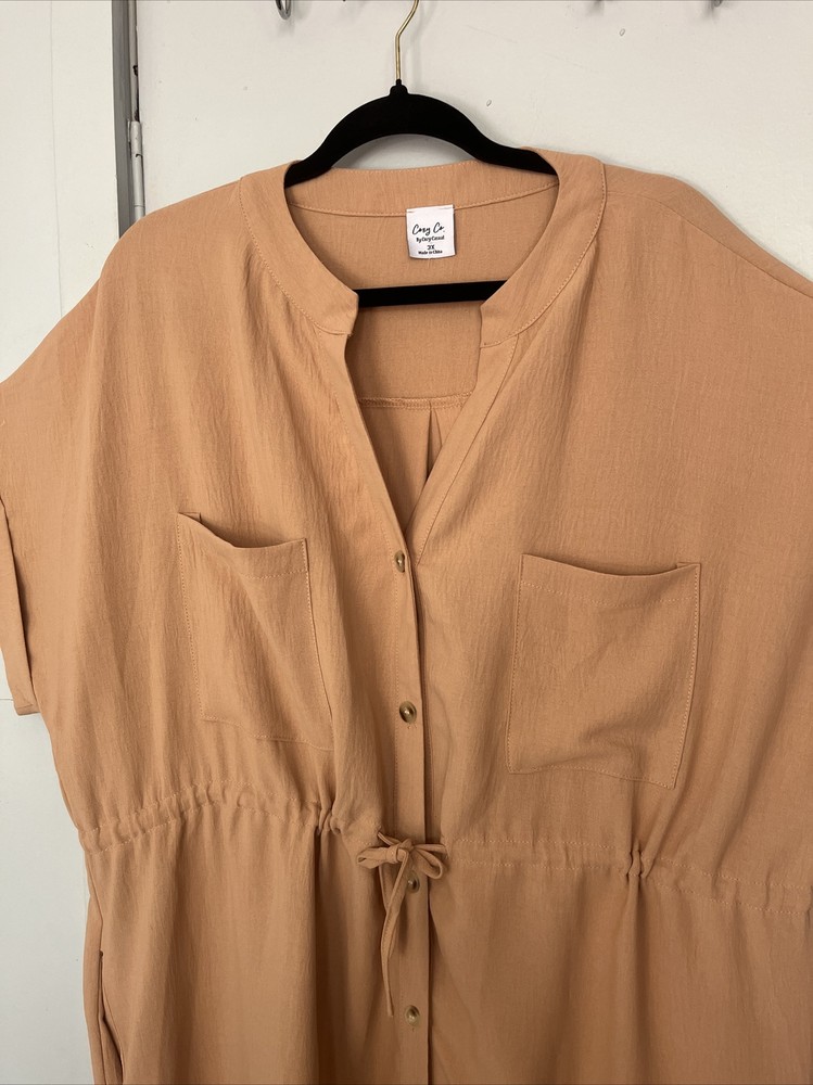 This beautiful midi dress by Cozy Co. is perfect for any casual occasion. The V-neckline and short sleeves provide a comfortable fit, while the button closure adds a touch of elegance. The dress features a solid pattern in beige color, with nature, beach, nautical, and outdoor themes that make it perfect for summer, fall, or spring seasons. The dress is machine washable and made of lightweight polyester material. It has extra buttons as accents and pockets for convenience. The collarless design and 3XL plus size make it a great fit for women who want to look chic and stylish while feeling cozy and comfortable. The dress is crafted in China and is not vintage or handmade.
