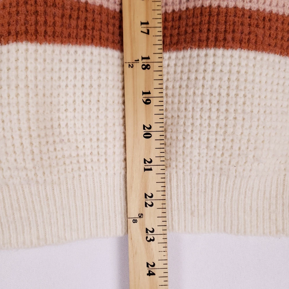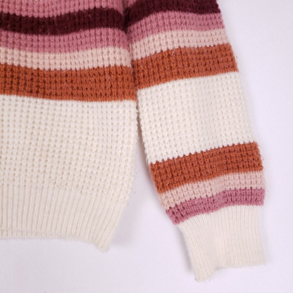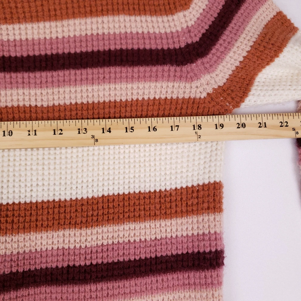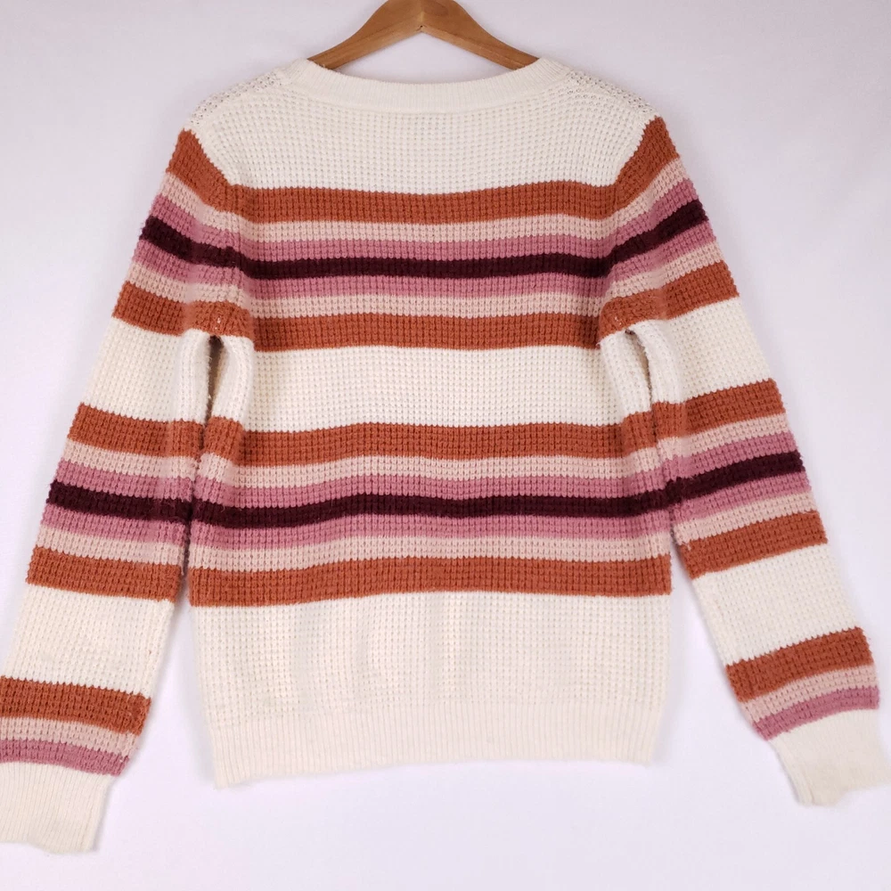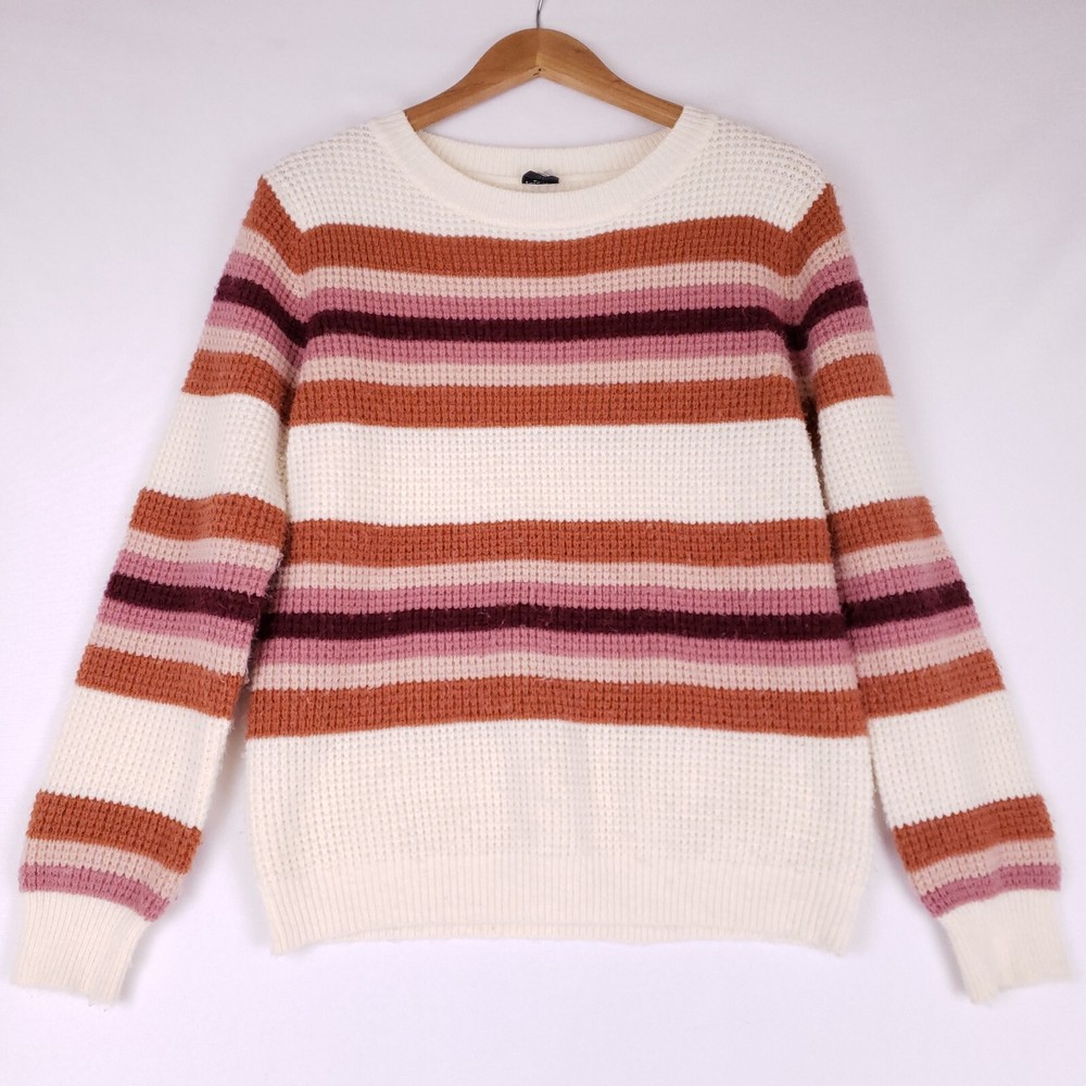 Measurements in the pics and ships next day! Cozy knit pullover sweater by Cozy Co Features vibrant stripes in warm tones (orange, pink, burgundy, cream) Perfect for Cottagecore, Retrocore, and Cozycore aesthetics Lightweight yet warm, ideal for layering or standalone wear Classic crew neck and ribbed cuffs add to its cozy charm This sweater is a must-have for staying stylish and comfortable. Don't miss out—grab it today!