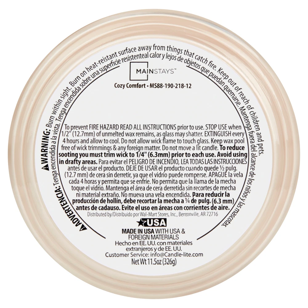 Introduce a soothing aroma into your living space with the Mainstays Cozy Comfort Scented 3-Wick Glass Jar Candle. Mainstays scented candles are highly fragranced and provide a clean and even burn that will fill your home with beautiful and enticing seasonal aromas. Place this candle in the kitchen, living room or dining room where you can enjoy it when entertaining guests or anytime you want to relax. Trim the wick periodically to promote even burning. Mainstays offers a wide selection of candle scents to explore and enjoy. Shop all of our Mainstays scents online and in-store. Treat yourself to the enticing scent of the Mainstays Cozy Comfort Scented 3-Wick Glass Jar Candle. Mainstays Cozy Comfort Scented 3-Wick Glass Jar Candle, 11.5 oz Mainstays Cozy Comfort fragrance, contains a comforting blend of vanilla buttercream, jasmine petals and warm musk sprinkled with brown sugar and vibrant red berries Adds coziness and warmth to your home Provides just the right amount of illumination with a 3-wick design Clear glass container complements virtually any room decor Pleasant scent for a relaxing environment without becoming overpowering Helps improve concentration, mood, and positive thinking Product measures 4.12" D x 3.2" H Product weighs 1.37 lbs Mainstays Cozy Comfort Scented 3-Wick Glass Jar Candle, 11.5 oz Mainstays Cozy Comfort fragrance, contains a comforting blend of vanilla buttercream, jasmine petals and warm musk sprinkled with brown sugar and vibrant red berries Premium-grade paraffin wax blended with premium quality ingredients to create distinctive true-to-life scents Clear glass container complements virtually any room décor and provides just the right amount of illumination with a 3-wick design Pleasant scent for a relaxing environment without becoming overpowering. Helps improve concentration, mood, and positive thinking Product measures 4.12" D x 3.2" H Product weighs 1.37 lbs