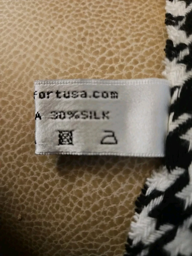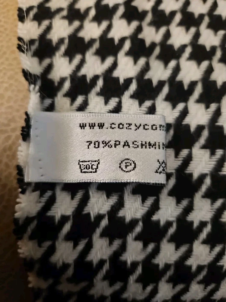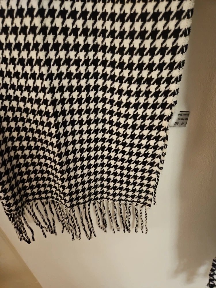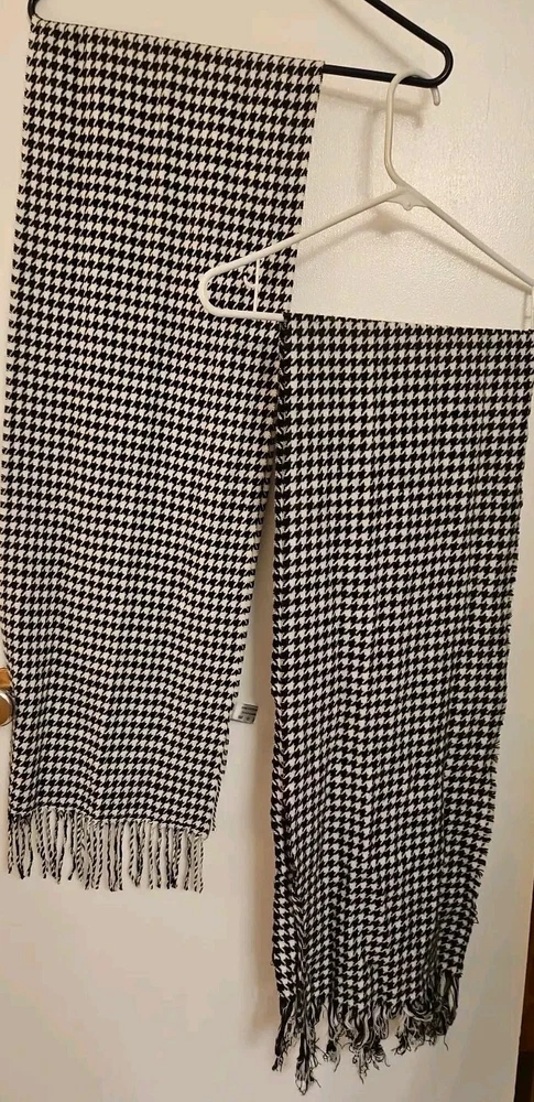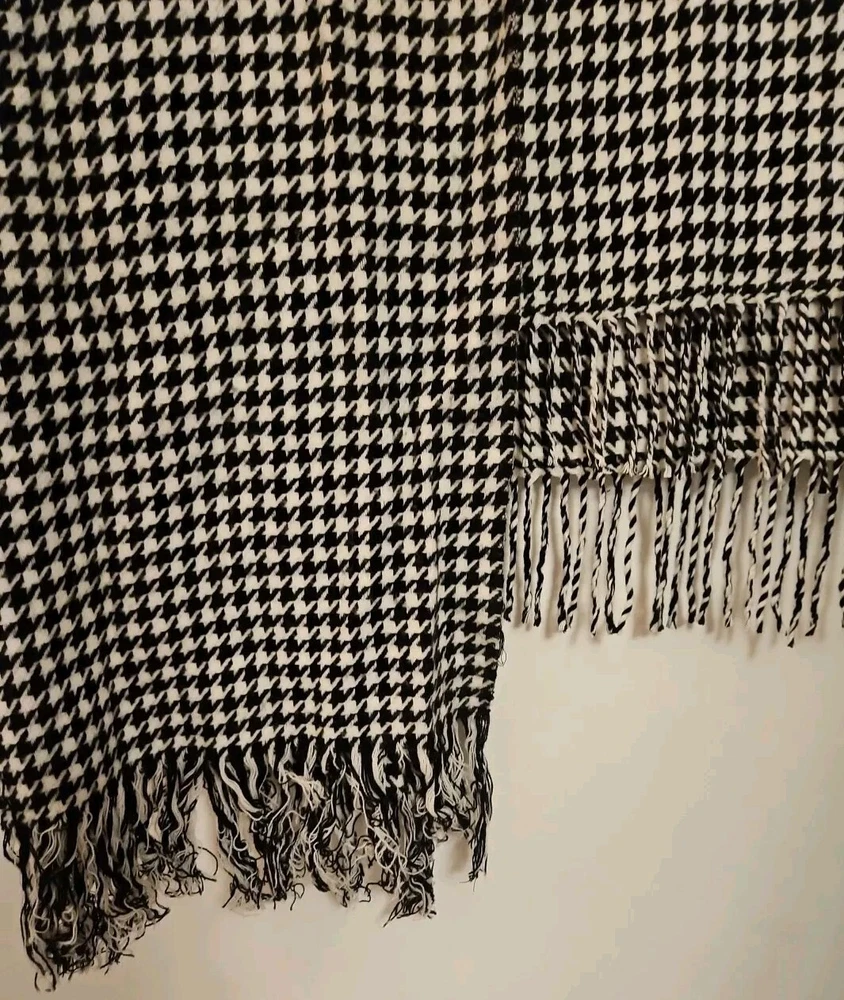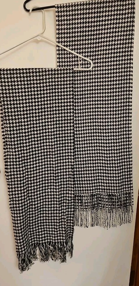 Elevate your winter, fall, or spring wardrobe with this classic black and white houndstooth patterned scarf. The fabric is soft and cozy, perfect for keeping you warm during chilly days. The fringe accents add a playful touch to the rectangular scarf, making it a great unisex accessory. This scarf is easy to care for, as it is hand wash only. It measures 12 inches in length and 62 inches in width, making it a versatile addition to any outfit. Whether you're running errands or going out with friends, this scarf is a timeless choice that will never go out of style. 2 scarves in this lot. One has tags, one does not have tags. Please see pics.