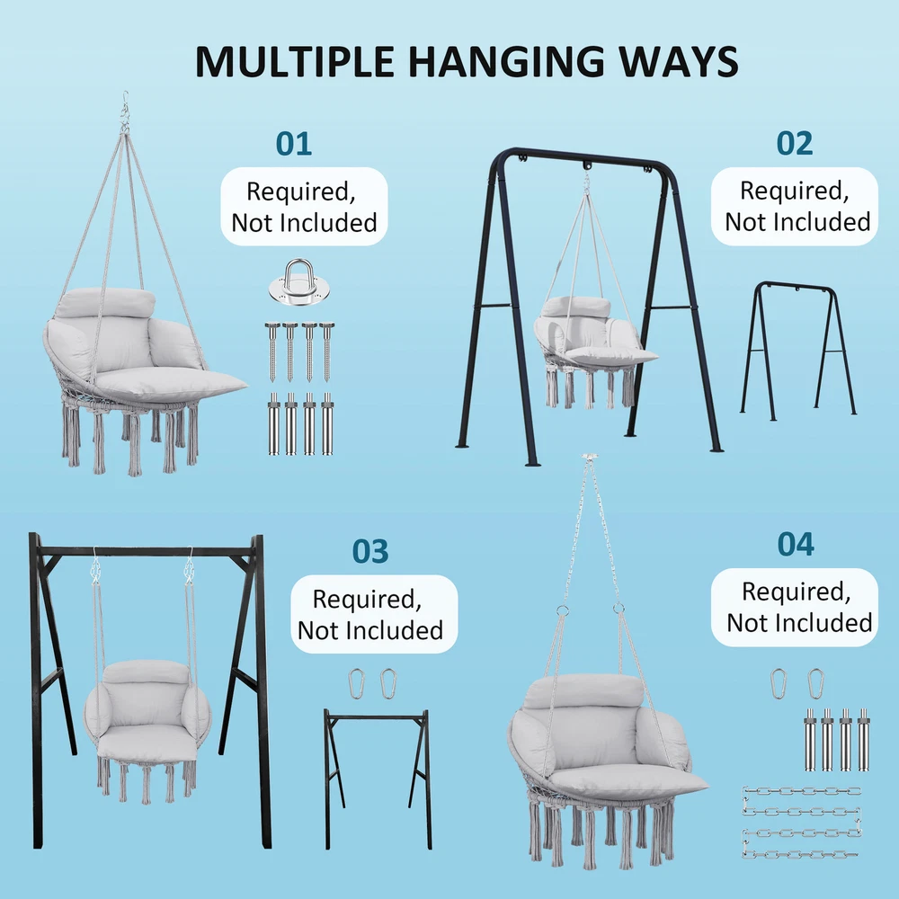 Features: - Large cushion with soft padding for optimal comfort - 320 gsm polyester-cotton cloth, more breathable and softer - Steel frame and tight weaving for safe swinging - Easy-to design with rings, spring clip, and adjustable chain - Stylish hanging chair with fringes, suitable for indoors or outdoors - Maximum load 265 lbs., no assembly required Specification: - Color: Gray - Material: Steel, Cotton-Polyester Cloth (65% Cotton, 35% Polyester), PP Cotton - Overall Dimension: 31.5" W x 23.6" D x 15.7" H - Overall Height: (from hook to base) 43.3" - Seat Size: 31.5" W x 23.6" D - Cushion Size: 43.3" L x 39.4" W x 2" D - Fringe Length: 9.1" - Hanging Rope Length: 36.2" - Steel Chain Length: 11.8" - Weight Capacity: 265 lbs. Package Includes: - 1 x Hammock Chair - 1 x Spring Clip - 1 x Steel Chain - 1 x Manual