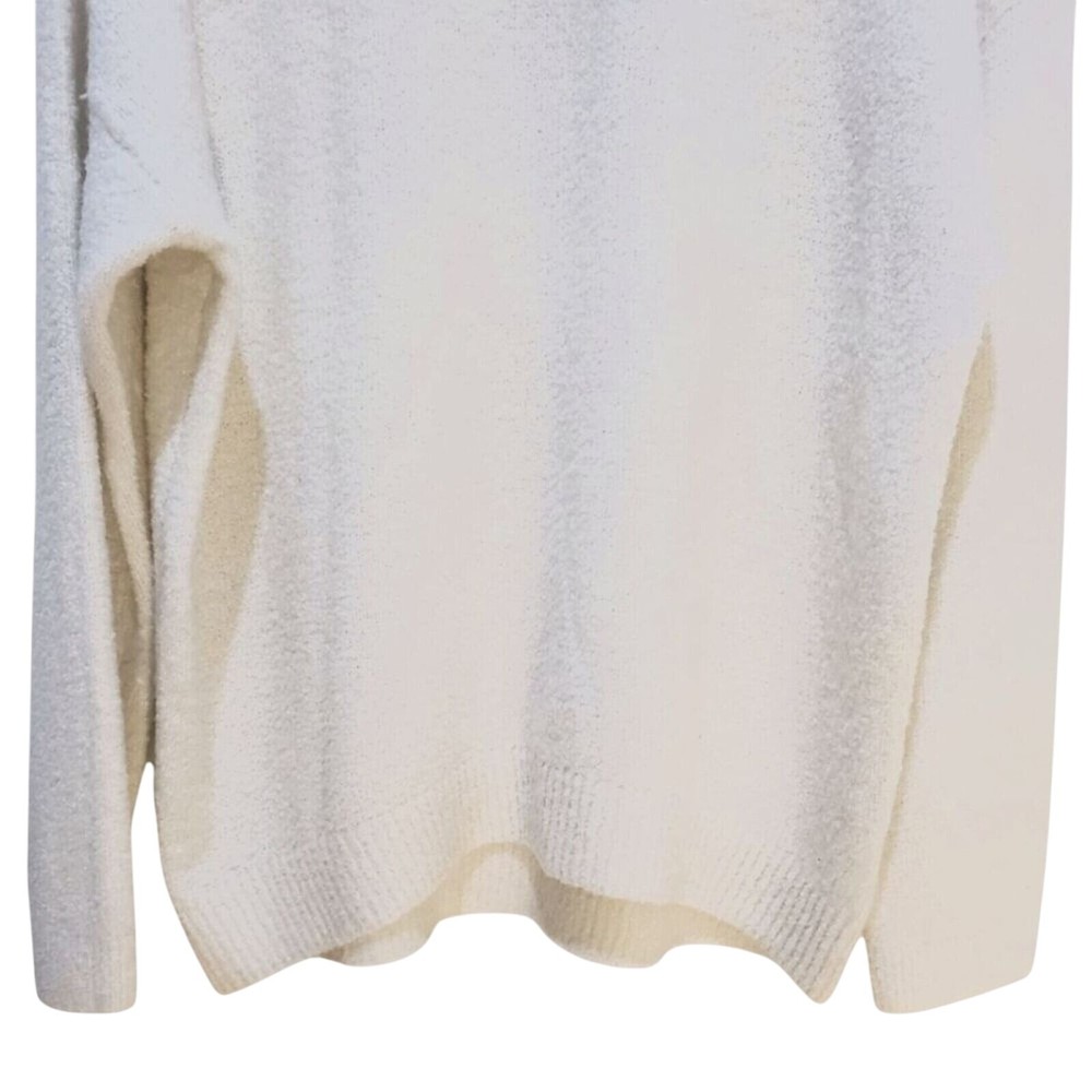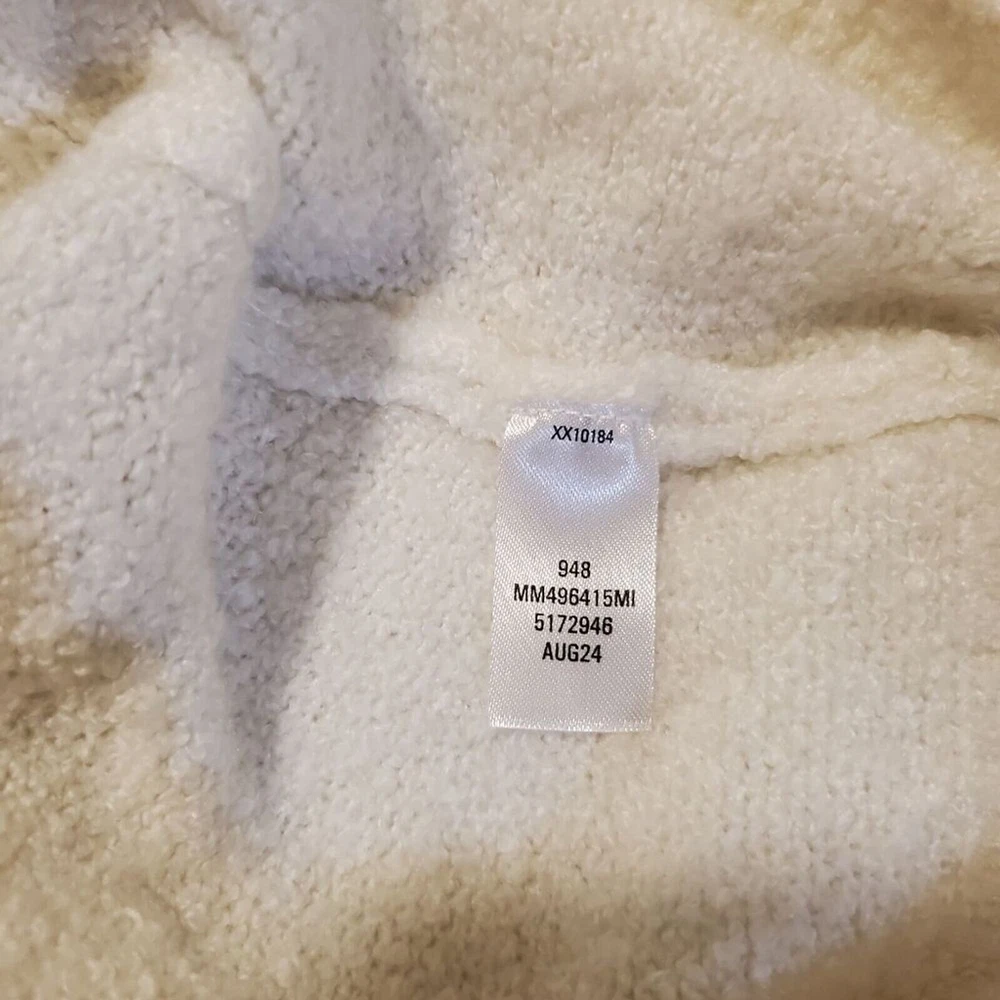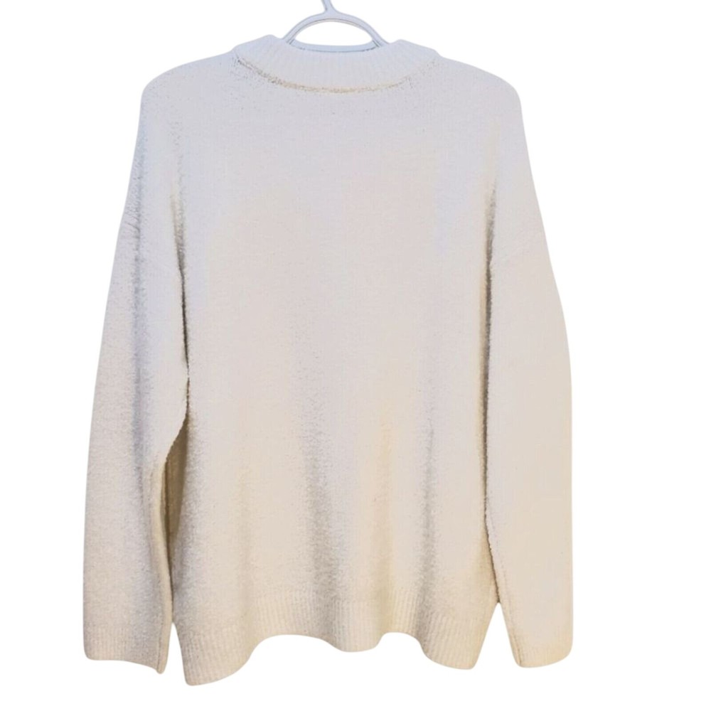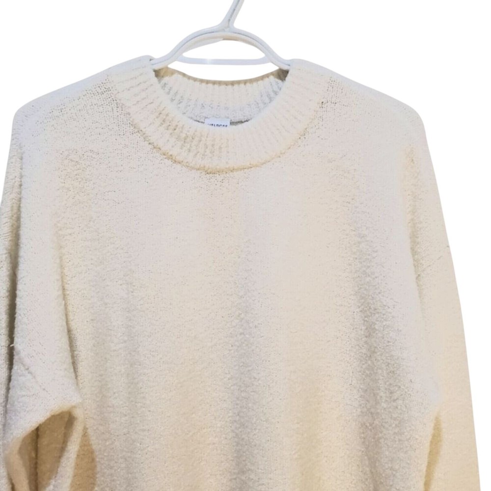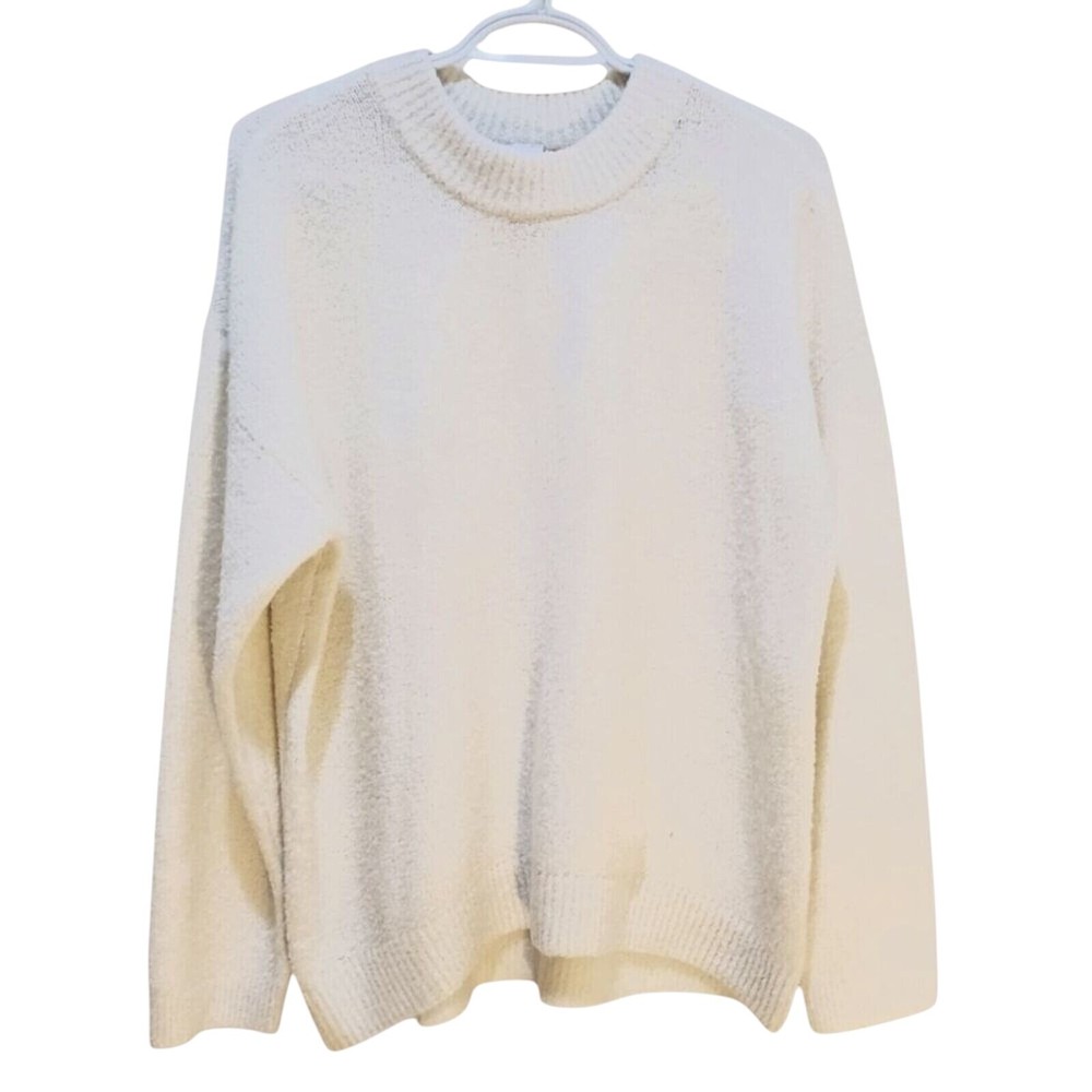 Envelop yourself in the plush comfort of this cloud-like sweater. The soft knit texture invites touch, while the relaxed fit ensures effortless style. A classic crew neckline and long sleeves offer timeless appeal, making it a versatile addition to any wardrobe. Perfect for snuggling up on a chilly evening, adding a touch of warmth to your everyday errands, or layering under a jacket for a stylish weekend brunch. Keywords: knit sweater, pullover sweater, crew neck sweater, long sleeve sweater, soft sweater, white sweater, cream sweater, cozy sweater, winter sweater, casual sweater, comfortable sweater, relaxed fit sweater, womens sweater, fuzzy sweater