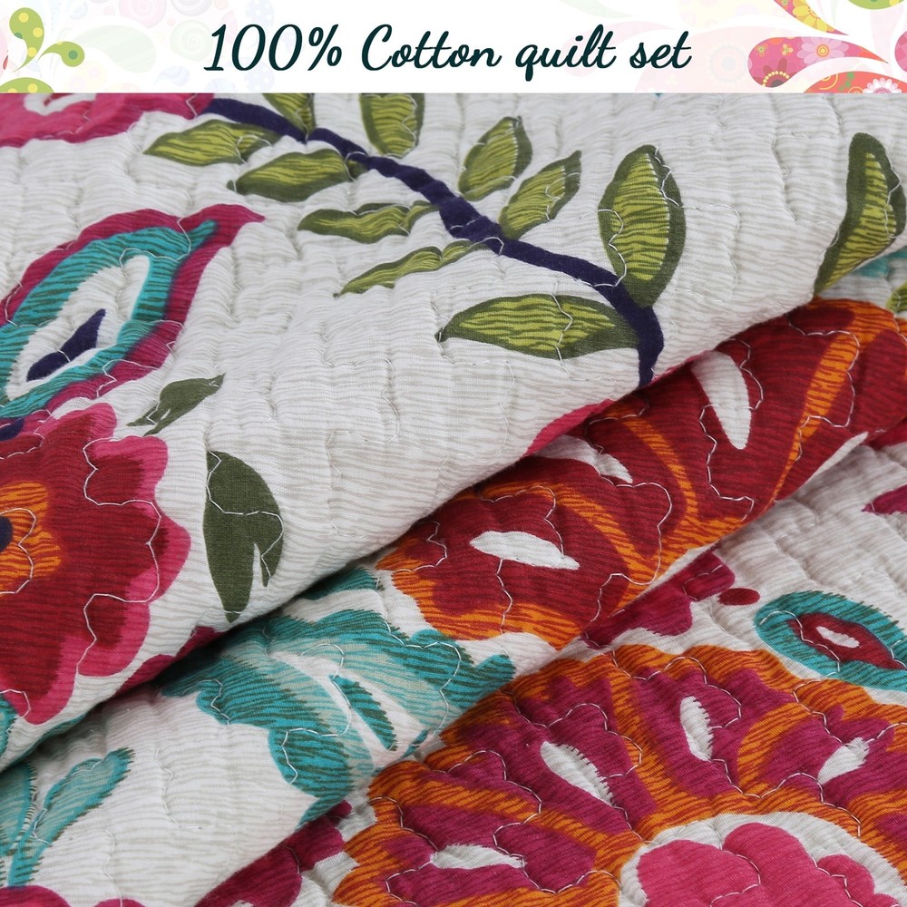 This quilt set is absolutely stunning—the vibrant floral print instantly livens up my bedroom! The 100% cotton feels soft and breathable, perfect for all seasons. I love that it's reversible, giving me two gorgeous looks in one. The included shams complete the cozy, stylish vibe. Plus, it’s machine washable, making upkeep a breeze. Fantastic quality and beautiful design, highly recommend!