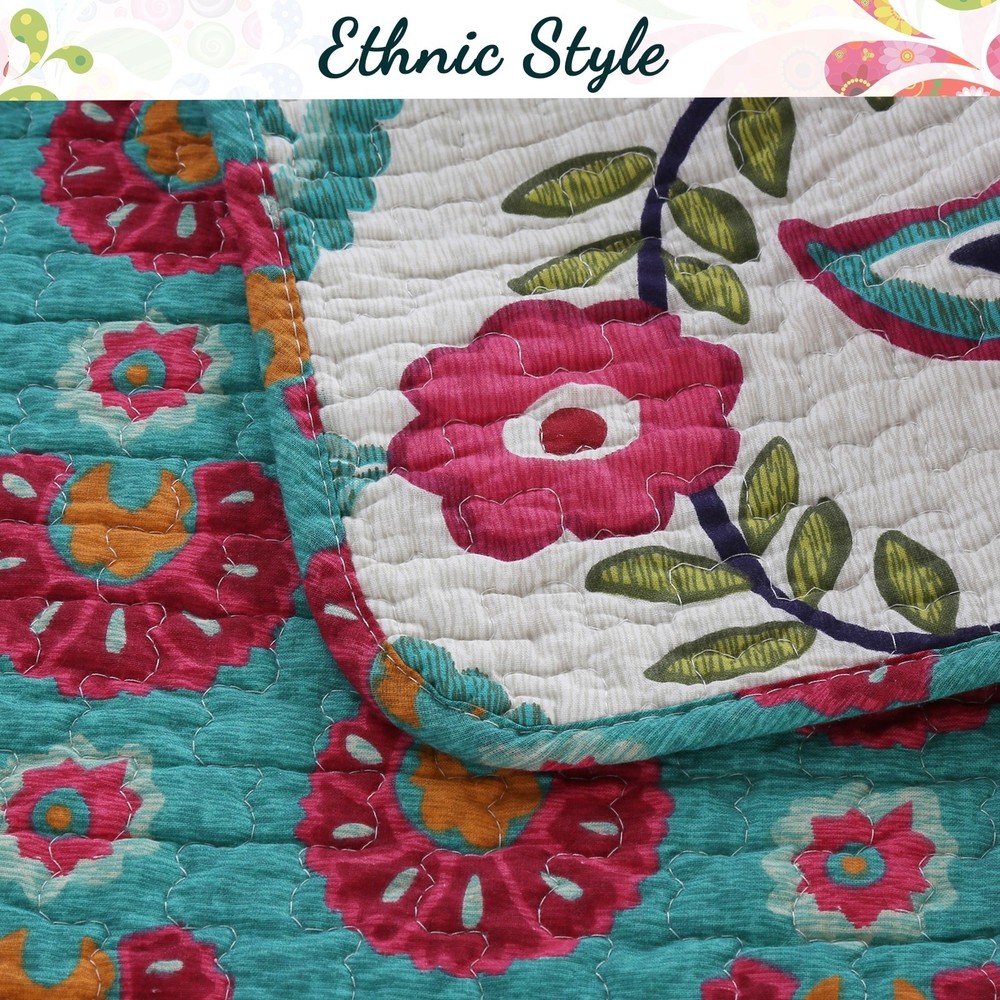 Brighten up your home décor with this Cozy Line Santa Barbara Floral Print Reversible Cotton Quilt Set. The beautiful and cheerful floral print in shades of fuchsia pink, turquoise blue, grass green, vibrant orange, and red on a white background will refresh your room instantly. Made of 100-percent cotton, the set includes one reversible quilt and two shams (one sham in twin set), with a patchwork floral embroidered pattern. Machine washable for easy care.Features: 100-percent cotton cover, fill, and backing Reversible quilt set with beautiful floral print Patchwork floral embroidered pattern Machine washable for easy care Available in twin, queen, and king sizesTwin: Quilt: 68 inches wide x 88 inches long 1 Standard Sham: 20 inches wide x 26 inches longQueen: Quilt: 88 inches wide Free Shipping Over $49.99* Details Cozy Line Santa Barbara Floral Print Reversible Cotton Quilt Bedding Set Product Description: Brighten up your home décor with this Cozy Line Santa Barbara Floral Print Reversible Cotton Quilt Set. The beautiful and cheerful floral print in shades of fuchsia pink, turquoise blue, grass green, vibrant orange, and red on a white background will refresh your room instantly. Made of 100-percent cotton, the set includes one reversible quilt and two shams (one sham in twin set), with a patchwork floral embroidered pattern. Machine washable for easy care. Features: 100-percent cotton cover, fill, and backing Reversible quilt set with beautiful floral print Patchwork floral embroidered pattern Machine washable for easy care Available in twin, queen, and king sizes Twin: Quilt68 inches wide x 88 inches long 1 Standard Sham20 inches wide x 26 inches long Queen: Quilt88 inches wide x 92 inches long 2 Standard Shams20 inches wide x 26 inches long King: Quilt106 inches wide x 92 inches long 2 King Shams20 inches wide x 36 inches long NoteThe digital images we display have the most accurate color possible. However, due to differences in computer monitors, we cannot be responsible for variations in color between the actual product and your screen.