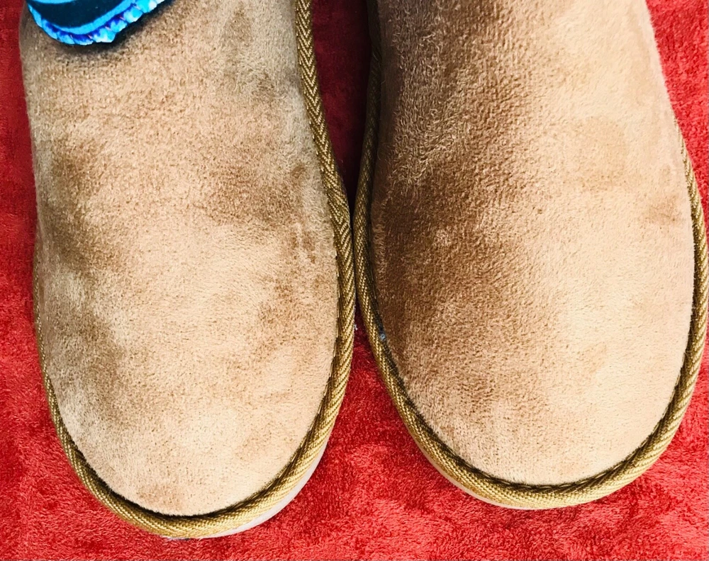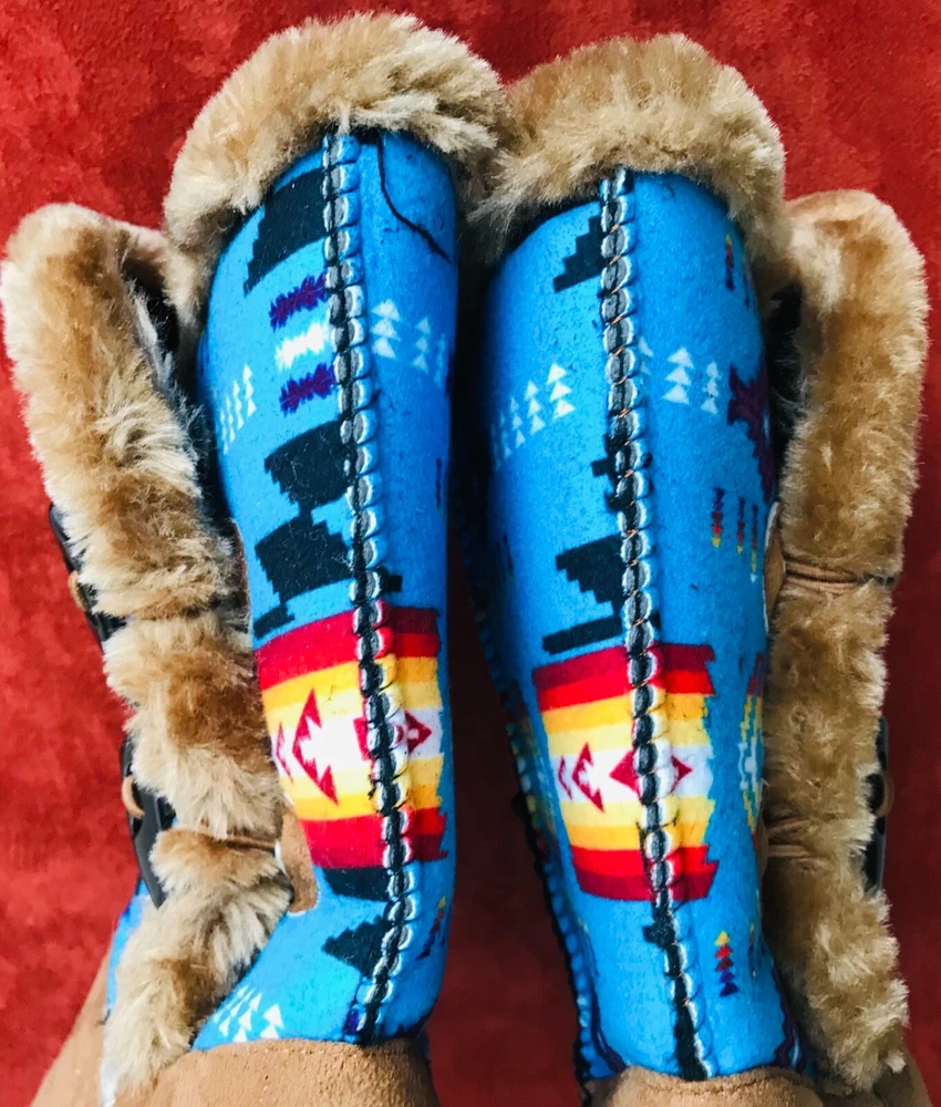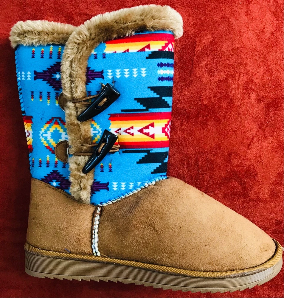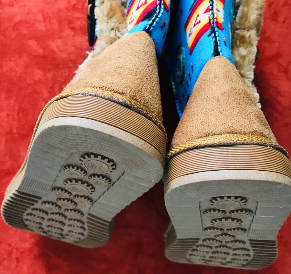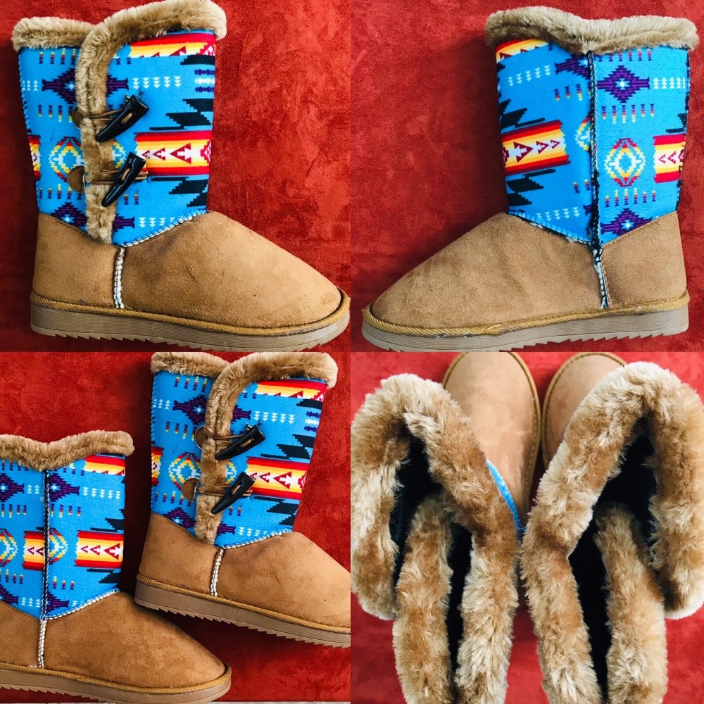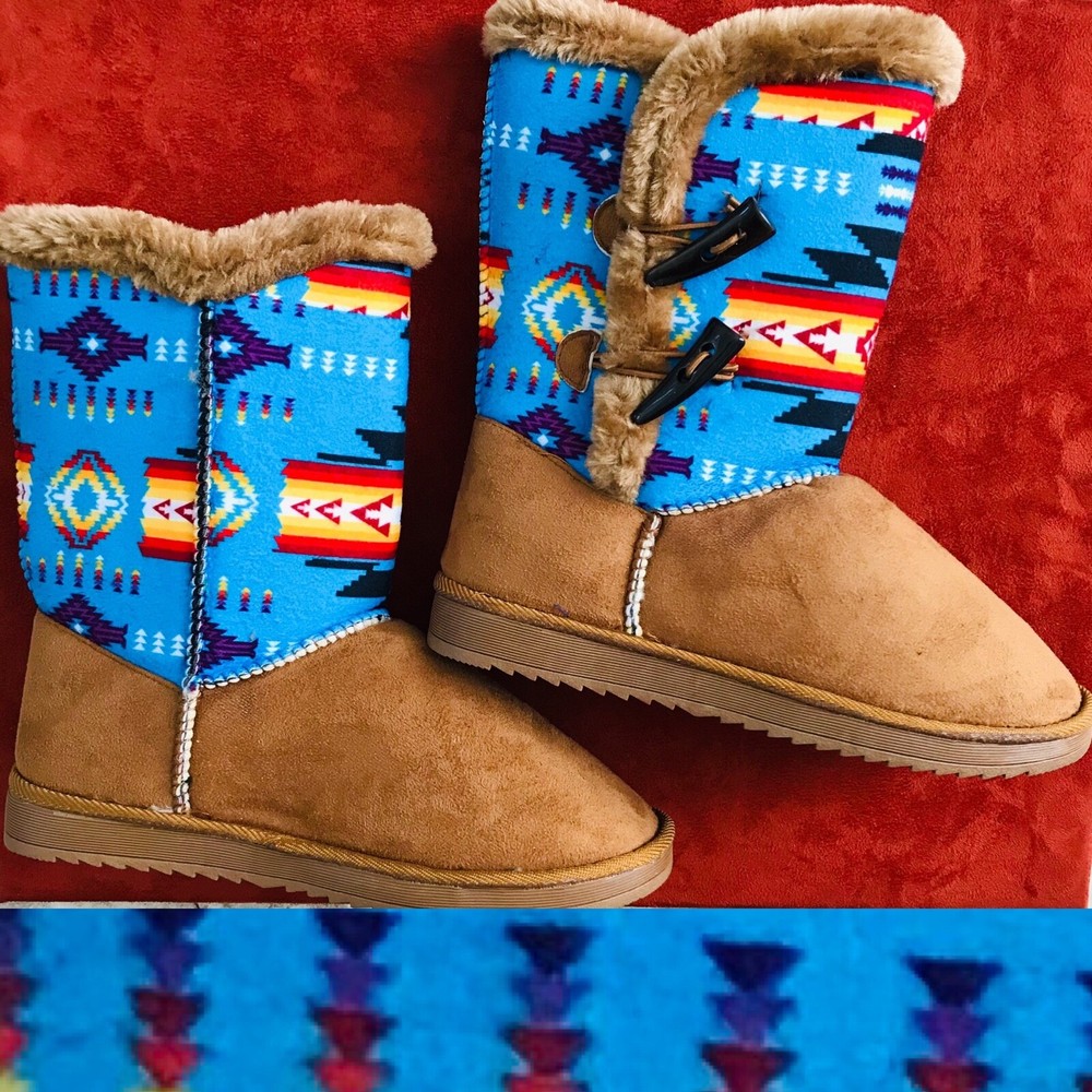 This is a unique pair of new-without-tags Ibiza-style boots size 40 (approximately size 9 1/2 US, see measurements). These boots have faux suede uppers in brown and colorful southwestern print with two large faux bone buttons on each that undo with elasticized fastenings. Soles are rubber, interiors are thick pile faux fur. Approximate measurements are 9 3/4 inches long from heel-to-toe of sole, 4 inches wide at widest point of sole, 10 inches tall. This is my only pair, don’t miss them!