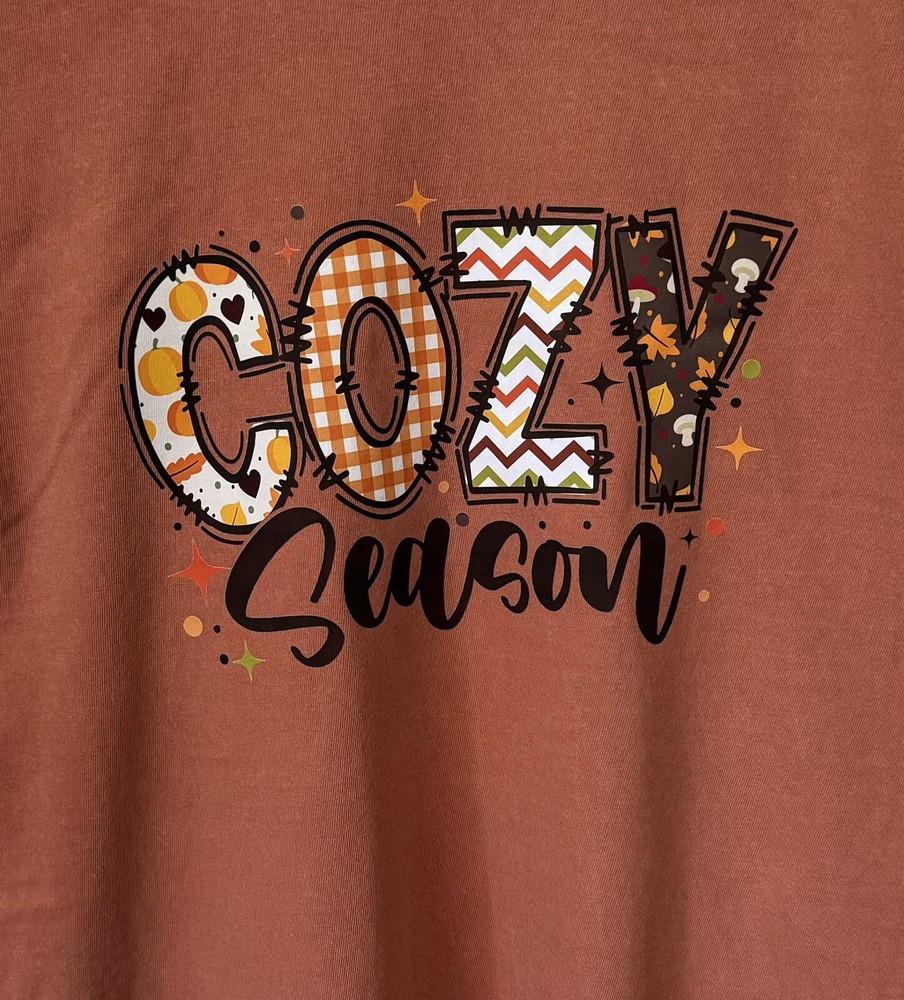 Cozy Season fall T-shirt comfort color yam 100% cotton unisex T-shirt size Large I do carry sizes small to extra large. Please message me for a different size or color machine washable inside out on cold tumble dry low or hang dry. Comfort colors Yam as pictured Blue spruce Ivory Pepper Crimson Yam