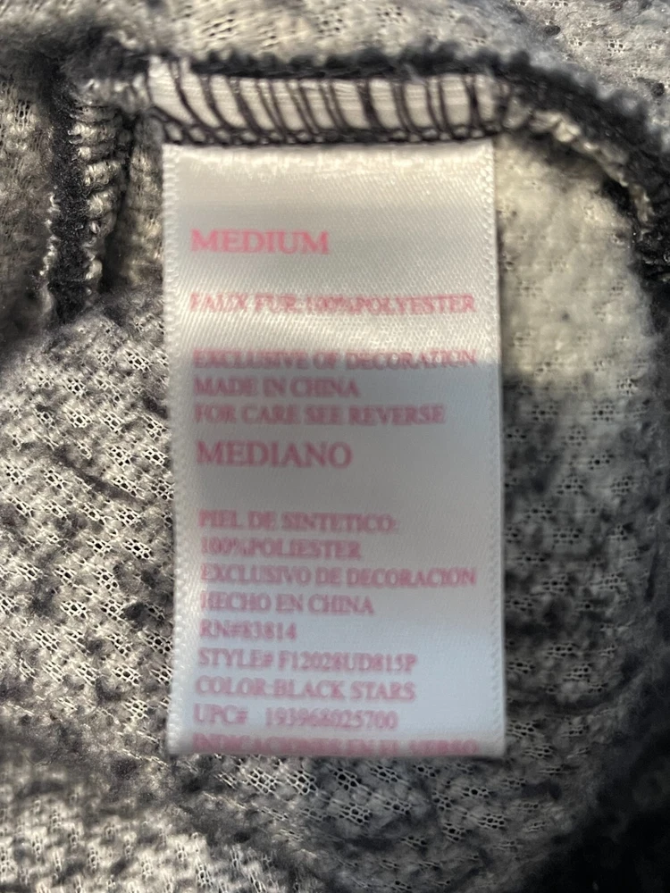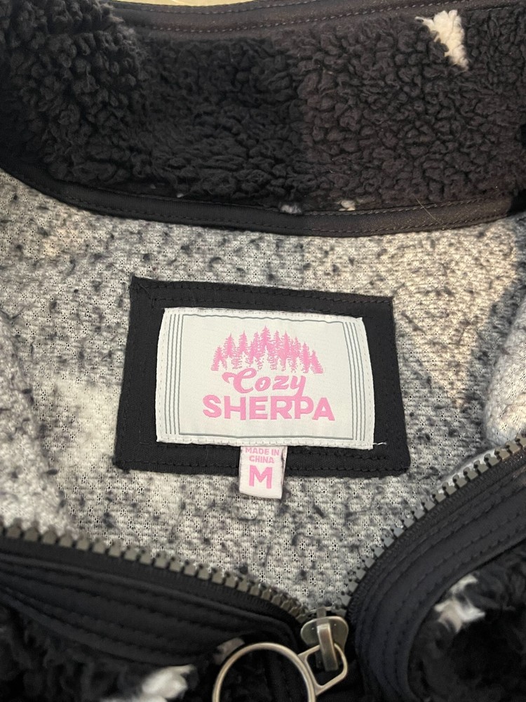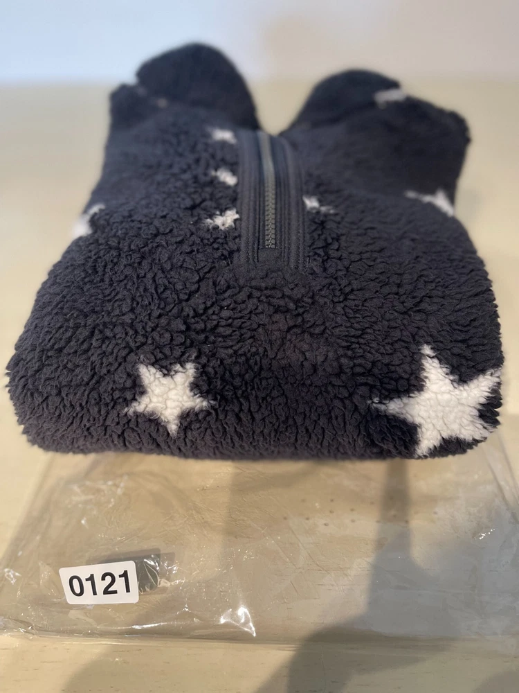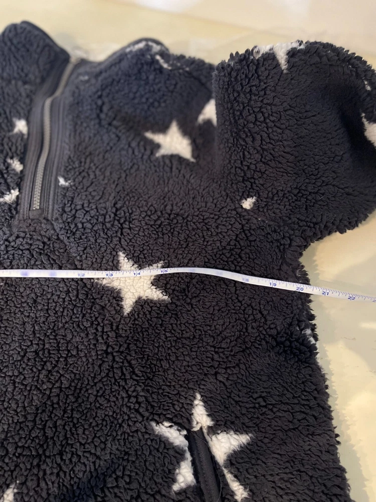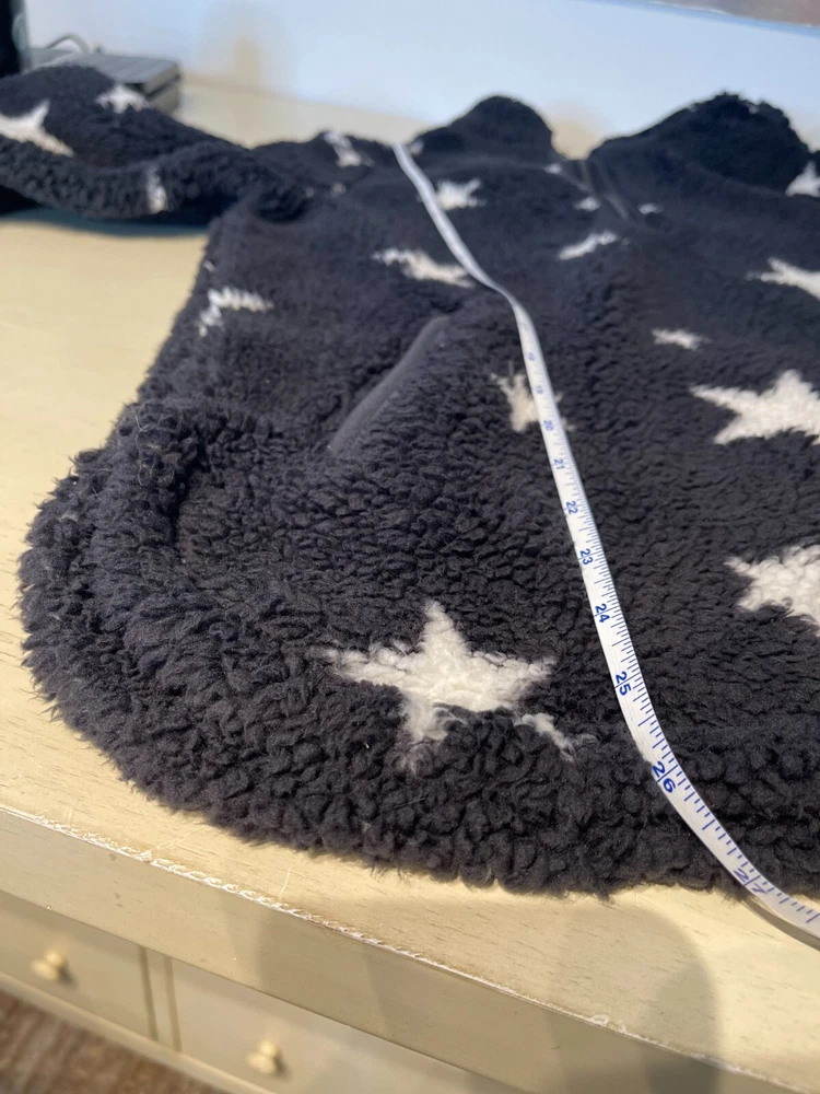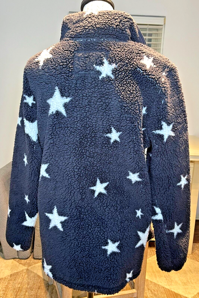 Stay cozy and stylish with this women's Sherpa pullover in navy blue with white stars. The pullover features long sleeves and a 1/4 zipper closure with large front pouch, making it perfect for both active and casual occasions. The chest size is 20 inches and the size is medium, with a regular fit that flatters the figure. Made from 100% polyester fleece, the pullover is machine washable for easy care. The pouch lining material is polyester, and the fabric type is fleece, providing both warmth and comfort. Shop now and enjoy the comfort and style of this Sherpa pullover!