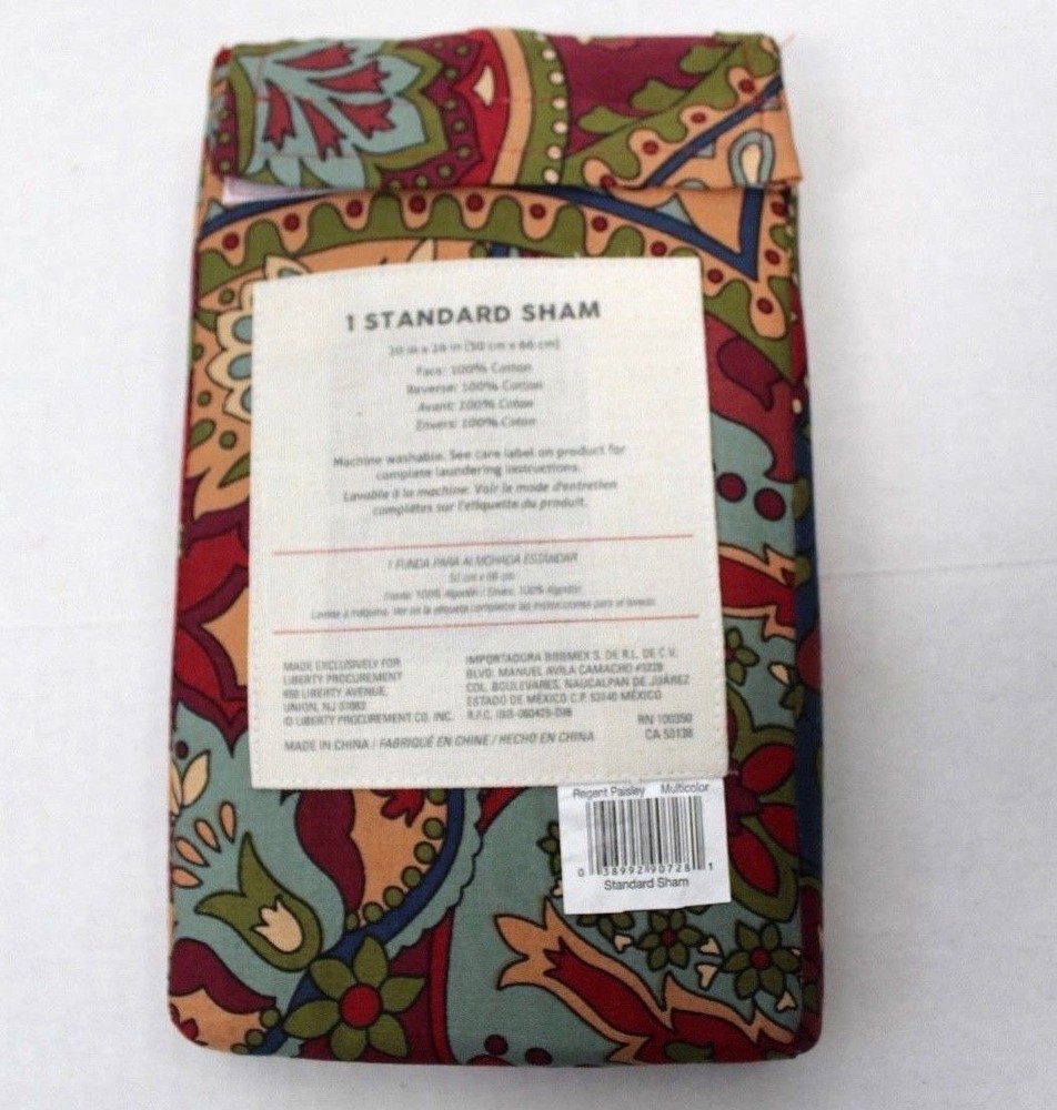Brand new in package Cozy Shop Regent Paisley Multicolor One Cotton Standard Sham Includes: One Standard Sham 20 in x 26 in Add a pop of color to your bedroom with the fun Cozy Regent Paisley Standard Pillow Sham. Cozy Regent Paisley Standard Pillow Sham features a printed paisley pattern with beautiful multi colors of reds, purples, greens and aqua 20 x 26 Inches 100% Cotton Machine Wash Sham only, NO Pillow Brand: COZY SHOP From a smoke and pet free environment