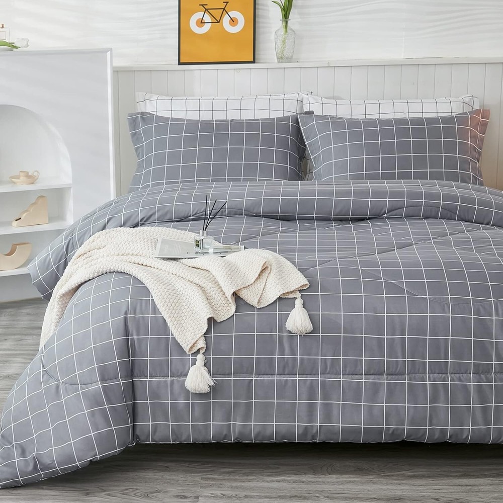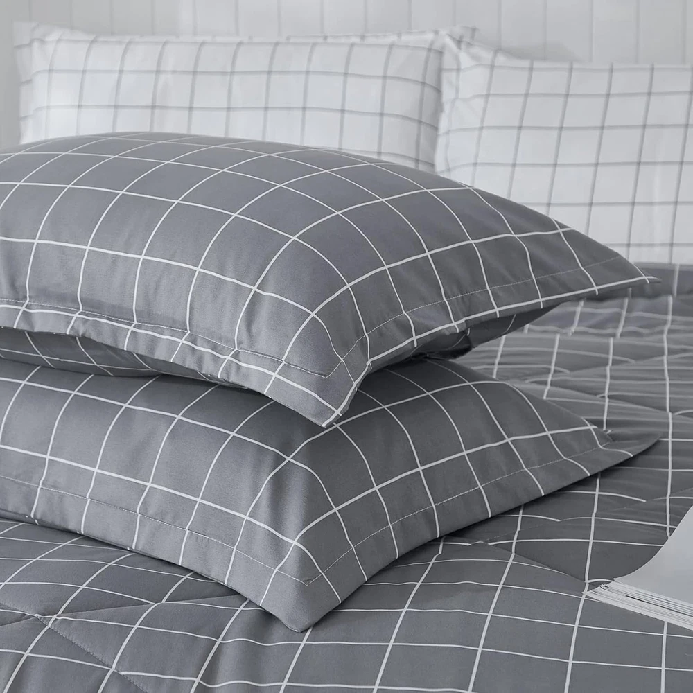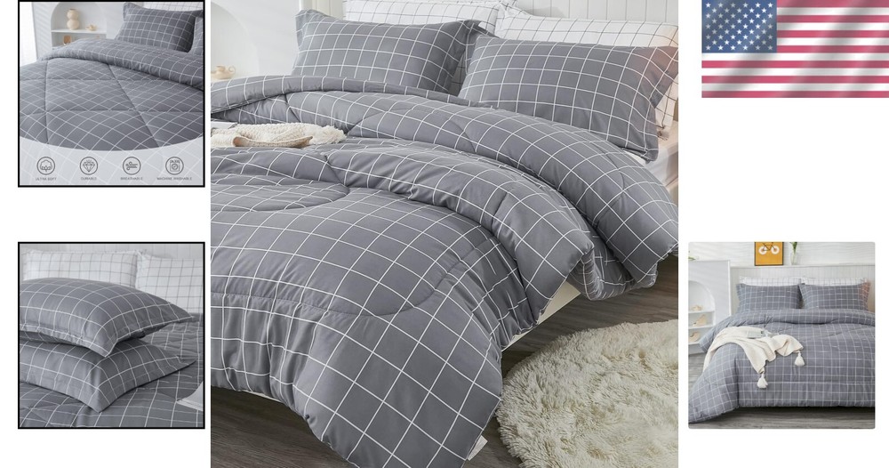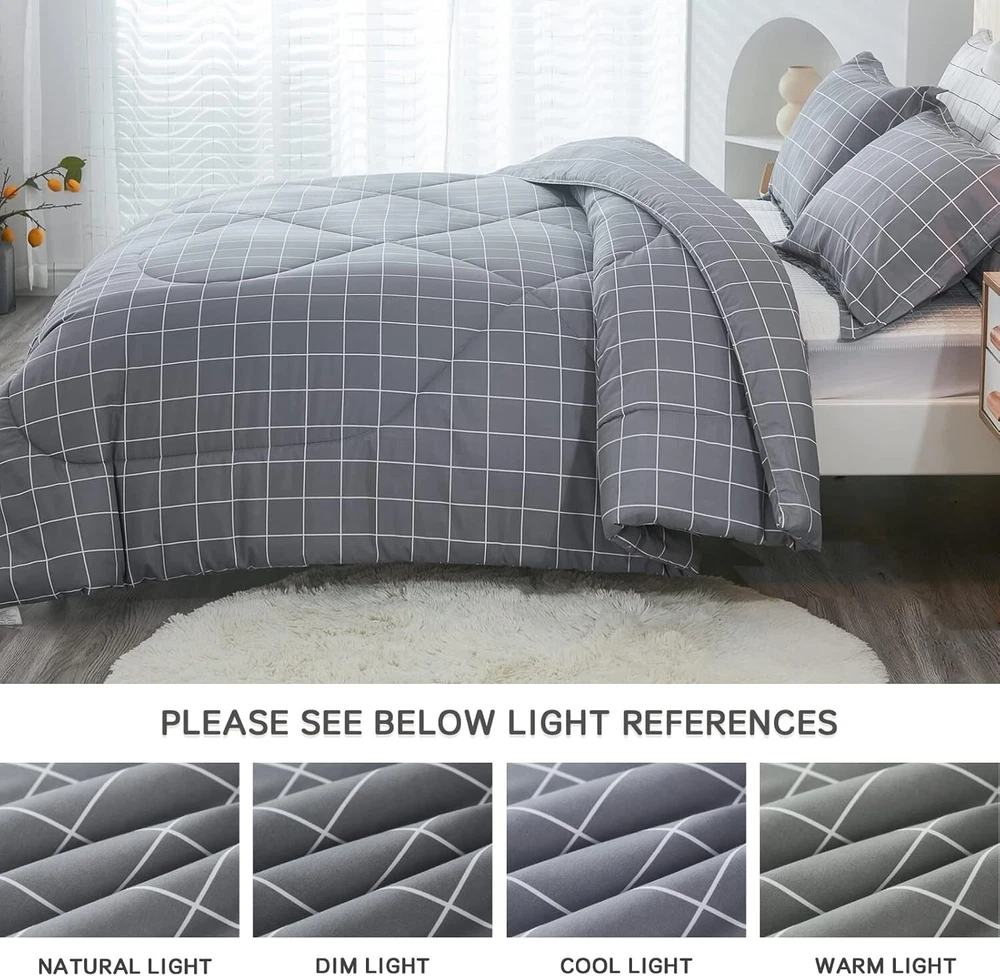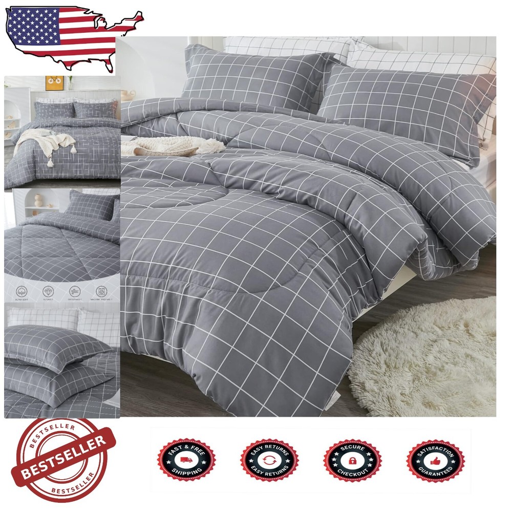 This comforter set is a game-changer! The soft microfiber feels luxurious, and the lightweight warmth is perfect for year-round comfort. The stylish grey grid pattern adds a modern touch to any bedroom, while the expert stitching ensures long-lasting quality. Washes beautifully and stays fluffy—so cozy, I never want to leave my bed! Highly recommend for anyone wanting affordable luxury.