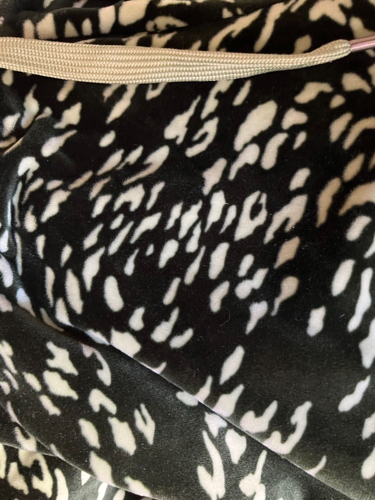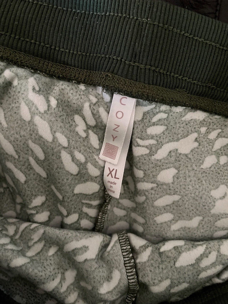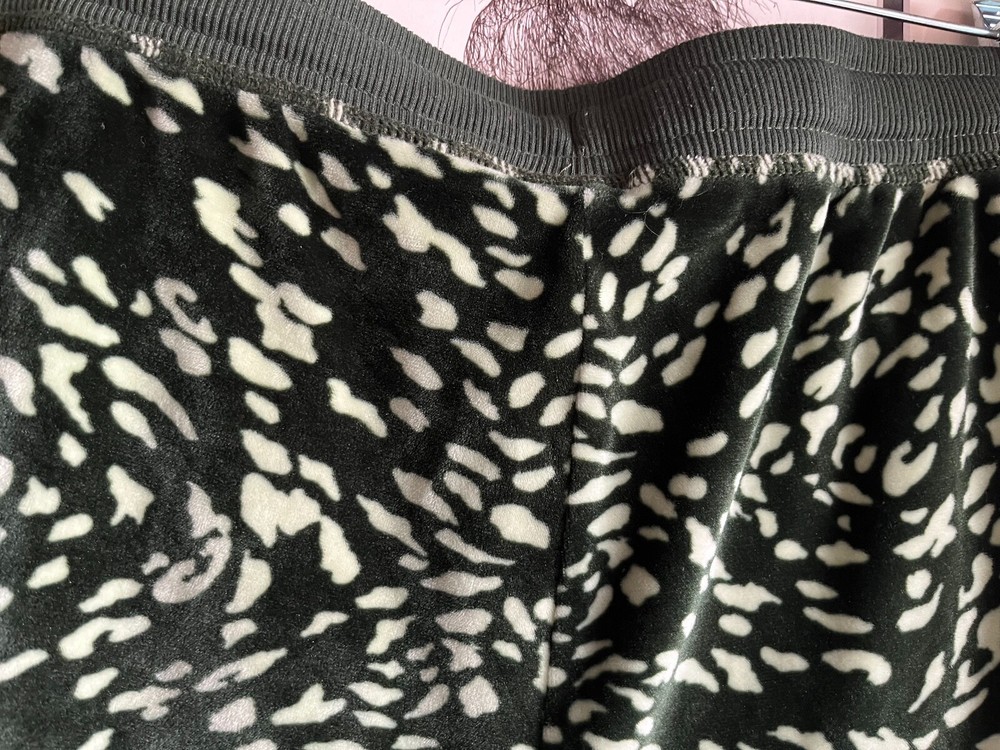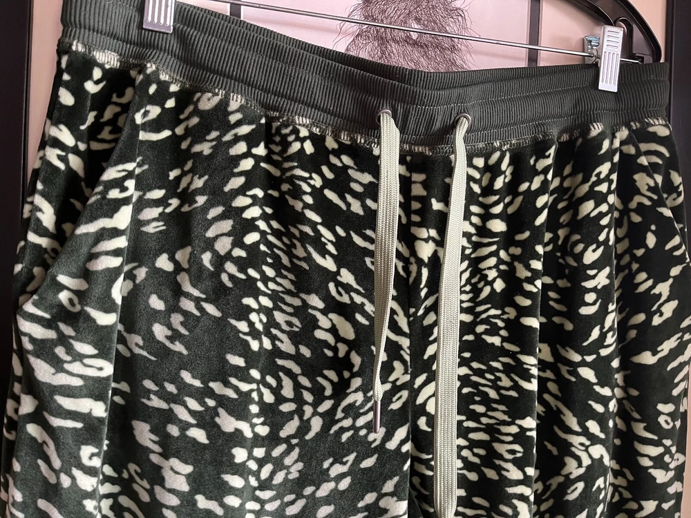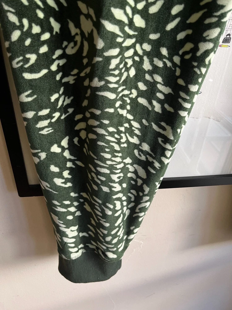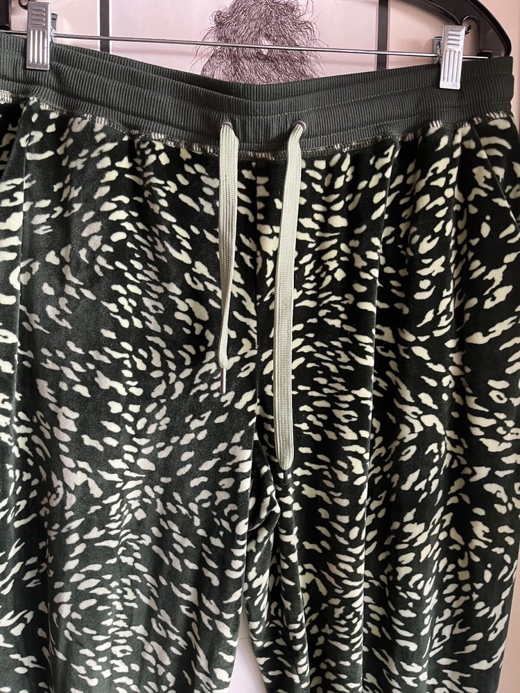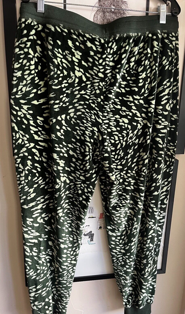 From Cozy in poly and spandex two tone animal print in green velour. Pull on waist with drawstring and ribbed dark green banded ankles and waist. On seam to front pockets and barely enjoyed if at all. Marked XL. Inseam about 29 with rise in front about 12. 34 waist and almost 48 hip area all without any stretching. Perfect for lounging at home and even running out to the store.