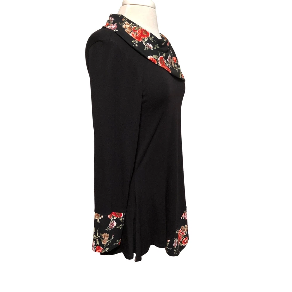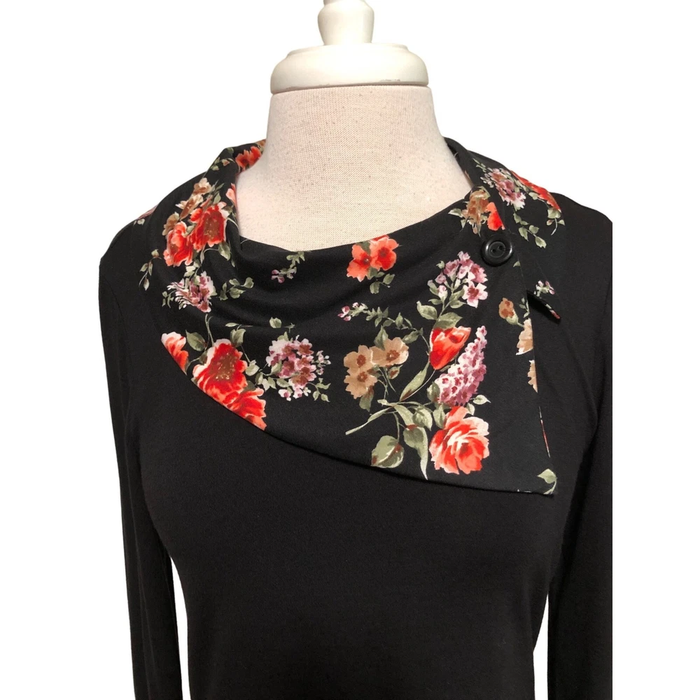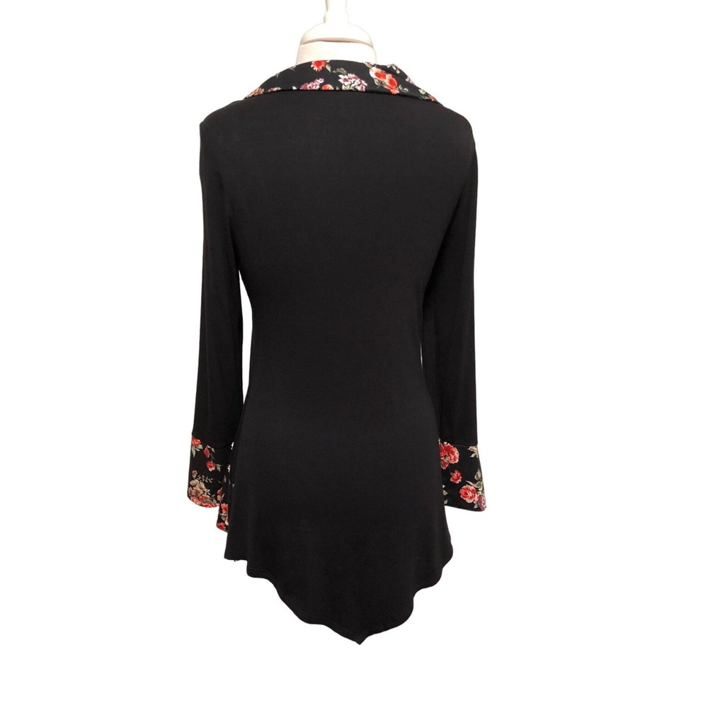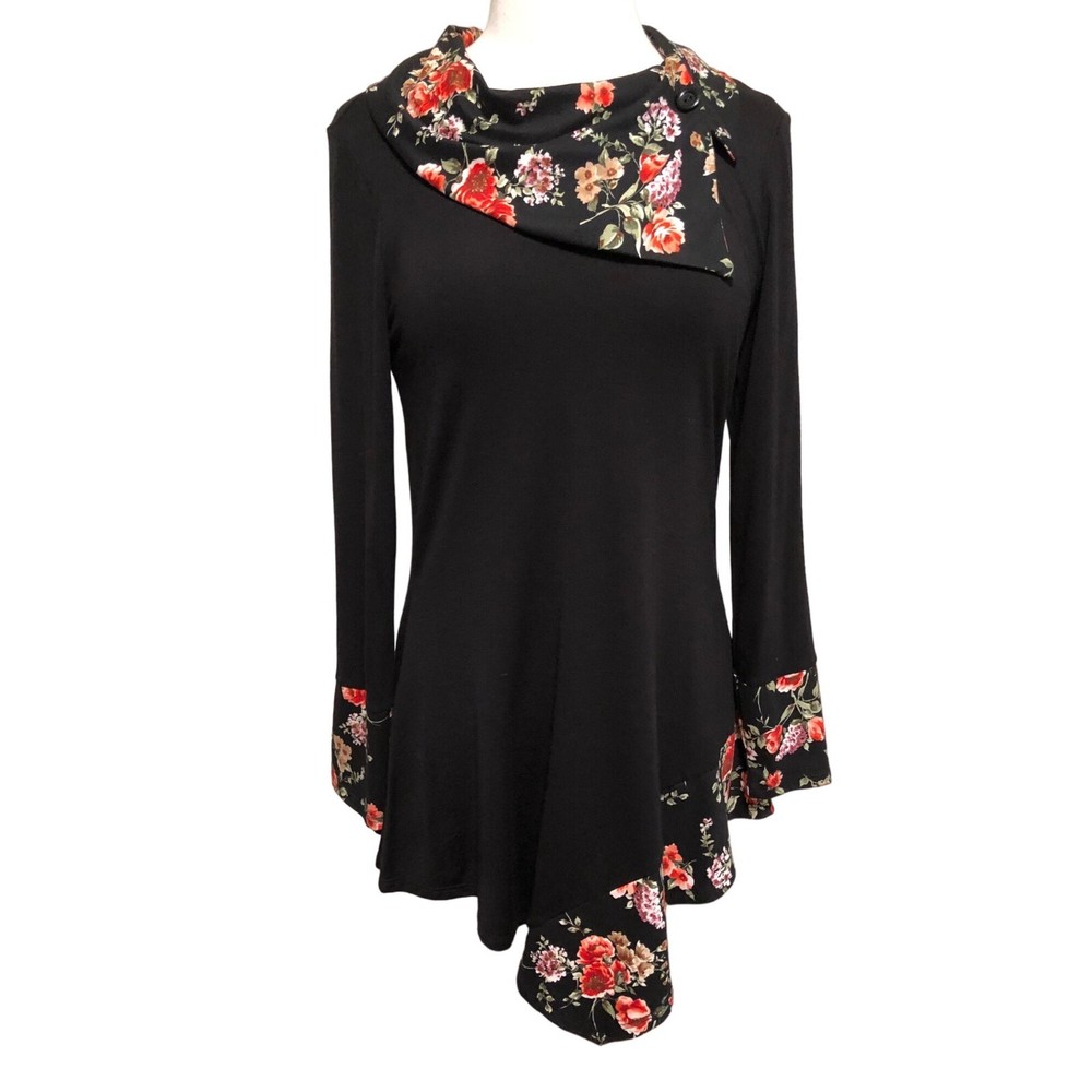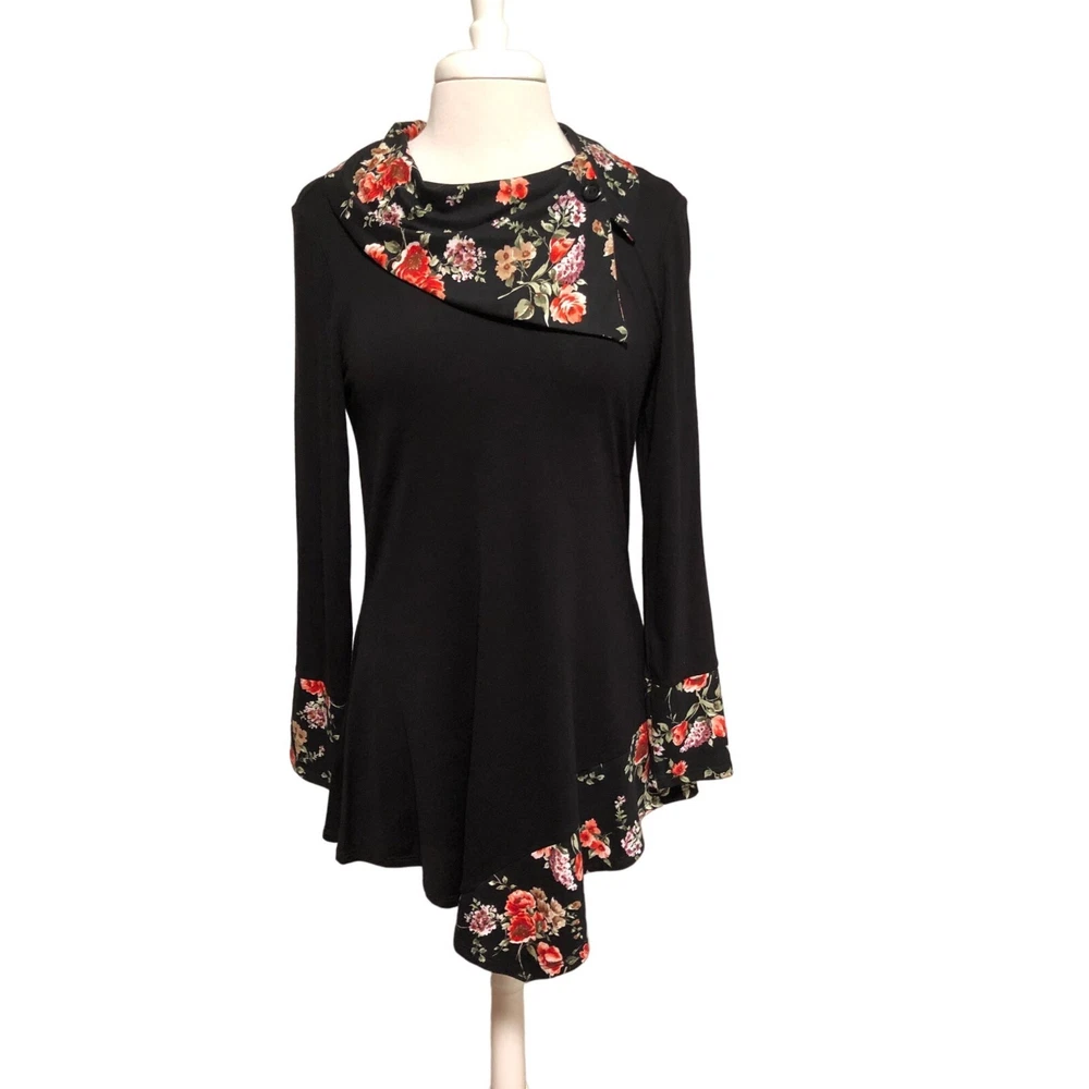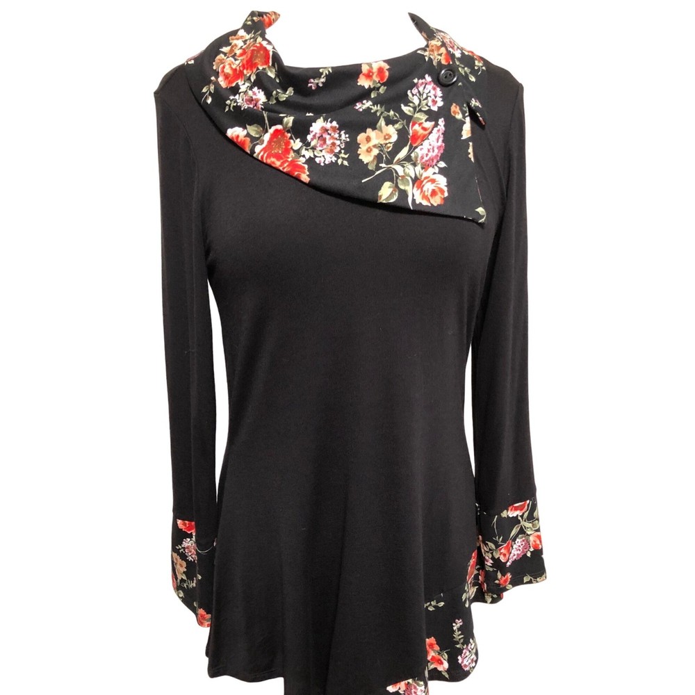 Cozy Collection black tunic top with contrasting floral collar and sleeves Faux button on collar Size small Made of 93 percent rayon 4 percent metallic and 3 percent spandex Measures bust 36” length 34”