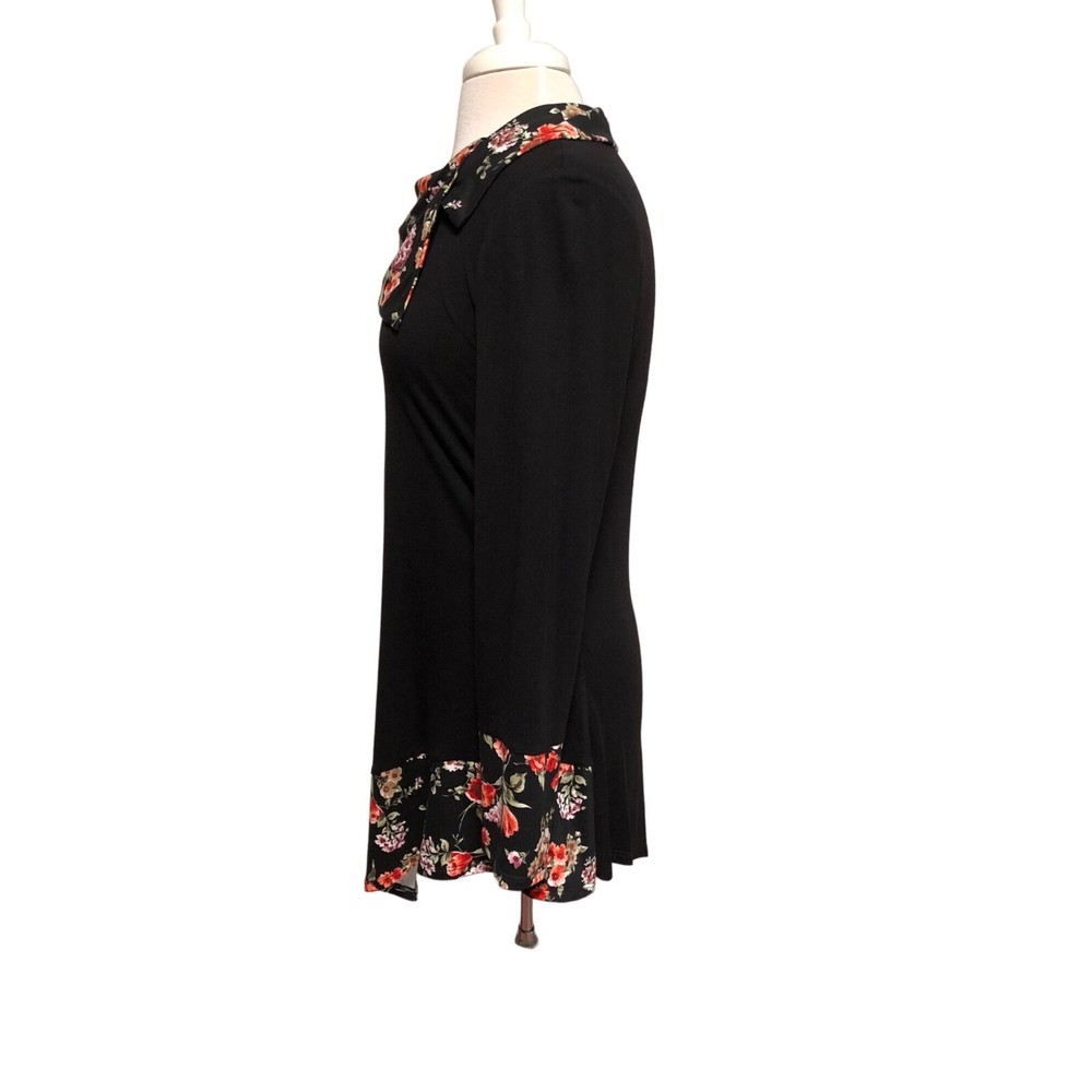 Cozy Collection black tunic top with contrasting floral collar and sleeves Faux button on collar Size small Made of 93 percent rayon 4 percent metallic and 3 percent spandex Measures bust 36” length 3...