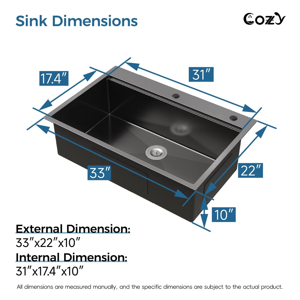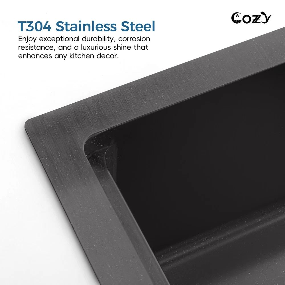 Cozy N Bath Stainless Steel Kitchen Sink. The robust nature of brushed stainless steel ensures long-lasting performance, scratch-resistant and timeless aesthetic. SUS304 Stainless Steel Drop-in Installation Large-Capacity Single Bowl Built-in Ledges X-channel Grooves Rounded Corners Anti-Dripping Coating Soundproof Pads Rear-center Set Drain