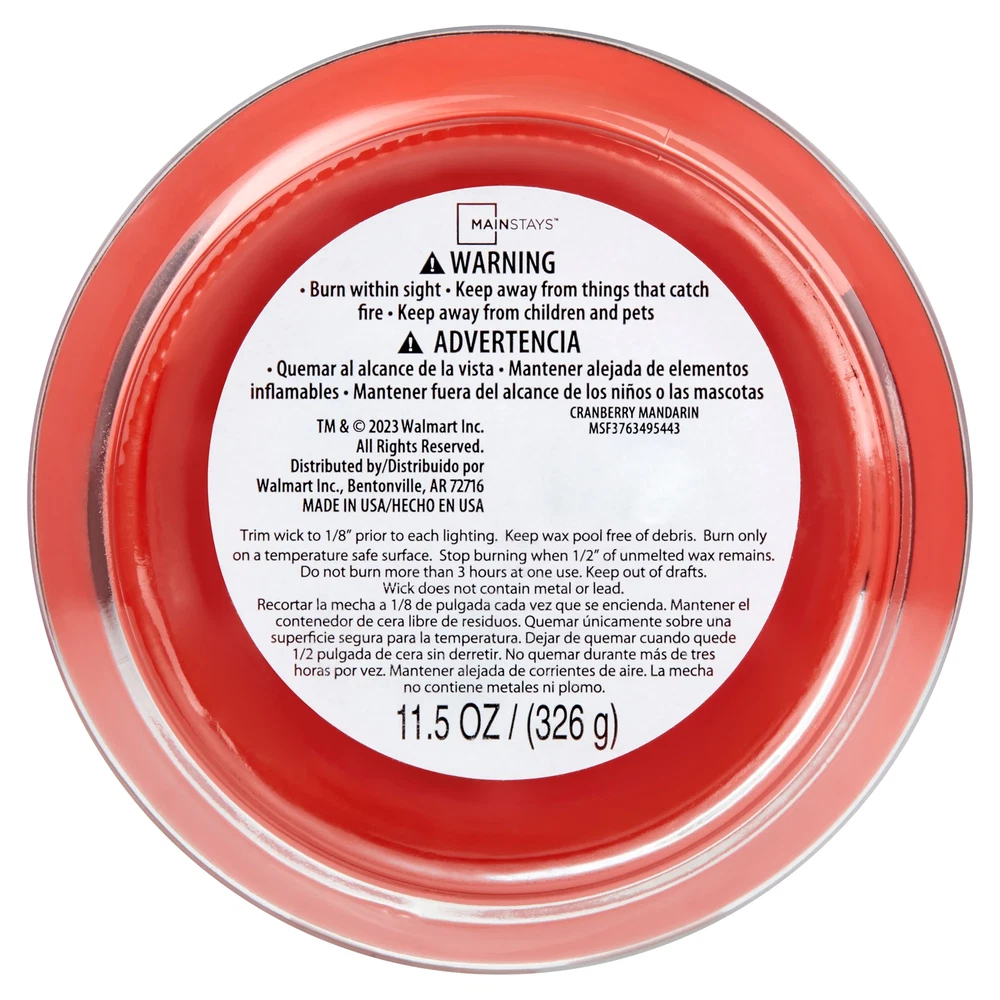 Introduce a soothing aroma into your living space with Mainstays candles. Mainstays scented candles are highly fragranced, and provide a clean and even burn that will fill your home with beautiful and enticing seasonal aromas. Place this candle in the kitchen, living room or dining room where you can enjoy it when entertaining guests or anytime you want to relax. Trim the wick periodically to promote even burning. Mainstays offers a wide selection of candle scents to explore and enjoy. Shop all of our Mainstays scents online and in-store. Mainstays Cranberry Mandarin Scented 3-Wick Glass Jar Candle, 11.5 oz. Mainstay Cranberry Mandarin fragrance, contains sun-ripened cranberries embellished with tangy hints of fresh currant, juicy raspberry, and sparkling mandarin. This fragrance has been a staple in households and a favorite for many years. This fragrance would fall in the FRUIT category. Premium-grade paraffin wax blended with premium quality ingredients to create distinctive true-to-life scents Clear glass container complements virtually any room décor and provides just the right amount of illumination with a 3-wick design Pleasant scent for a relaxing environment without becoming overpowering. Helps improve concentration, mood, and positive thinking Product measures 4.12" D x 3.2" H Product weighs 1.37 lbs