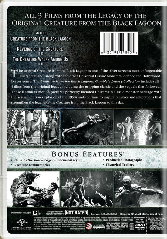 Creature from the Black Lagoon Complete Legacy Collection DVD Richard Carlson Product | GRUV Home DVD Blu-ray 4K Gruv > Creature from the Black Lagoon Complete Legacy Collection DVD Richard Carlson [Back] Creature from the Black Lagoon Complete Legacy Collection DVD Richard Carlson The original Creature from the Black Lagoon is one of the silver screen's most unforgettable characters and, along with the other Universal Classic Monsters, defined the Hollywood horror genre. The Creature from the Black Lagoon: Complete Legacy Collection includes all 3 films from the original legacy including the gripping classic and the sequels that followed. These landmark motion pictures perfectly blended Universal's classic monster heritage with the science-fiction explosion of the 1950s and continue to inspire remakes and adaptations that strengthen the legend of the Creature from the Black Lagoon to this day. Product Creature from the Black Lagoon: Complete Legacy Collection (DVD + Movie Cash) [DVD] Format: DVD Catalogue No: 61163325 Studio: Universal Certification: G Release Date: 02/03/15 Region: Region 1 Duration: 241 minutes Discs: 2 Color: B/W Sound: DOLBY DIGITAL 2.0 - English Extras: Language(s): English|Subtitles: English SDH|Interactive Menu|Screen ratio 1:1.85|Dolby Digital 2.0 Extras: Documentaries: Back To The Black Lagoon Shipping *** FREE SHIPPING ON ALL ORDERS *** All items ordered before 11:00am EST will be shipped on the same day. Items ordered after 11:00am EST will be shipped on the following day. Orders placed after 11:00am EST on Friday will be shipped on the following Monday. If you have any questions regarding your order, please contact us How will I know when my order has been shipped? As soon as your order is sent from our warehouse you will be sent an email to confirm that it's on its way. Once my order has been shipped when will I receive it? Depending on your method of shipping, your timing will vary: Economy Shipping - you will receive your order in 3-10 days Expedited Shipping - you will receive your order in 1-5 days Next Business Day - you will receive your order in 1 Business day. This service is only available on orders placed Monday through Thursday The timeliness of service to destinations outside the contiguous U.S. may be affected by the limited availability of transportation. Due to the variability of transportation, Package Services and USPS Mail packages may take up to two to five weeks to reach Hawaii, Alaska, Puerto Rico and any U.S. Territories. This includes ZIP Codes with prefixes of 967 and 969 and those with the following prefixes: 995, 996, 997, 998, 999, 968, 006, 007, 008, and 009 Do you charge for shipping? *** FREE SHIPPING ON ALL ORDERS *** Economy Shipping - USPS Media Mail - FREE - 3 to 10 business days Expedited Shipping - FedEx Ground - $5.99 - 1 to 5 business days Next Business Day - FedEx Overnight - $14.99 - 1 business day PLEASE NOTE THAT ORDERS PLACED USING FEDEX CANNOT BE DELIVERED TO PO BOXES What do I do if I have not received my order? If your order does not arrive within 14 days please contact us so that we can investigate with the delivery company. One of the items is missing from my order. What do I do? Sometimes items that are purchased on the same order may arrive to you on different days. We will send you an email to let you know when each item is on its way. What happens if I am not at home to accept my delivery? Most of our products do not require you to be at home to be delivered. In the event that you have ordered products which will not fit in your mailbox, and you are not home to accept the delivery, then the postal service will follow their usual procedure. This usually means a card is left to notify you of an attempted delivery and the item will be held at your local sorting office. For items sent via FedEx, a card should also be left to allow you to arrange a redelivery or collection. Which countries do you deliver to? We deliver to the United States and US territories. Do you deliver on Public Holidays? Holidays are not considered working days, so we don't include these in our estimated delivery times. In this instance you should expect delivery on the next working day following the Holiday. Returns Here at GRUV Entertainment we want you to be 100% happy with your purchase, and we'll do everything we can to make sure you are. If you would like to return a product to us, please contact us. How do I return an item? To arrange a return please contact us and we will be more than happy to arrange this for you. All you need to tell us is which items you wish to return and the reason why. We will then issue you a unique Returns Authorization (RA) number and the return instructions. I have received my item, but I no longer want to keep it? If you are unhappy with your purchase, please contact us within 30 days of receiving the item for a full refund - please note that DVDs, Blu-rays & 4K Ultra HD that have been opened or have had their shrink-wrap removed are not eligible for return. The cost of shipping to return a product you no longer require will be paid for by the person returning the product and will require a Returns Authorization (RA) number. The RA number will be given to you by our customer services team. I have received my item but it's damaged / faulty. What should I do? If your item arrived damaged or is faulty, we will make this right as soon as possible, either by sending a replacement item to you or refunding your account. If we ask for the item to be returned to us, then GRUV Entertainment will pay for the cost of the return via a pre-paid label. In the unlikely event that your order is received damaged or faulty, all you need to do is contact us within 30 days of receiving the item and we will provide you with the relevant returns information. I have received an item that I did not order. What should I do? If you received an item that you did not order, you can return it to us within 30 days of receiving it for
