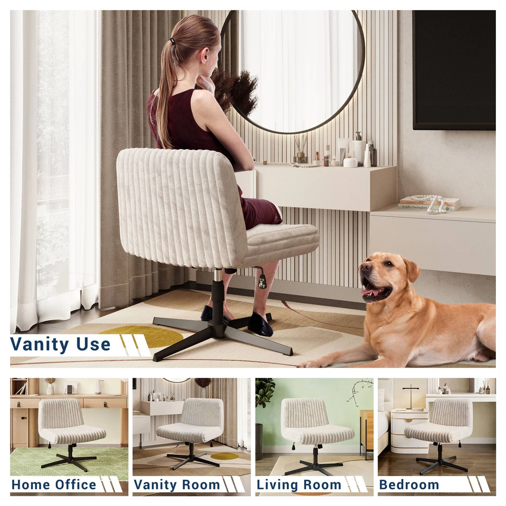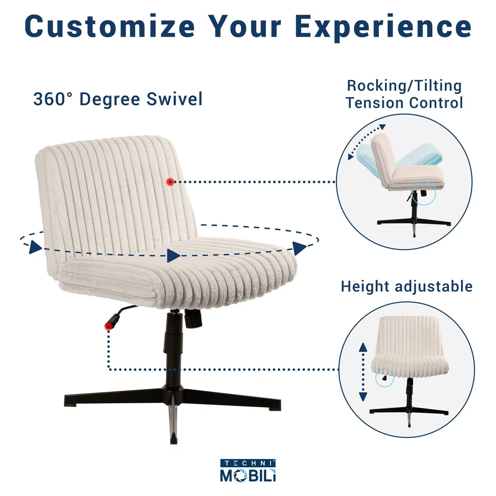 Specifications Place of Origin China Main Color taupe Main Material Fabric,Foam,Steel Product Style Modern Use Case Office Chair Type Office Chairs Special Features Adjustable Height Chair Back Style Solid Back Dangerous Goods #dangerFlag# Dimensions & Weights Assembled Length (in.) 28.25 Assembled Width (in.) 27.00 Assembled Height (in.) 30.00 Weight (lbs) 26.75 Product Features Spacious & Comfortable Seat: Enjoy the freedom to sit in multiple positions with the extra-wide 26' seat, perfect for sitting criss-cross or lounging in comfort. Soft & Luxurious Plush Material: Crafted with plush upholstery, this chair has a smooth, soft-to-touch surface offering a cozy chair ideal for extended periods of sitting Enhanced Ergonomic Design: The foam-padded seat and back provide excellent support, ensuring that you can work, relax, or sit comfortably without strain. Height Adjustable with Tilt Tension Control: Easily adjust the chair’s height and utilize the tilt tension control to rock back and relax. 360-Degree Swivel for Easy Mobility: Rotate in any direction with the chair’s 360-degree swivel, perfect for dynamic workspaces or relaxed environments. Stable Base with No-Slip Rubber Pads: The chair’s stable base can hold up to 250 lbs and has non-slip rubber pads keep it securely in place, offering a solid foundation whether you choose to move it around or keep it stationary. Dimensions: 28.25” W x 27” D x 30 – 34” H / Weight Capacity: 250 lbs. Ships in 1 box. Description Techni Mobili Criss Cross Chair - Extra Wide Home or Office Chair Introducing the Criss Cross Chair—designed for ultimate comfort. This comfy, plush foam padded chair has an extra-wide 26' seat, perfect for sitting cross legged or lounging freely. Rock