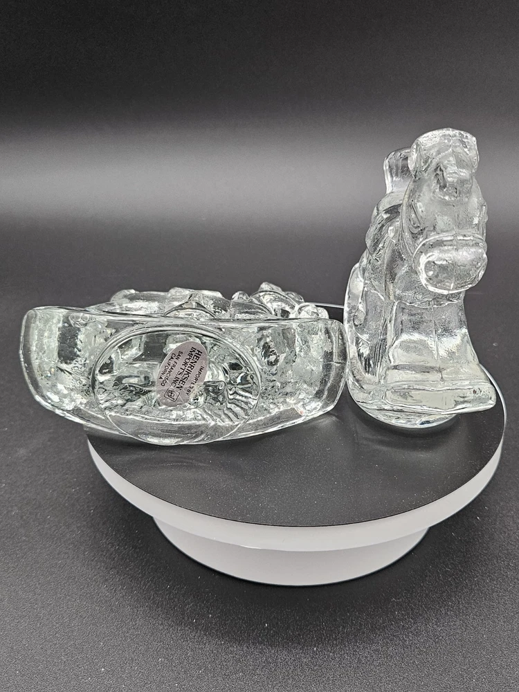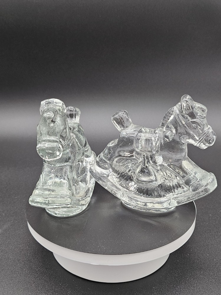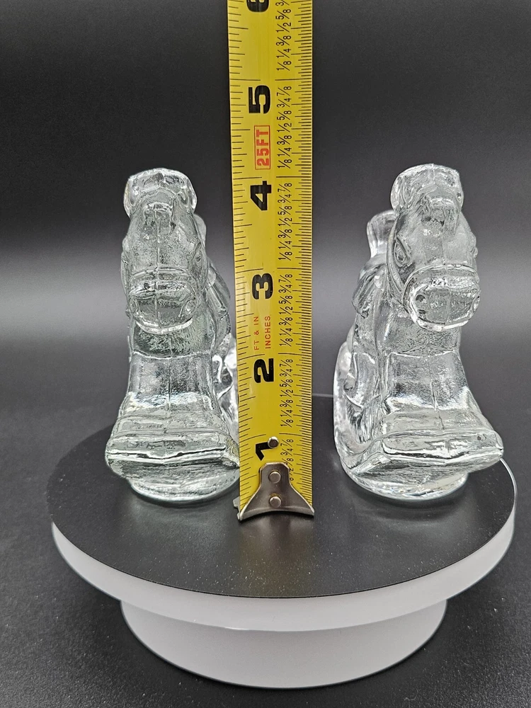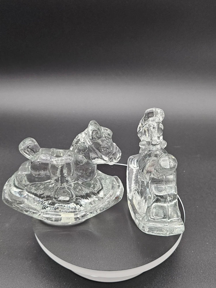 Add a touch of elegance to your home decor with this set of two crystal rocking horse candle holders from Henriksen Imports of San Francisco. These medium-sized candle holders are perfect for all occasions and feature a beautiful horse pattern that is sure to impress your guests. The clear glass material and crystal accents give these candle holders a unique and stylish look that will complement any room in your home. These candle holders come in a set of two, making them a great addition to your collection of decorative collectibles. The rocking horse shape and animal subject make them a perfect gift for a baby shower or animal lover. With a brand name like Henriksen Imports of San Francisco, these candle holders are a must-have for any collector.