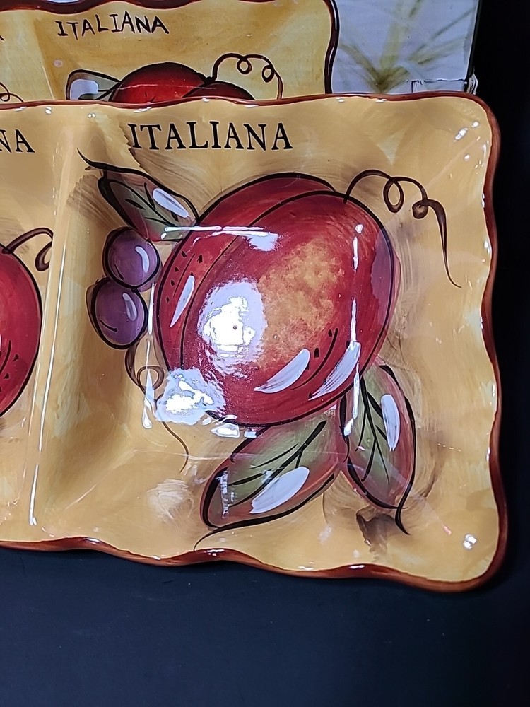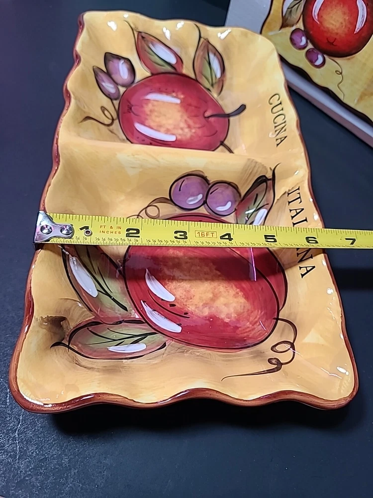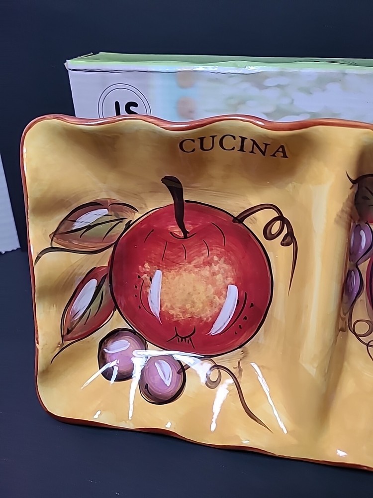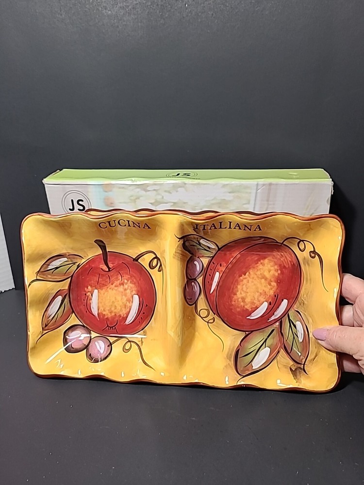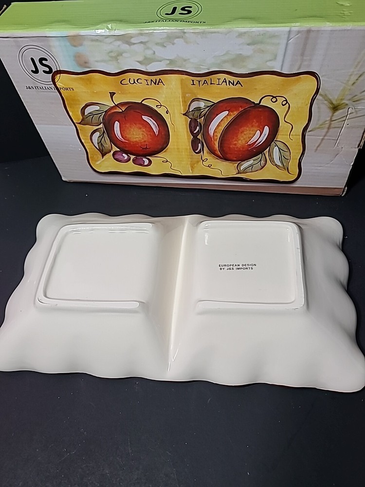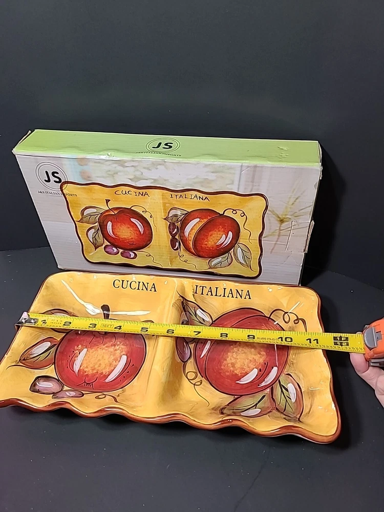 Presenting the Cucina Italiana Fruits Design Ceramic Divided Appetizer Serving Platter by J&S Italian Imports. This exquisite platter has a rectangular shape and comes in a beautiful multicolor design featuring fruits. It has two compartments for serving appetizers and snacks and is made of high-quality ceramic material. The platter is an original piece and bears a printed backstamp. It measures 11.5 inches in length, 6 inches in width, and 2 inches in height. It weighs 2 pounds and is perfect for serving guests at any occasion. Get your hands on this stunning piece of pottery & glass from Italy and add a touch of elegance to your dining table.