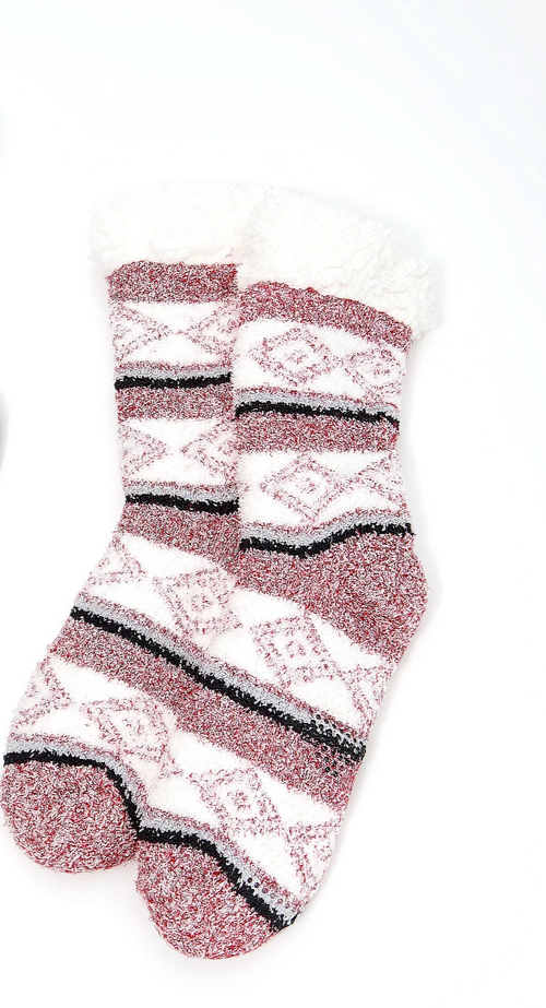 Ideal for snuggling up on a snowy day or keeping cozy on a wintry weekend, these sherpa-lined, non-slip slipper socks offer up comfort and warmth. From Cuddl Duds. Features: contrast heel and toe, faux sherpa lining and cuff, non-slip grippers Content: shell 96% polyester/1% spandex/3% other fiber; lining 100%polyester, exclusive of elastic Care: machine wash, tumble dry Imported *We offer a shipping discount for qualifying combined orders.* Combined shipping for this item will be $3.00 COMBINED SHIPPING COSTS ARE CALCULATED WITH THE FULL AMOUNT OF THE HIGHEST SHIPPING COST ITEM FIRST - AND THEN ADDITIONAL SHIPPING DISCOUNTS ARE ADDED.