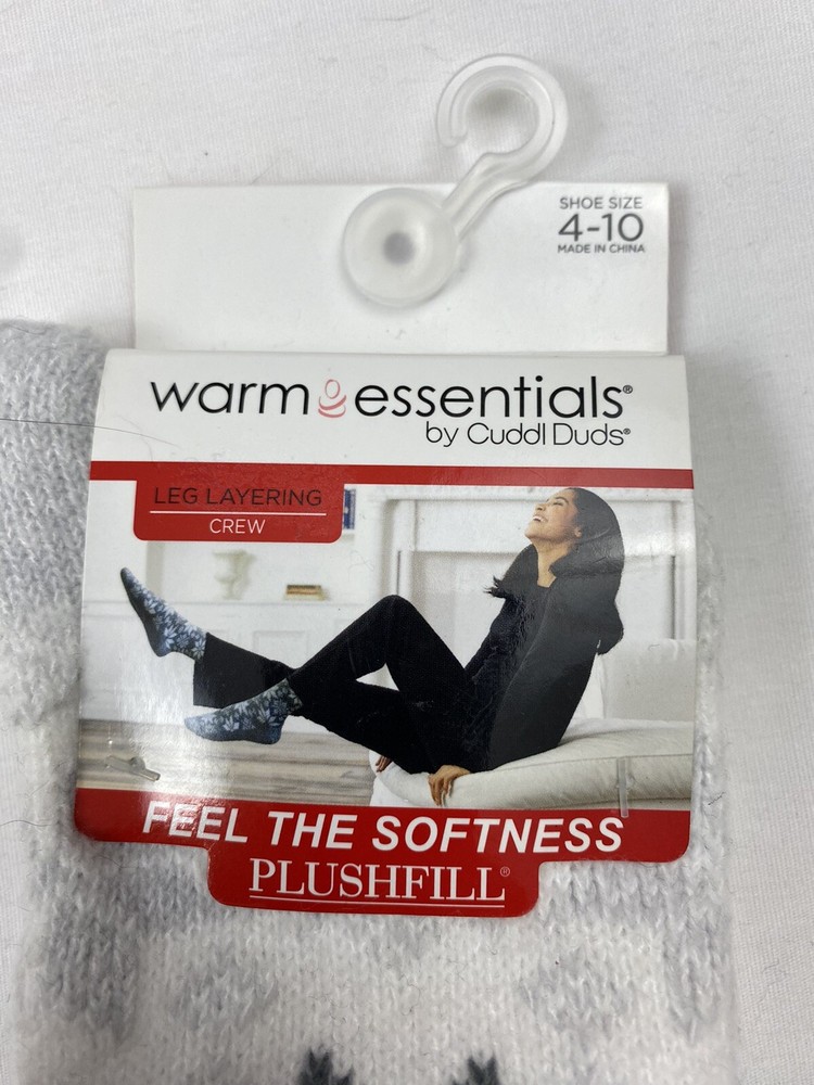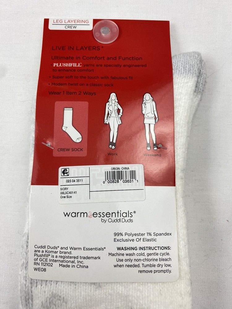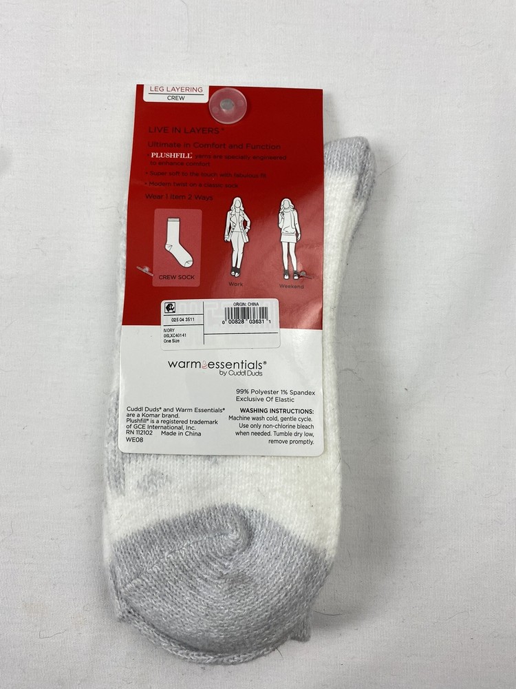Cuddl Duds Warm Essentials Womens Socks 4-10 Snowflake Crew Twisted Ribbed Ivory 1 pair NEW on hang card Super soft feel with PLUSFILL yarn. 99% Polyester 1% Spandex Machine wash and dry Color : Ivory...