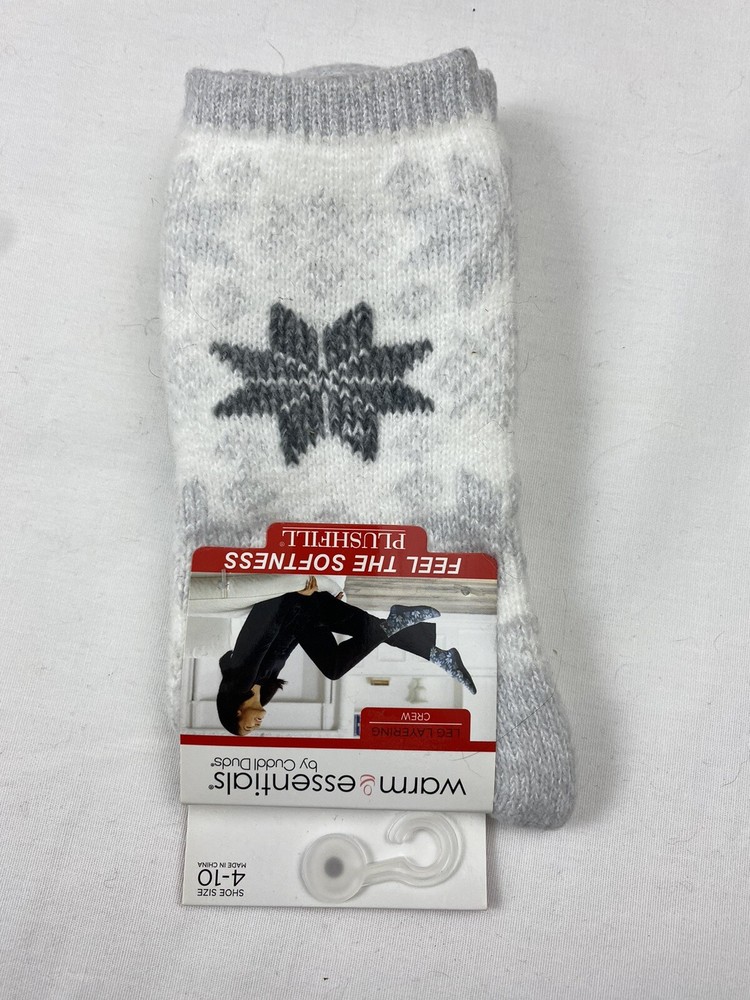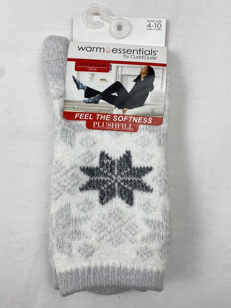 Cuddl Duds Warm Essentials Womens Socks 4-10 Snowflake Crew Twisted Ribbed Ivory 1 pair NEW on hang card Super soft feel with PLUSFILL yarn. 99% Polyester 1% Spandex Machine wash and dry Color : Ivory with very light gray Stock # 5519