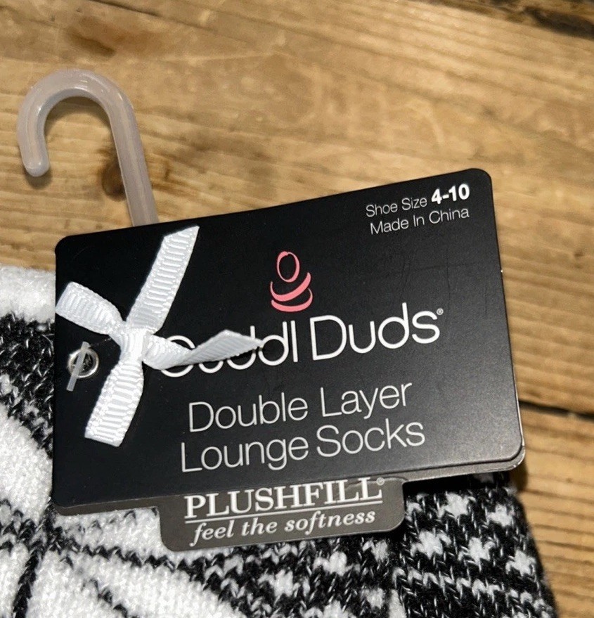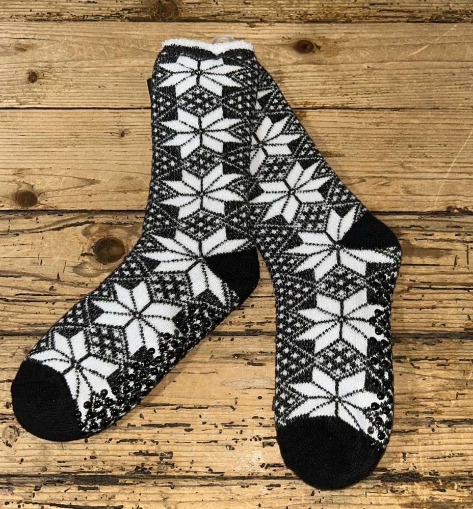 The Cuddl Duds Women's Size 4-10 Black/White Snowflakes Double Layer Lounge Socks are cozy and stylish, perfect for everyday wear. Made from a blend of polyester and spandex, these crew socks feature a charming snowflake pattern in black and white. With a plush fill for added warmth, these machine washable socks are ideal for all seasons, making them a comfortable choice for lounging or casual activities. The full toe design and crew style offer both comfort and style, while the brand's reputation for quality ensures a durable and enjoyable product. See pictures for exact measurements MW