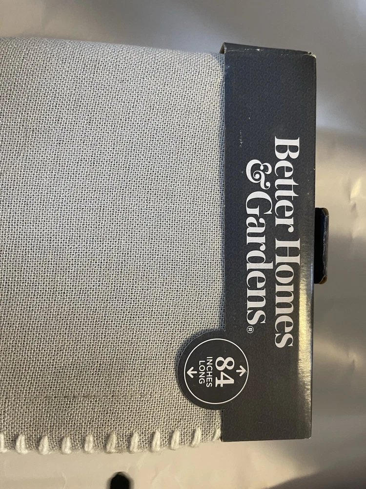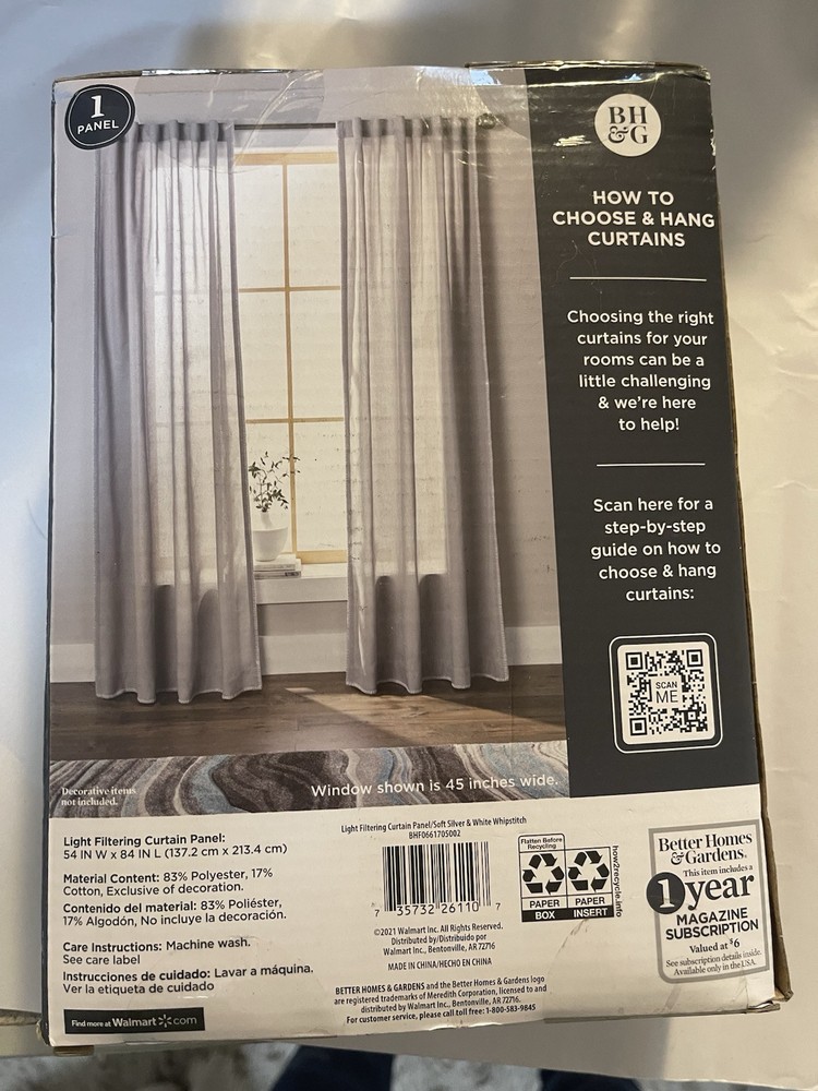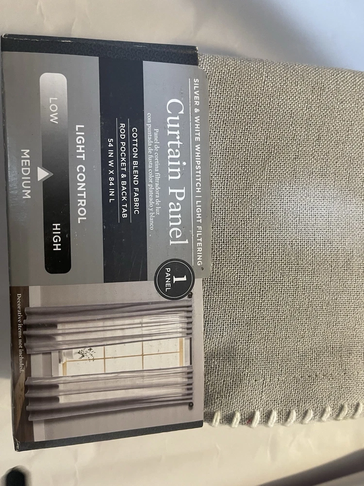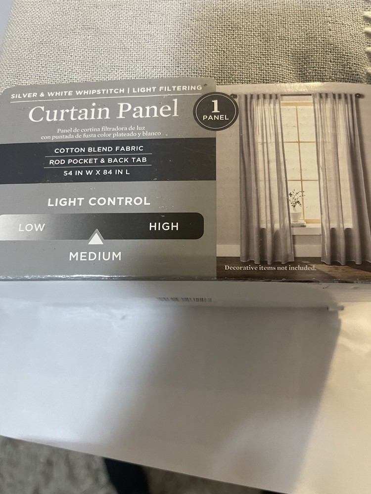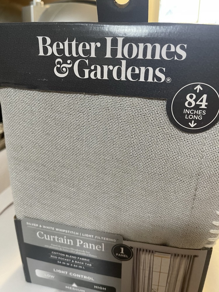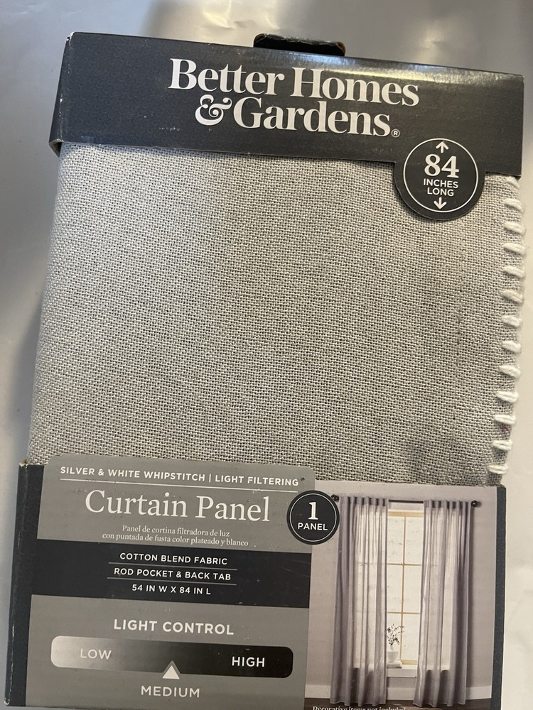 Never opened light grey cotton blend, medium light control. White trim stitch on edges 84” long One panel per pack (?) don’t know why they sold one side panel only in a pkg, but they were TOO SHEER for what I needed Better Homes and Garden