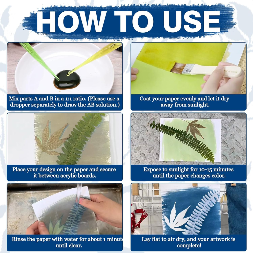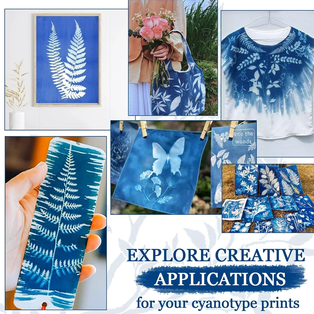 【Enjoy DIY Fun】Brush the cyanotype kit onto the paper, wait for it to dry, and place it on plants, flowers, or other objects. Then use the acrylic board to press and place it in sunlight. Rinse the paper with water and let it dry, then enjoy stunning prints 【Applicable to All Kinds of Materials】Cyanotype chemicals are suitable for natural fibers such as cotton cloth, canvas, wood, cotton, silk, and linen, allowing you to create custom artwork, home decor, or even textile designs 【Educational and Fun】Our sun printing kit is great for schools and art classes to teach new skills. Engage students in hands-on experiences in art and science, exploring the principles of light through fun printing experiments 【Create Beautiful Artworks】You can create unique cyanotype prints by using a variety of natural objects, like flowers, leaves, and more. The bookmarks, with decorative tassels, are also great for personal use or as gifts 【Complete Cyanotype Fabric Set】Cyanotype liquid contains everything you need for sunray printing, including liquid solutions, droppers, paint dish, and brush, as essential tools Product Description