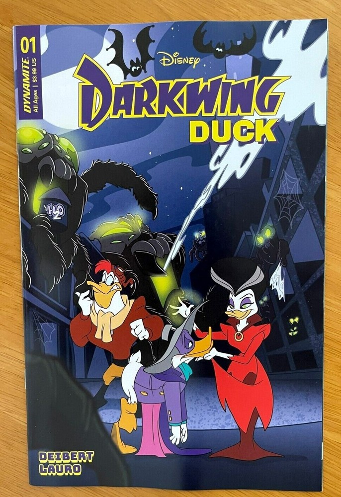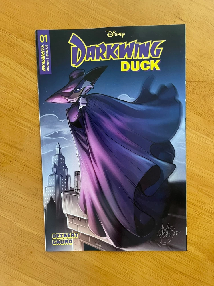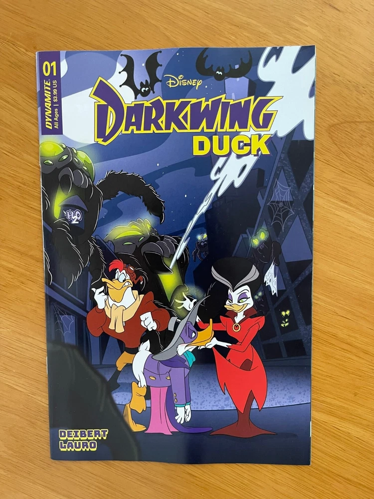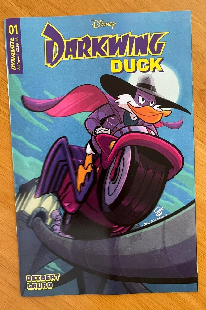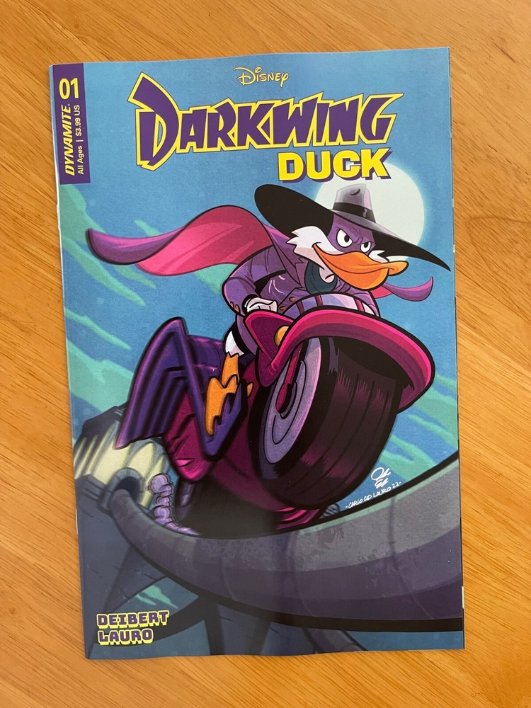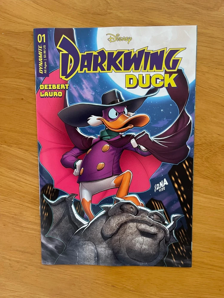 DARKWING DUCK #1 CVR A, B, C, D, E, F - Choose from Drop Down - Add all items to cart to combine DYNAMITE NM Condition / New / 1st Print / Ships in bags and boards He is the terror that flaps in the night...He is the ferocious fowl who plucks the evil eye from the face of foul play...He is Darkwing Duck! Alongside his trusty sidekick Lauchpad McQuack, Darkwing hyper-vigilantly defends St. Canard from the dastardly, devilish demons who would wage wanton war! By night, our caped defender lurks in the shadows, striking fear (and maybe confusion?) in the heart of the criminal underworld...but by day, no one suspects that Darkwing is also mild-mannered Drake Mallard, a well-meaning father to his adorable adopted daughter, Gosalyn! Can Darkwing successfully navigate his two separate lives, all while looking incredibly cool and impossibly handsome? (Hint: Probably not, but...) You'll have to read to find out! Ships 1st class mail in a Gemini comic box within 1 business day of payment.