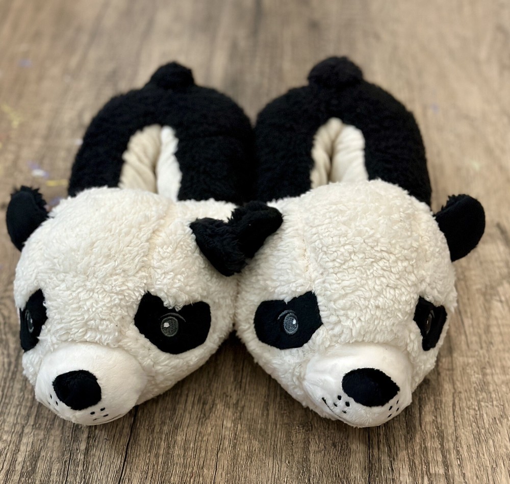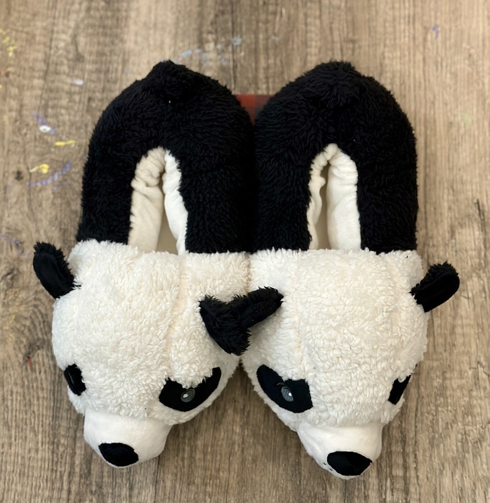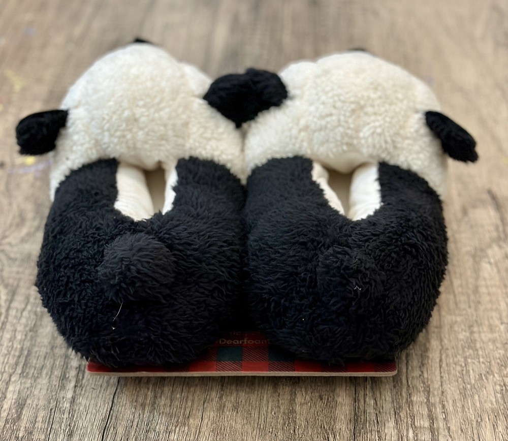 The "DEARFOAMS COZY COMFORT PANDA SLIPPERS" are a pair of cute and cozy slip-on slippers designed for unisex kids in size 4. They feature a black and white Panda Bear stuff toys, giving them a playful and adorable look. These slippers are manufactured in 2024 and are made of blended fabric with terry cloth and faux fur insoles for comfort. The outsole is made of rubber, suitable for leisure activities during the winter season. Perfect for keeping little feet warm and stylish at home.
