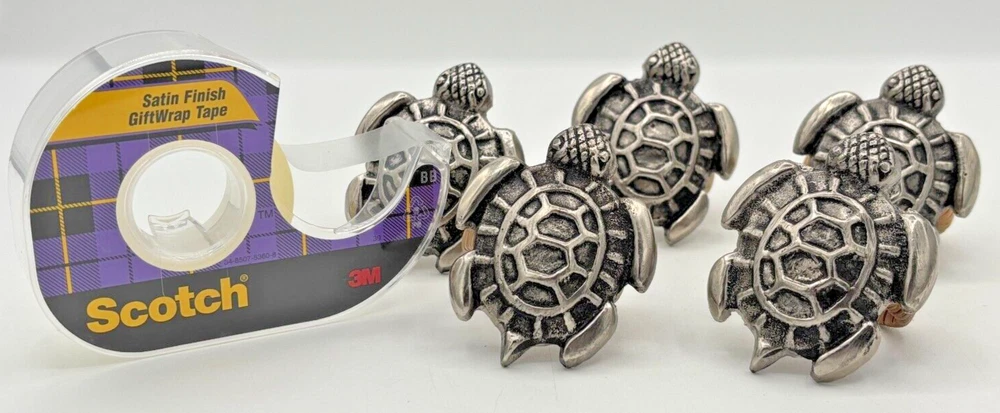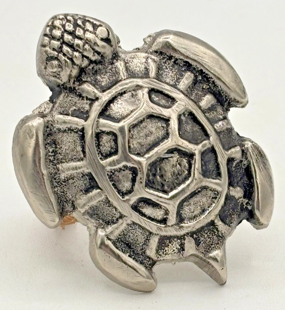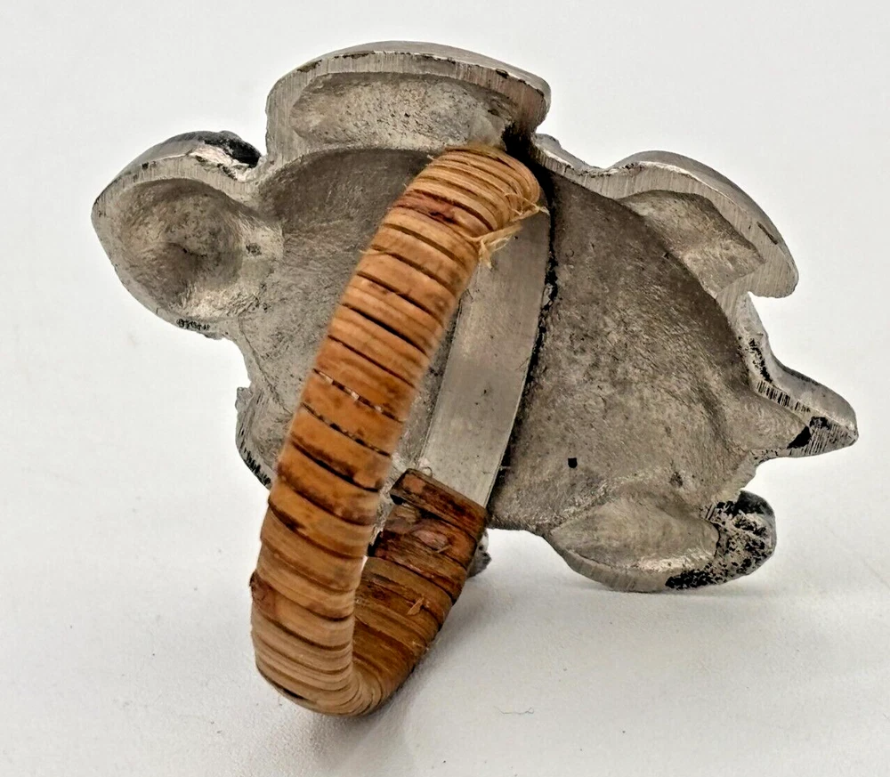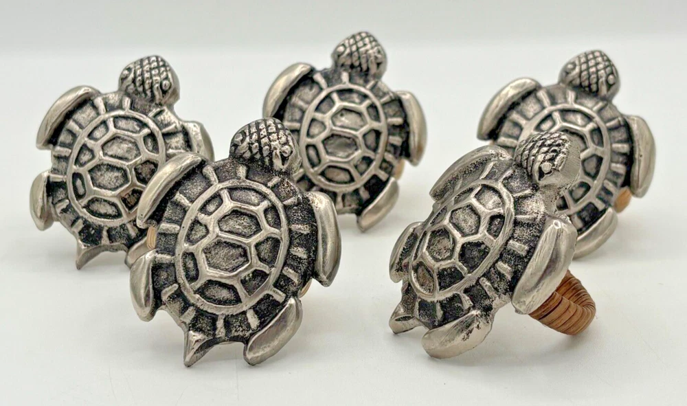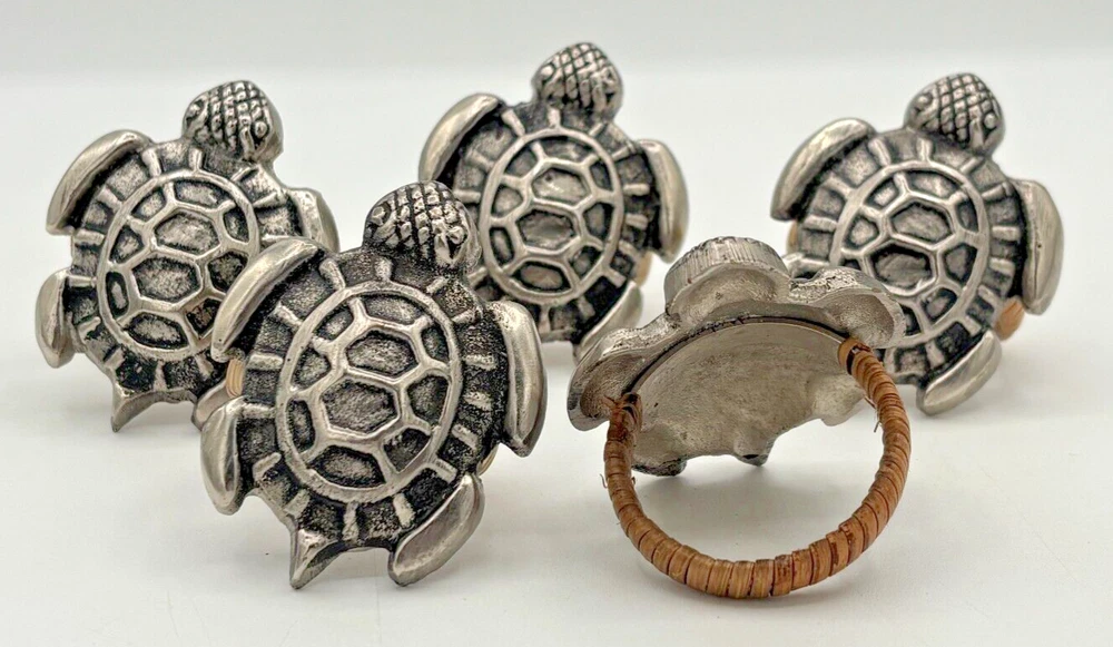 DII Design Imports Beach Sea Turtle Napkin Holder Rings Cast Brass Metal 5-Piece Condition: Pre-owned in excellent condition. Discontinued item from DII Design Imports. Beautiful cast brass with antique silver finish, wrapped with natural fiber. Please note that a hair or two from the fiber wrap are coming a little loose. Nothing crazy, just the nature of the fiber wrap. Please see all photos for condition. Measures about 2" in height by 2.75" width. Fast & Safe Shipping