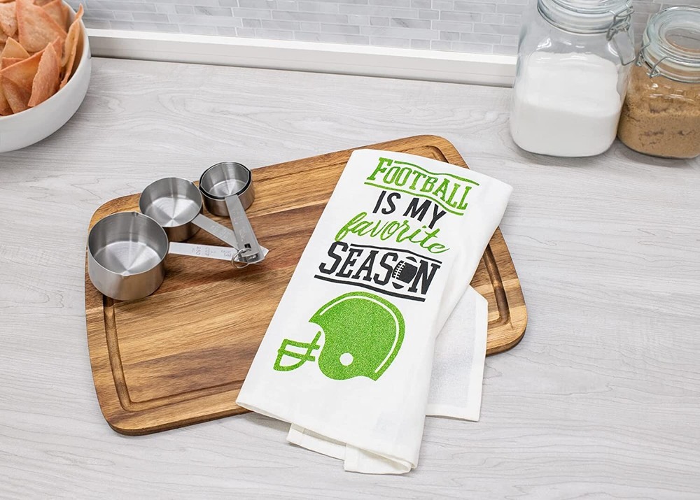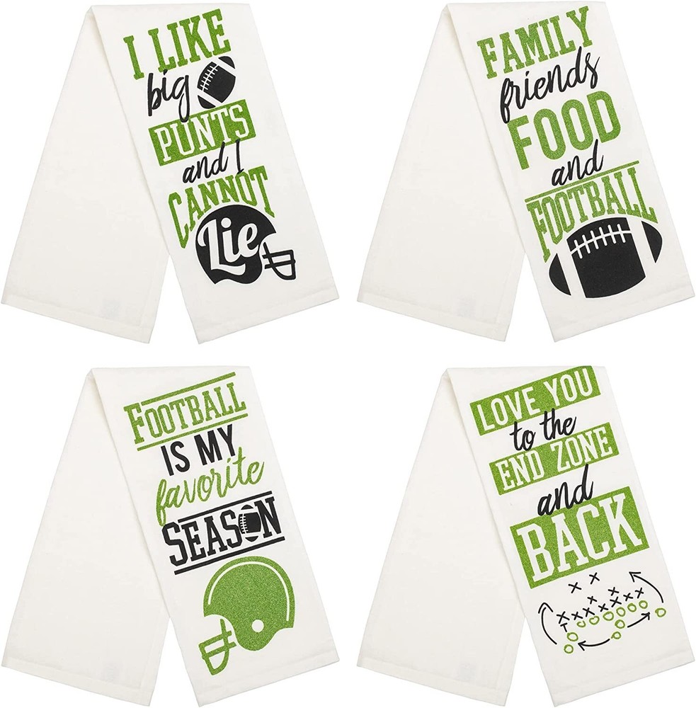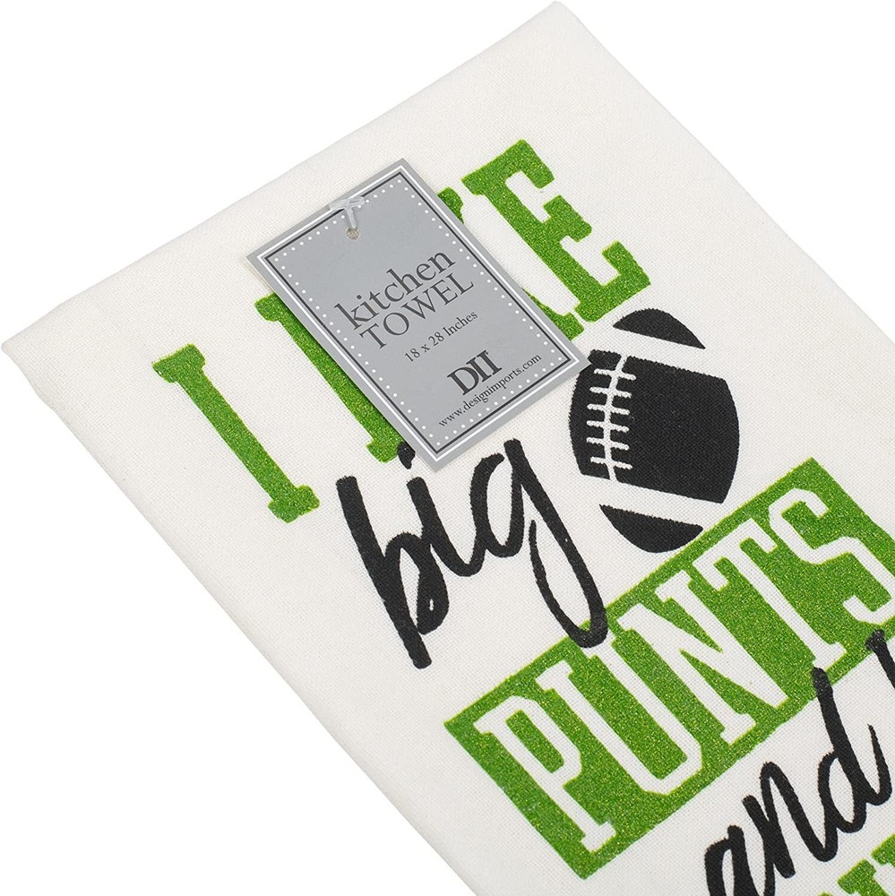 *** * * * * **** PLEASE NOTE***** ****** DII Design Imports SET OF 4 Game Day Dish Towels with a Little Bit of Sparkle - Football Theme - glitter will not transfer - Makes a Great Hostess Gift for Super Bowl Cotton Dish Towel Hanging Loop Measures: 18 x 28 inches Condition: Brand New with Tags