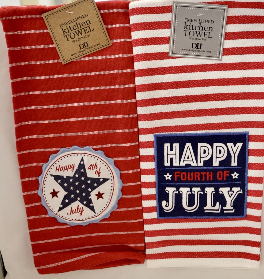 *** * * * DII Design Imports SET OF 2 Embellished Dish Towels - Patriotic Theme - in Patriotic Colors Cotton Dish Towel Hanging Loop Measures: 18 x 28 inches Condition: Brand New with Tags