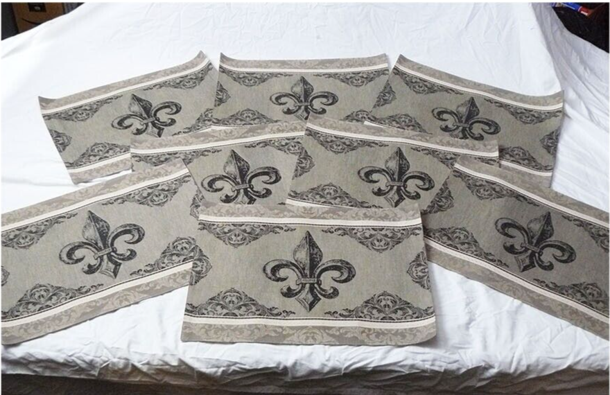 DII Design Imports Fleur de Lis placemat set of 8, excellent used condition Very rare and hard to find pattern, possibly discontinued through Design Imports. One owner set, used only a couple of times then stored in a dry cabinet, looks as if in new condition. Stored rolled so there are no creases, will be shipped rolled. Beautiful design in tans, cream and black. 100% woven cotton, cold washable, lay flat to dry. Each placemat measures about 19 inches wide and 14 inches tall. With woven fibers occasionally one color will peek through the weave especially if there is a 'bump' in the fiber. This occurs during manufacturing and may look like speckles or spots, but it is just the fiber. There are some of these minor 'speckles' occasionally on the placemats, they are not defects or stains. First photo shows the placemats I have, second is a stock photo for detail. Thanks and enjoy Payment is appreciated within three days, after one week of non-payment ebay will be notified and a case will be opened unless an arrangement is made between us. Clothing: all clothing will arrive clean and will be inspected for flaws prior to shipping. Dry-clean only items will not be cleaned ahead of time. Smoke Free home and cat friendly: We have cats but try to keep them away from sale items, severe allergies should know that there may be a stray hair though . Recycle: To help reduce and recycle I reuse mailing bags and boxes, I take care that they are in fully functioning, usable and in clean condition. Refunds and Returns: If I have made a mistake in a listing I will offer reimbursement or return, otherwise strict no-return policy due to the time I put into each listing with accurate measurements and photos, but if you are unhappy with a purchase let me know and we can see if we can work something out. Postage is a non-refundable charge once the item ships. Shipping: I try to ship within 2 days of payment but sometimes I can ship faster if you need me to. Larger items may take longer but never more than 4 days after payment. The shipping charges are calculated by the USPS and are beyond my control. If the price seems high I can check for a lower rate but I can't guarantee I'll find one, and I always try to combine and reduce shipping on multiple purchases. International: Due to the high cost of global shipping and longer handling times the international buyer assumes all risk for loss or damage once the package leaves the US. Tracking is always provided but international shipping does not always provide door-to-door tracking. Any delays, damage, loss or additional customs fees are beyond my control and the international buyer must assume this risk fully, additionally international shipping charges are non-refundable once the package ships. Be nice to your ebayer: I work hard to provide sought after items at good prices, but sometimes things happen. Before leaving negative or even neutral feedback please talk with me to see if we can work out the problem. Also remember that this is my business and part of my family's livelihood, please don't slam my business for something beyond my control. And before you leave anyone negative or neutral feedback, or anything less than '5 stars' find out how ebay uses these ratings: When you rate an eBay business with a 1 or a 2 star rating in any category this mark stays on the sellers record and is calculated into the performance rating for an entire year. A business with too many of these marks gets their items listed lower in search results which has a direct affect on sales, they do not get to participate in sales promotions, they sometimes have selling restrictions put into place for their business and occasionally their funds are held. The worst part is once the low rating is received there is really nothing a seller can do to correct upon or remove those low scores. Thank you and keep checking back for new items.