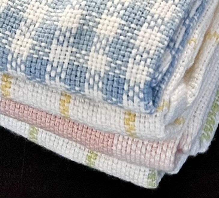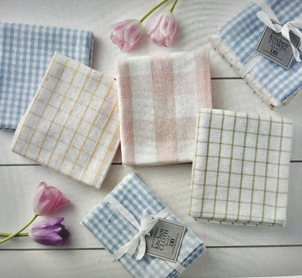 NWT DII (Design Imports) "Garden Plaids" Dishcloth and Dishtowel Set - 4 of each: blue, peach, yellow, green. Heavyweight, ultra absorbent - Dishcloth: 13 x 13" - Dishtowel: 18 x 28" 100% Cotton - Care Instructions: Machine wash cold separately - Gentle cycle - Tumble dry low - Low iron as needed (Dishcloths available separately in another listing)