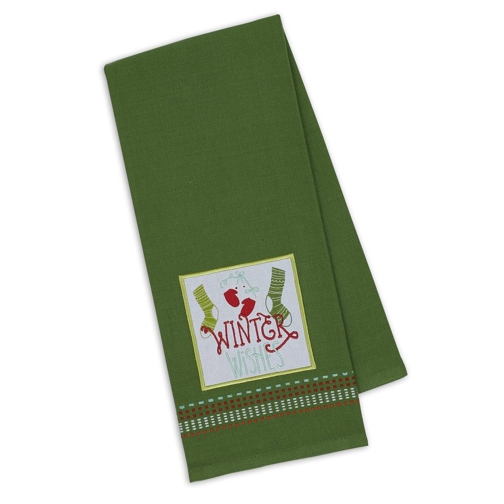 Highlights: Green dish towel with applique of mittens and stockings Each towel measures 18 inches by 28 inches Towel features the sentiment 'Winter Wishes' Colorful and functional towels that are a perfect addition to any kitchen or bathroom! Cleaning instructions: machine wash cold separately, gentle cycle, tumble dry low Description: Features green towel with decorative mittens and stockings. Towel features the sentiment 'Winter Wishes'. Incorporating the hottest colors and themes, DII brings you a fresh, innovative line of kitchen products, tabletop items, gifts, and home décor for every season, every holiday, and everyone. Loop for displaying when not in use. Returns: Free 60 Day Returns