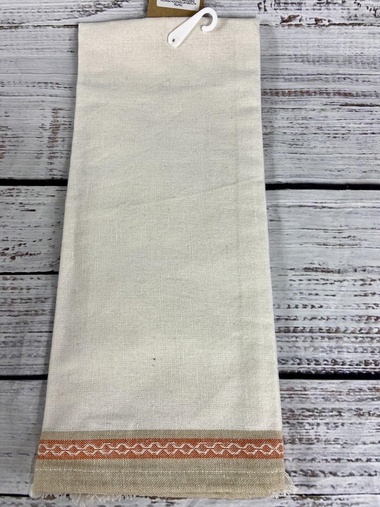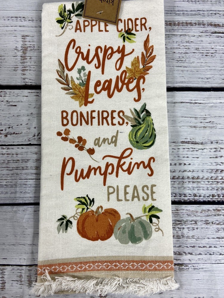 Add warmth and style to your home this fall with this fringed tea towel by Design Imports. Made of 100% cotton this towel is perfect for kitchen or dining. Measuring 18 by 28, the towel features green and orange pumpkins and leaves with tan and orange trim. The phrase in burnt orange says “Apple cider. Crispy leaves. Bonfires and pumpkins please..” Would make a great gift for Halloween or Thanksgiving or Autumn. Note: There are 3 different designs available. Visit our listings page to see the other designs. A 10% discount and combined shipping will be applied to purchases of two or more.